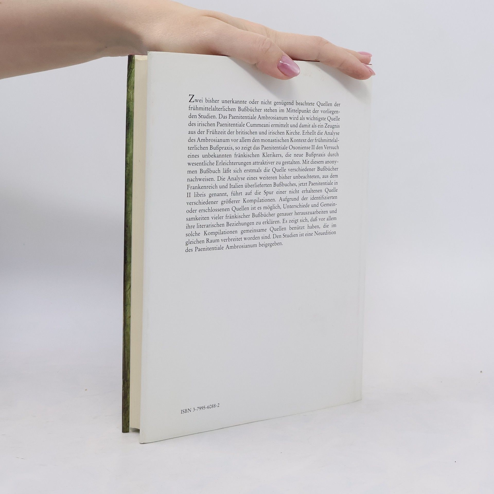 Zwei anonym überlieferte Bußbücher werden erstmals als Quellen verschiedener frühmittelalterlicher Paenitentialia ermittelt: das Paenitentiale Ambrosianum, das im Anhang kritisch ediert ist, als Quelle des irischen Paenitentiale Cummeani (7. Jahrhundert), das Paenitentiale Oxoniense II als Quelle des Paenitentiale Ps.-Romanum Bischof Halitgars von Cambrai († 831) und anderer fränkischer Bußbücher. Ausgehend von der Quellenrezeption, wird die Verwandtschaft einer Gruppe von Bußbüchern näher bestimmt, die vor allem aus Italien und Nordostfrankreich überliefert ist. In diesem Zusammenhang wird eine weitere, bisher nicht genauer untersuchte Kompilation, jetzt Paenitentiale in duobus libris genannt, analysiert und charakterisiert.