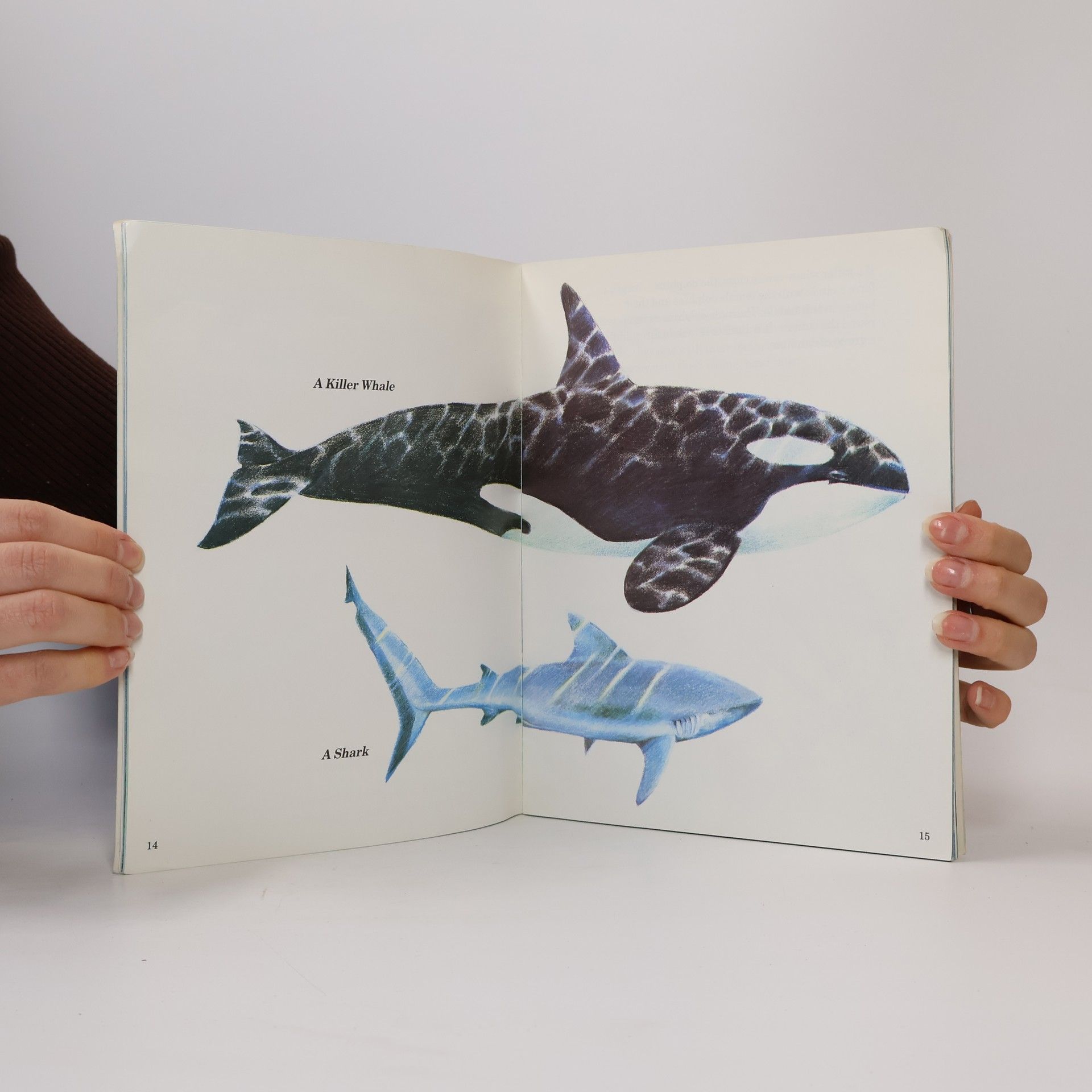 Discusses how dolphins breath, eat, see, hear, sleep, live together and take care of each other, and interact with humans