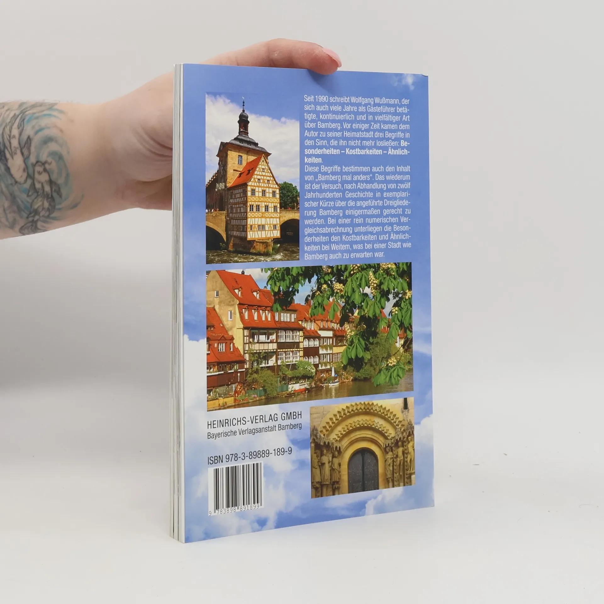 Seit 1990 schreibt Wolfgang Wußmann, der sich auch viele Jahre als Gästeführer betätigte, kontinuierlich und in vielfältiger Art über Bamberg. Vor einiger Zeit kamen dem Autor zu seiner Heimatstadt drei Begriffe in den Sinn, die ihn nicht mehr losließen: Besonderheiten - Kostbarkeiten - Ähnlichkeiten Diese Begriffe bestimmen auch den Inhalt von „Bamberg mal anders“. Das wiederum ist der Versuch, nach Abhandlung von zwölf Jahrhunderten Geschichte in exemplarischer Kürze über die angeführte Dreigliederung Bamberg einigermaßen gerecht zu werden. Bei einer rein numerischen Vergleichsabrechnung unterliegen die Besonderheiten den Kostbarkeiten und Ähnlichkeiten bei Weitem, was bei einer Stadt wie Bamberg auch zu erwarten war.