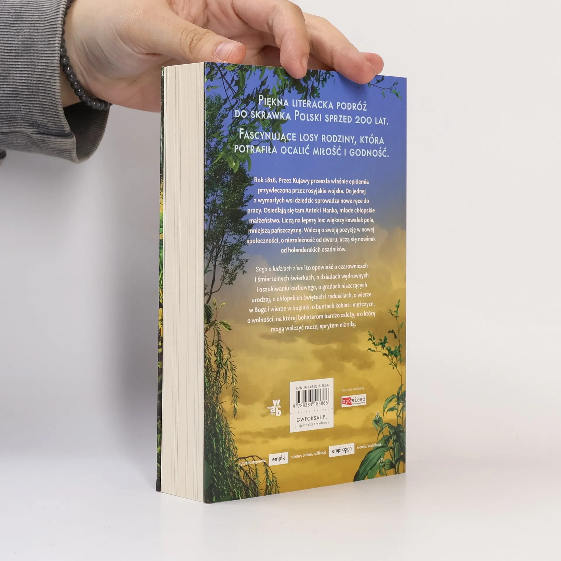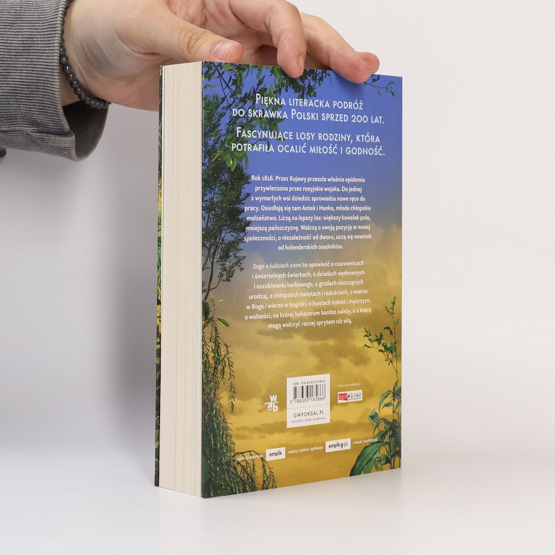 Piękna literacka podróż do skrawka Polski sprzed 200 lat. Fascynujące losy rodziny, która potrafiła ocalić miłość i godność.Anna Fryczkowska, zdobywczyni prestiżowych nagród literackich, powraca z epicką, ponadczasową i przepięknie napisaną opowieścią o tym, co w życiu najważniejsze. Saga o ludziach ziemi przedstawia losy rodziny wpisane zarówno w rytm przyrody, jak i w wydarzenia historyczne oraz przemiany społeczne w XIX wieku. Inspiracją dla autorki były unikatowe pamiętniki jej dziadka i ojca.Rok 1816. Przez Kujawy przeszła właśnie epidemia przywleczona przez rosyjskie wojska. Do jednej z wymarłych wsi dziedzic sprowadza nowe ręce do pracy. Osiedlają się tam Antek i Hanka, młode chłopskie małżeństwo. Liczą na lepszy los: większy kawałek pola, mniejszą pańszczyznę. Walczą o swoją pozycję w nowej społeczności, o niezależność od dworu, uczą się nowinek od holenderskich osadników.Saga o ludziach ziemi to opowieść o czarownicach i śmiertelnych świerkach, o dziadach wędrownych i oszukiwaniu karbowego, o gradach niszczących urodzaj, o chłopskich świętach i radościach, o wierze w Boga i wierze w boginki, o buntach kobiet i mężczyzn, o wolności, na której bohaterom bardzo zależy, a o którą mogą walczyć raczej sprytem niż siłą.
