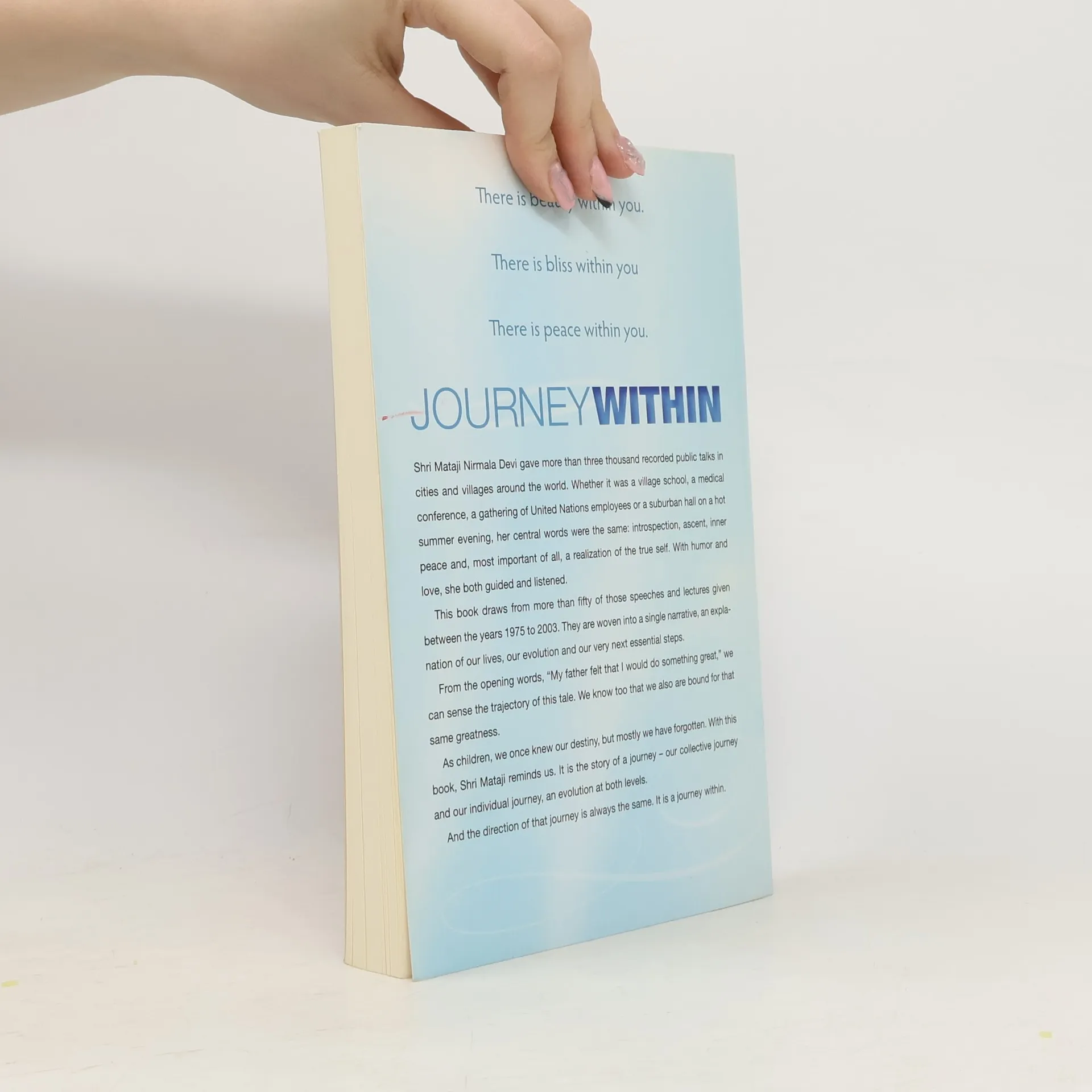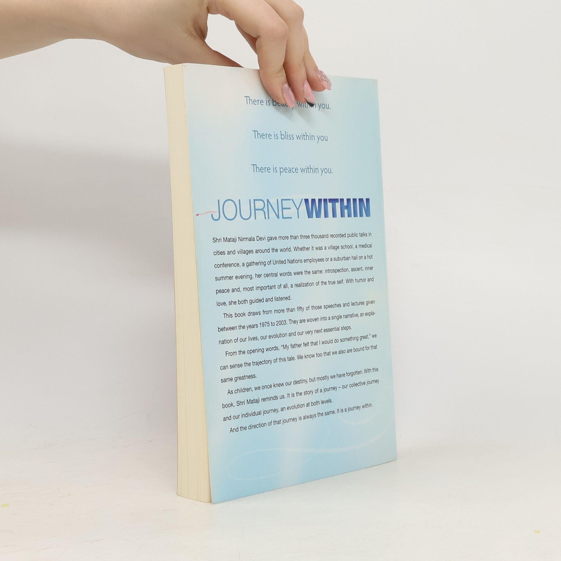 JOURNEY WITHIN is the story of our spiritual ascent, both as individuals and collectively. With equal parts instruction and inspiration, the book beautifully describes how we have gotten where we are today and our essential next steps. Shri Mataji Nirmala Devi gave more than 3000 recorded talks all around the world. Whether it was a village school, a medical conference, a gathering of UN employees or a suburban hall on a hot summer evening, her central words were the same: introspection, ascent, inner peace and – most important of all – a realization of our true self. With humour and love, she both guided and listened. From the opening words, “My father felt that I would do something great,” we can sense the trajectory of this tale. And we know too that we are bound for that same greatness.
