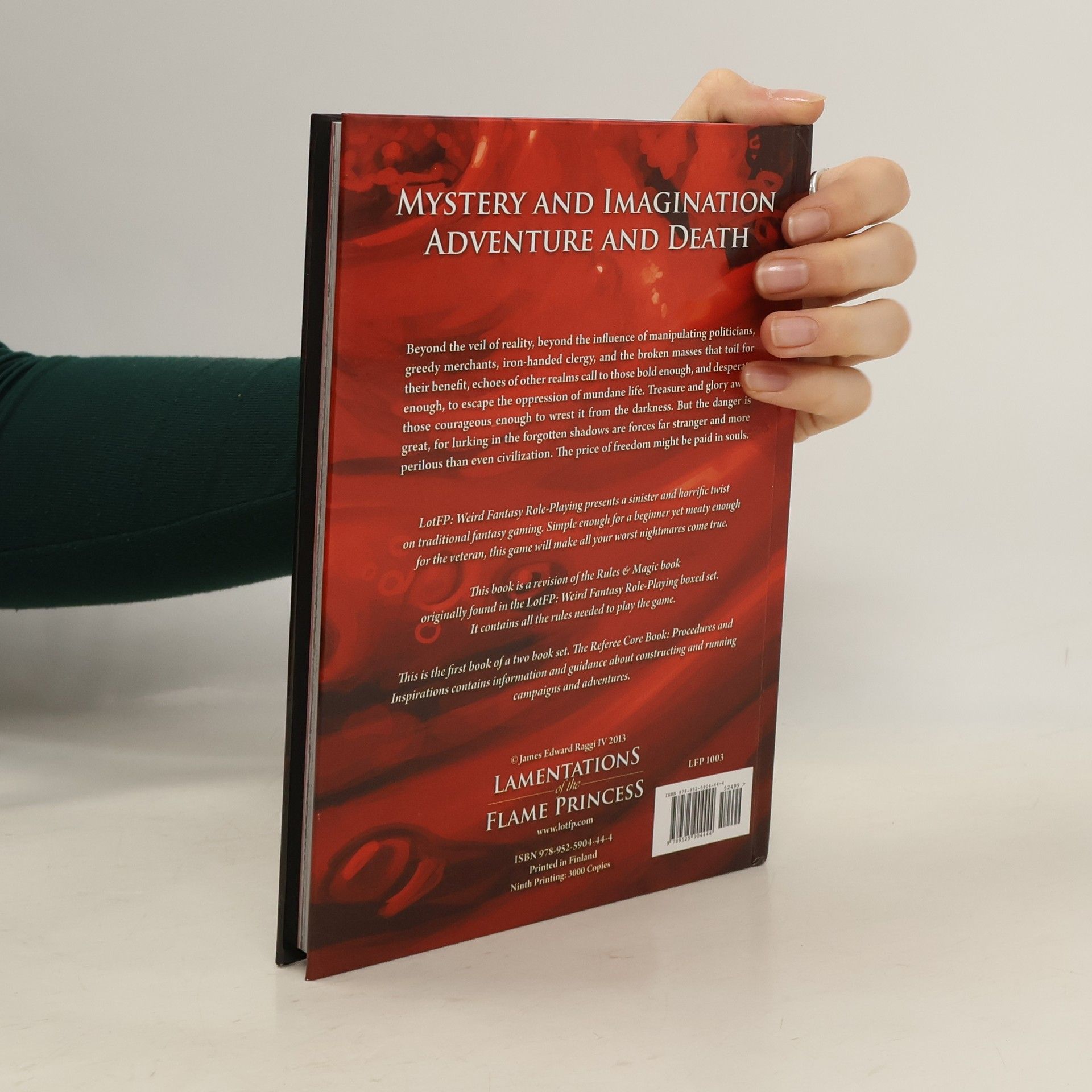 Beyond the veil of reality, beyond the influence of manipulating politicians, greedy merchants, iron-handed clergy, and the broken masses that toil for their benefi?t, echoes of other realms call to those bold enough, and desperate enough, to escape the oppression of mundane life. Treasure and glory await those courageous enough to wrest it from the darkness. But the danger is great, for lurking in the forgotten shadows are forces far stranger and more perilous than even civilization. The price of freedom might be paid in souls. LotFP: Weird Fantasy Role-Playing presents a sinister and horrific twist on traditional fantasy gaming. Simple enough for a beginner yet meaty enough for the veteran, this game will make all your worst nightmares come true. This book is a revision of the Rules & Magic book originally found in the LotFP: Weird Fantasy Role-Playing boxed set. It contains all the rules needed to play the game. (Explicit Content: Recommended for ages 18+)