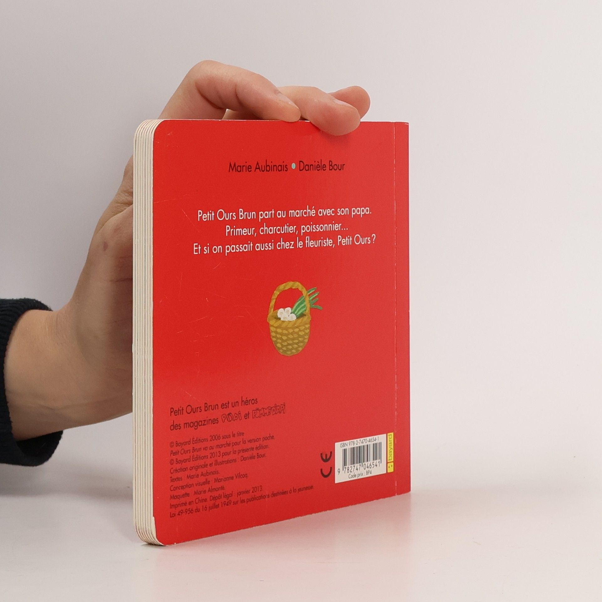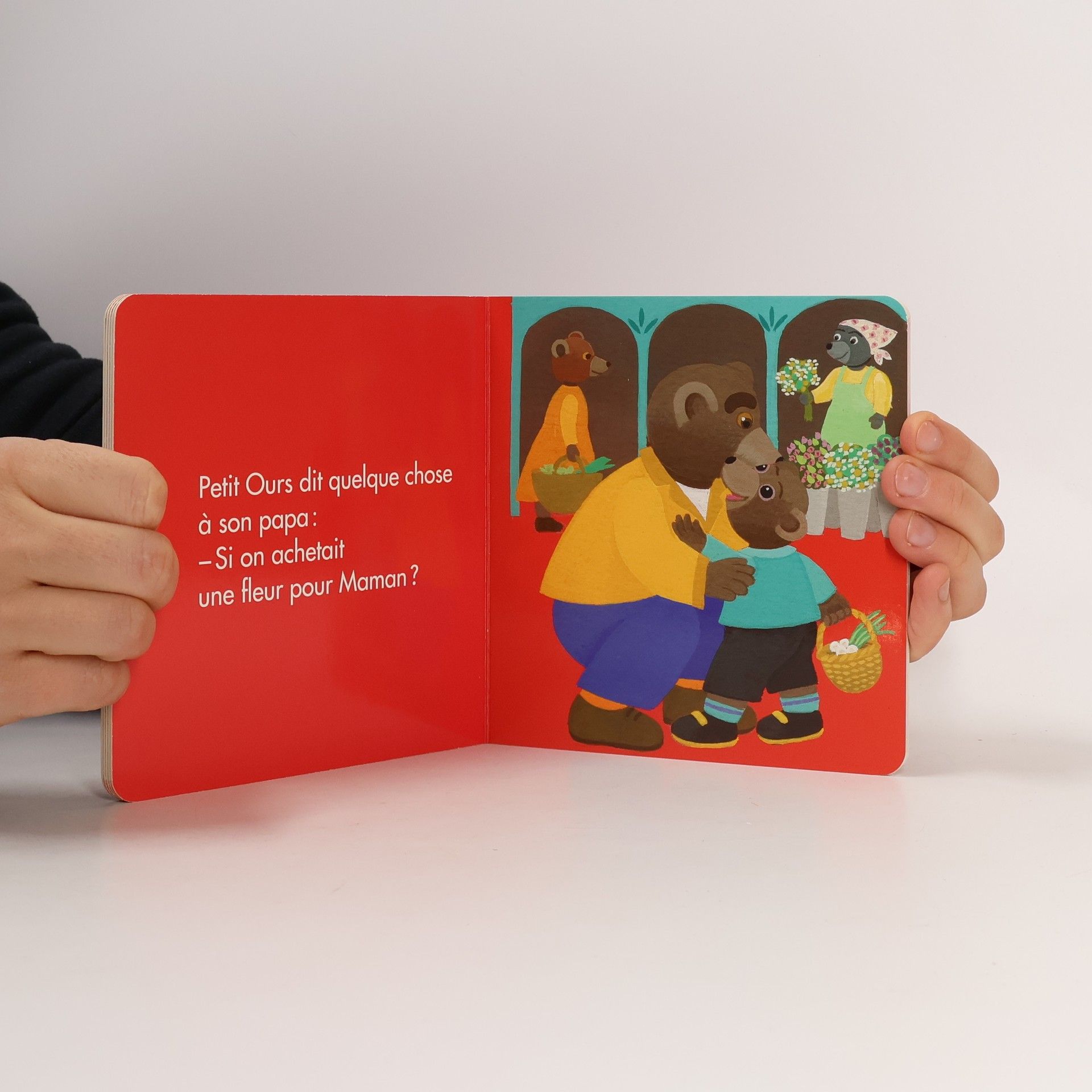 Petit Ours Brun part au marché avec son papa. Primeur, charcutier, poissonnier... Et si on passait aussi chez le fleuriste, Petit Ours?