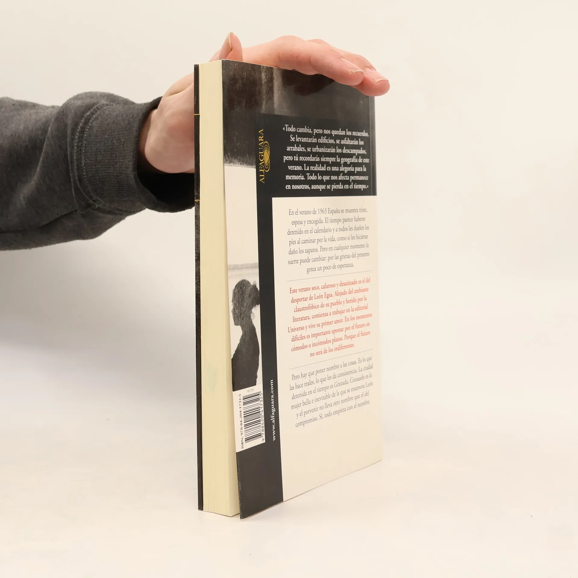 En el verano de 1963 España se muestra triste, espesa y encogida. El tiempo parece haberse detenido en el calendario y a todos les duelen los pies al caminar por la vida, como si les hicieran daño los zapatos. Pero en cualquier momento la suerte puede cambiar: por las grietas del presente gotea un poco de esperanza. Este verano seco, caluroso y desatinado es el del despertar de León Egea. Alejado del ambiente claustrofóbico de su pueblo y herido por la literatura, comienza a trabajar en la editorial Universo y vive su primer amor. En los momentos difíciles es importante apostar por el futuro en cómodos o incómodos plazos. Porque el futuro no será de los indiferentes. Pero hay que poner nombre a las cosas. Es lo que las hace reales, lo que les da consistencia. La ciudad detenida en el tiempo es Granada, Consuelo es la mujer bella e inevitable de la que se enamora León y el porvenir no lleva otro nombre que el del compromiso. Sí, todo empieza con el nombre.