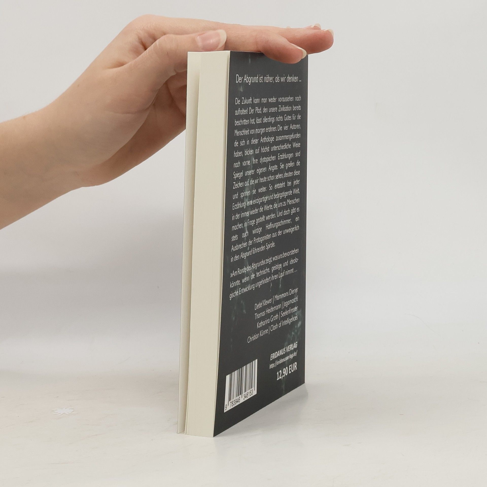 Der Abgrund ist näher, als wir denken... Die Zukunft kann man weder voraussehen noch aufhalten! Der Pfad, den unsere Zivilisation bereits beschritten hat, lässt allerdings nichts Gutes für die Menschheit von morgen erahnen. Die vier Autoren, die sich in dieser Anthologie zusammengefunden haben, blicken auf höchst unterschiedliche Weise nach vorne. Ihre dystopischen Erzählungen sind Spiegel unserer eigenen Ängste. Sie greifen die Zeichen auf, die wir heute schon sehen, deuten diese und spinnen sie weiter. So entsteht bei jeder Erzählung eine einzigartige und beängstigende Welt, in der immer wieder die Werte, die uns zu Menschen machen, in Frage gestellt werden. Und doch gibt es stets auch winzige Hoffnungsschimmer, ein Ausbrechen der Protagonisten aus der unweigerlich in den Abgrund führenden Spirale. „Am Rande des Abgrunds“ zeigt, was uns bevorstehen könnte, wenn die technische, geistige und ideologische Entwicklung ungehindert ihren Lauf nimmt …