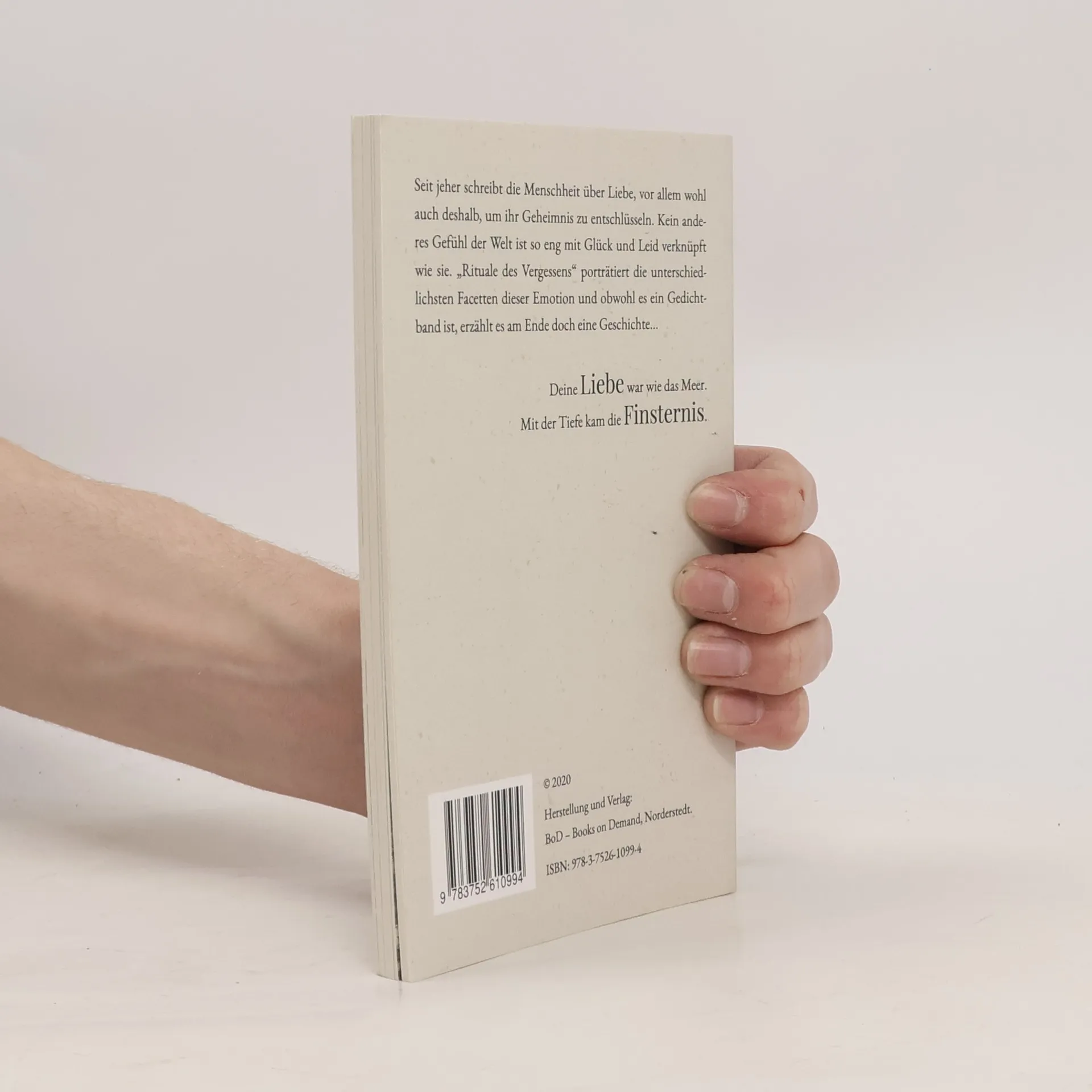 Seit jeher schreibt die Menschheit über Liebe, vor allem wohl auch deshalb, um ihr Geheimnis zu entschlüsseln. Kein anderes Gefühl der Welt ist so eng mit Glück und Leid verknüpft wie sie. RITUALE DES VERGESSENS ist ein in fünf Kapitel gegliederter Liebeslyrikband, in dem die Leserschaft unterschiedliche Etappen zwischenmenschlicher Beziehungen durchläuft. Auf diese Weise wird das breite Farbspektrum der wahrscheinlich facettenreichsten Emotion von allen porträtiert und obwohl es ein Gedichtband ist, erzählt es am Ende doch eine Geschichte.