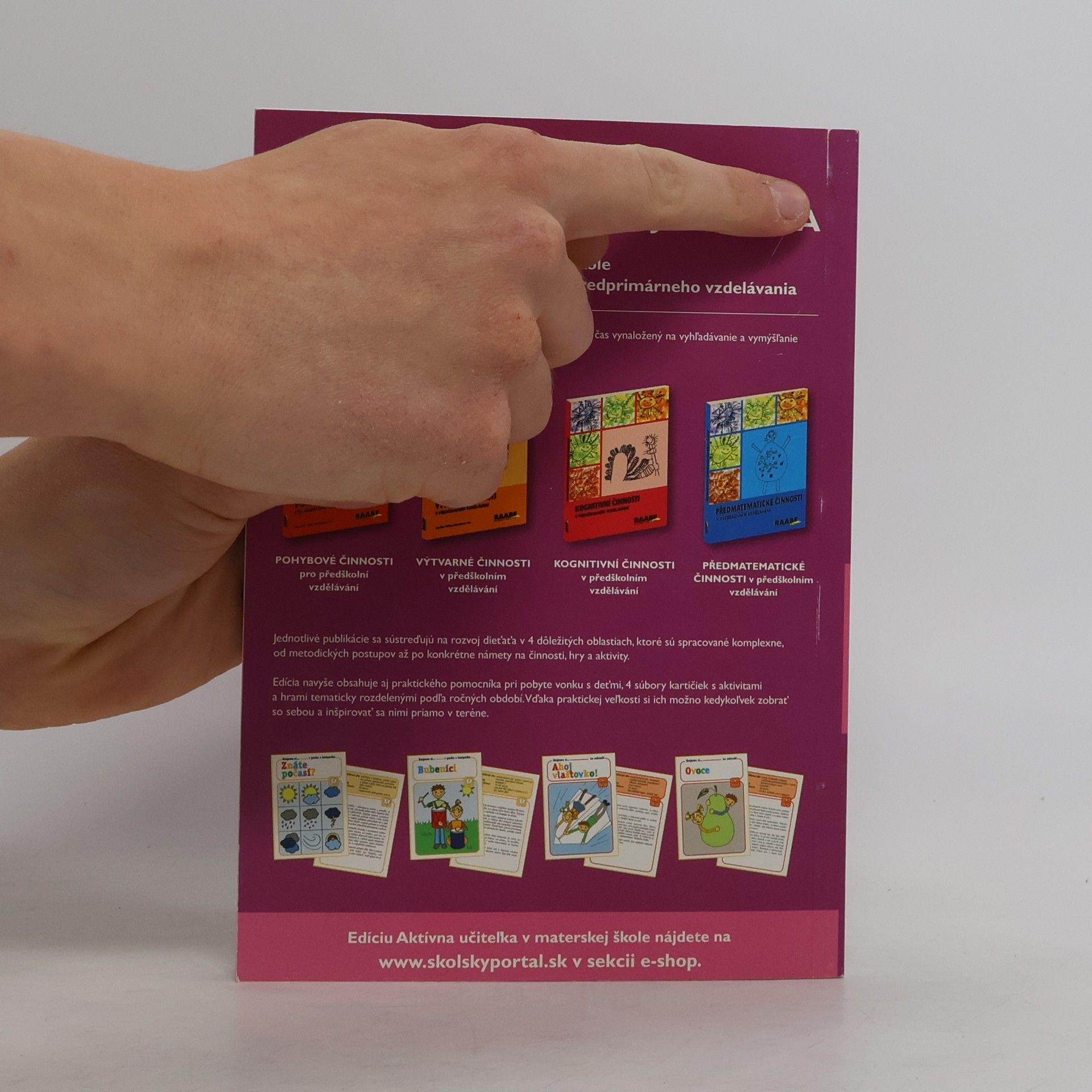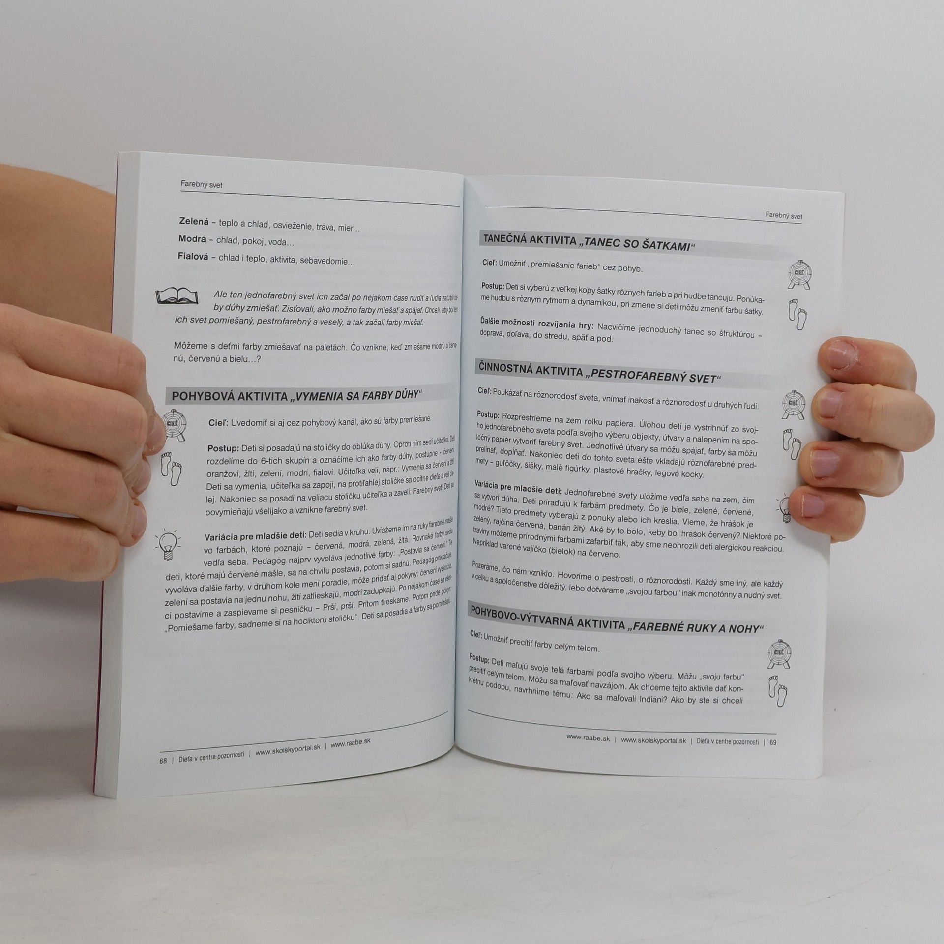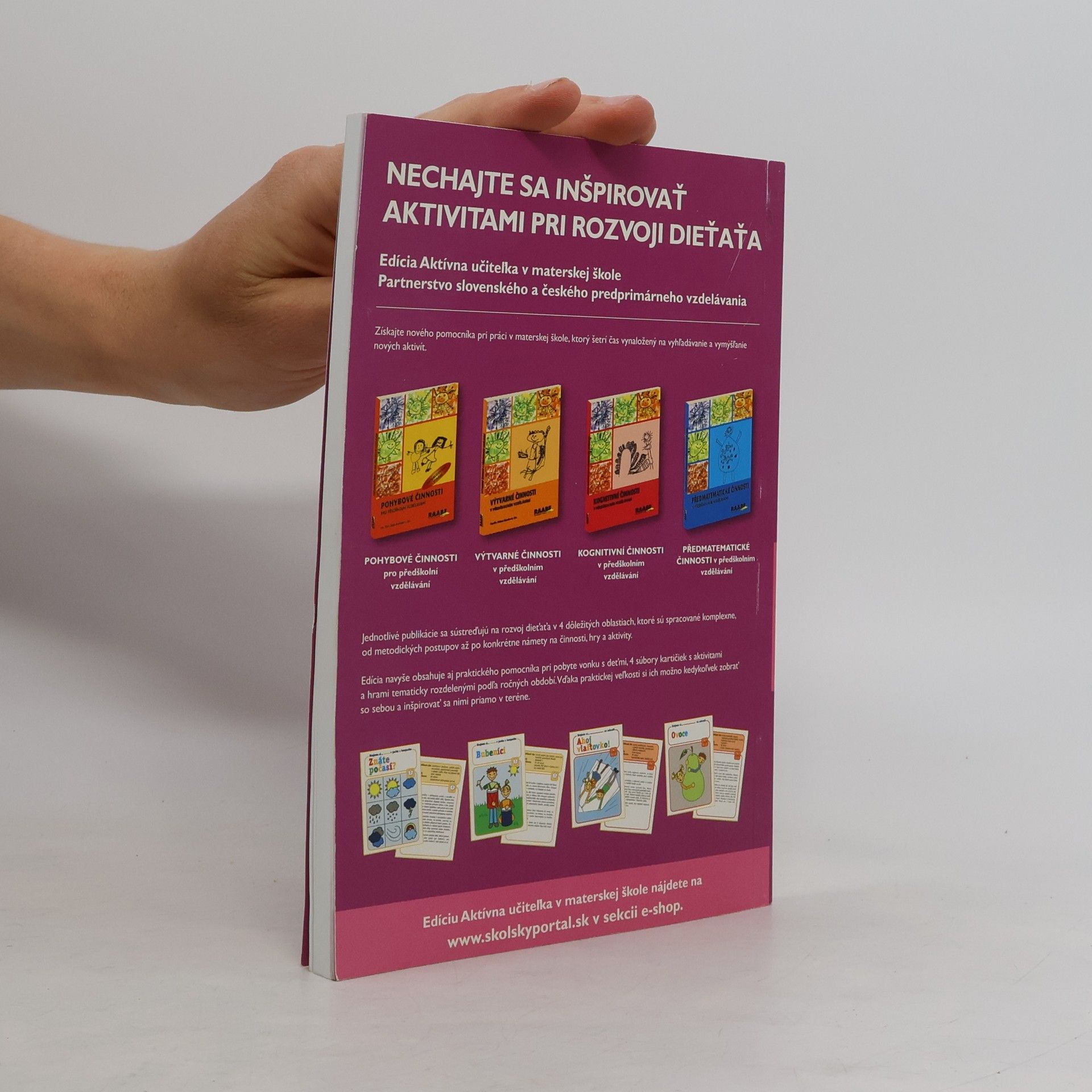 Tvorivé aktivity na rozvoj osobnosti dieťaťa, formovanie a upevňovanie vzťahov medzi učiteľom a deťmi Dielo rozvíja, upevňuje, utvára, formuje vzťahy medzi deťmi navzájom, ale ja medzi deťmi a pedagógmi, v ideálnom prípade aj rodičmi. Cieľom je aj utváranie osobnosti dieťaťa, sebapoznávanie, upevňovanie jeho sebavedomia, získavanie nových zručností a poznatkov, rozvoj jeho tvorivosti. Tvorivé aktivity predstavujú jednu z možností, ako vzťah učiteľ – dieťa – deti budovať. Pedagóg ich môže zaradiť do výchovno-vzdelávacieho procesu v materskej škole. Umožnia a aj potrebujú odkloniť sa od striktného plnenia učebných osnov, čím sa môžu stať atraktívnymi pre učiteľa aj pre dieťa. Je to platforma, kde učiteľ môže prirodzene deti spoznávať, dovoliť im spoznávať aj jeho a kde sa deti môžu spoznávať navzájom. V publikácii nájdete tvorivé aktivity, ktorých médiom je pohyb, výtvarný prejav a pracovné činnosti, niekedy doplnené hudobným a dramatickým prejavom. Tie sú v rámci jednej tvorivej aktivity integrované a vhodne sa dopĺňajú. Aby hneď od začiatku pritiahli pozornosť detí, uvádzame ich s príbehmi a rozprávkami, ktoré majú deti vniesť do deja, do témy. Príbeh či rozprávka potom sprevádza aktivitu počas celého jej trvania. Tvorí jednotnú líniu, na ktorej sa objavujú pohybové hry a cvičenia, výtvarné techniky a hry, detské činnosti.