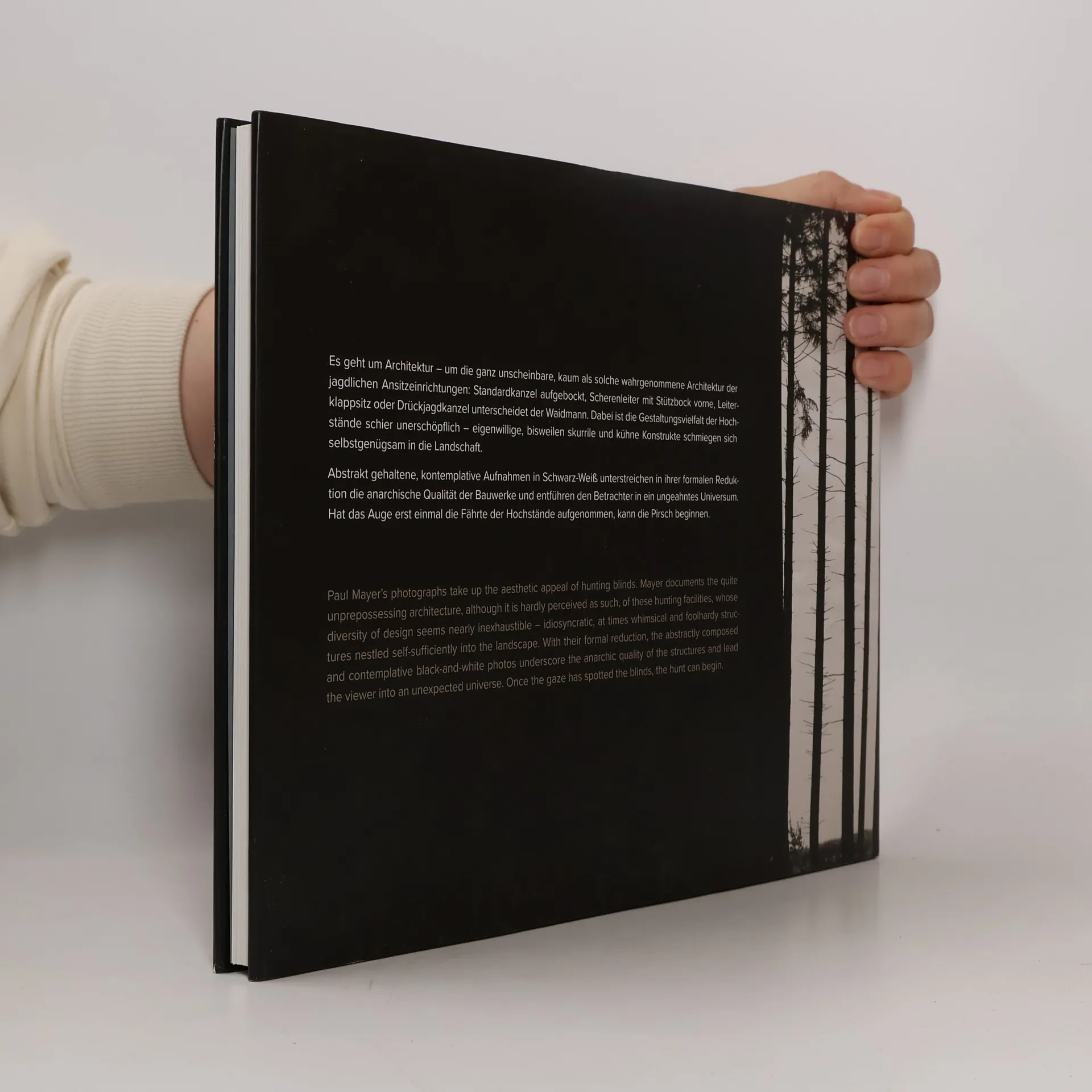 Paul Mayers Fotografien greifen den ästhetischen Reiz von Jägersitzen auf. Mayer dokumentiert die ganz unscheinbare, kaum als solche wahrgenommene Architektur der jagdlichen Ansitzeinrichtungen, deren Gestaltungsvielfalt schier unerschöpflich scheint – eigenwillige, bisweilen skurrile und waghalsige Bauwerke schmiegen sich selbstgenügsam in die Landschaft. Abstrakt gehaltene, kontemplative Aufnahmen in Schwarz-Weiß unterstreichen in ihrer formalen Reduktion die anarchische Qualität der Bauwerke und entführen den Betrachter in ein ungeahntes Universum. Hat das Auge erst einmal die Fährte der Hochstände aufgenommen, kann die Pirsch beginnen. Paul Mayer (*1965 in Erlangen) ist Diplom-Geograf (Schwerpunkt Klima-Geomorphologie & Waldökologie), Redakteur bei european pressphoto agency (epa) und Fotograf.