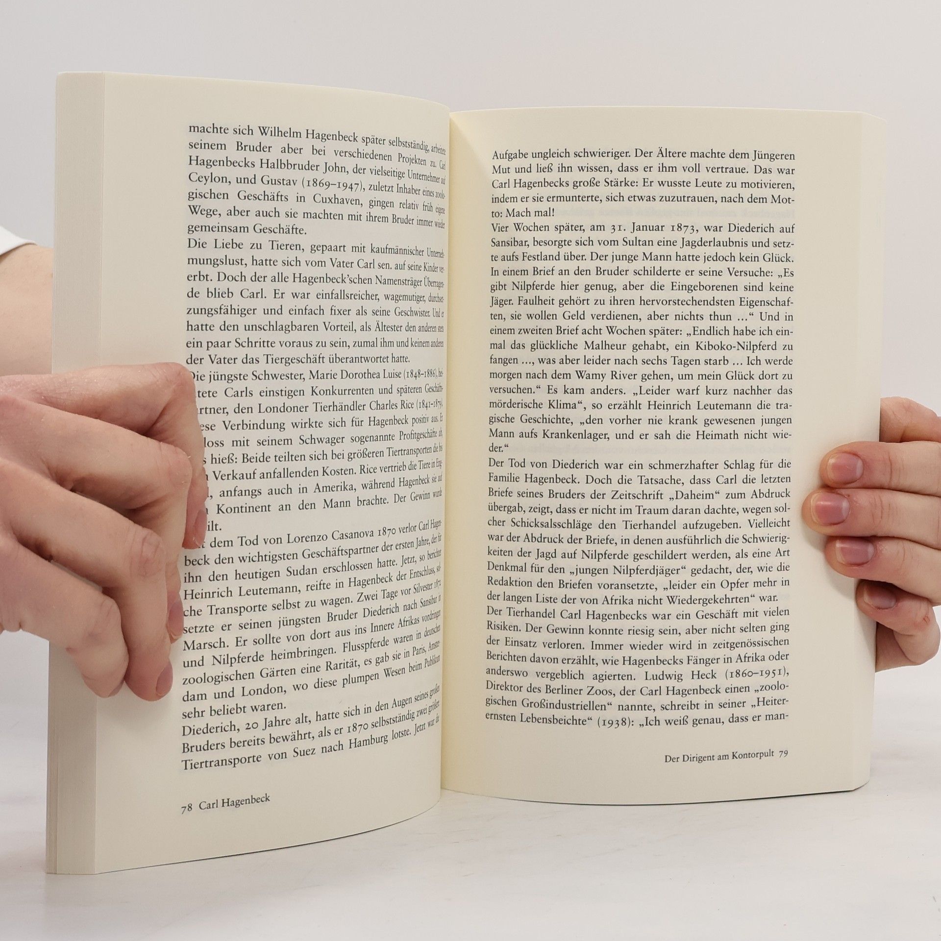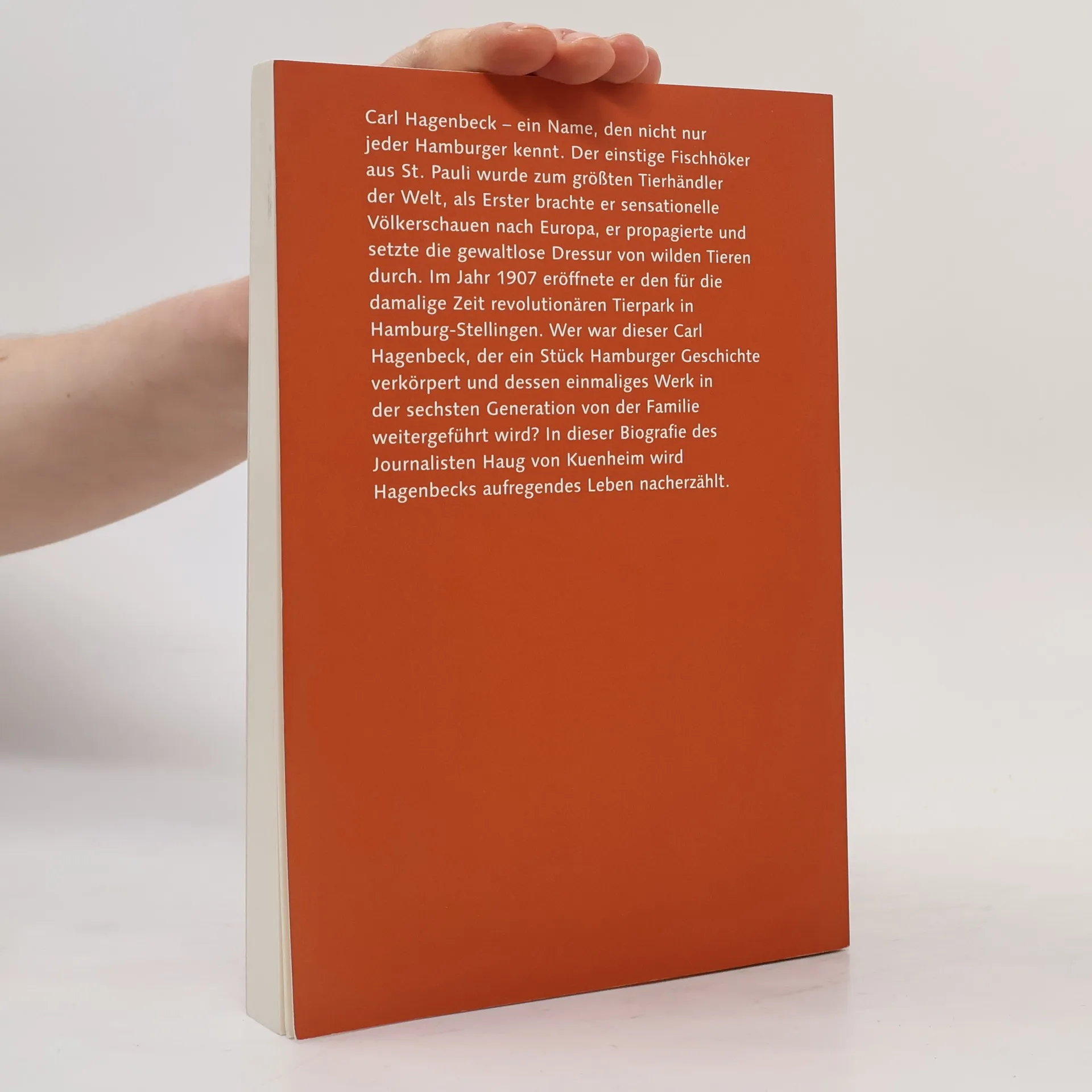 Einen eigenartigen Beruf habe Carl Hagenbeck gehabt, schrieb ein Zeitgenosse. 1844 als Sohn eines Hamburger Fischhändlers geboren, erwies sich der junge Carl schon bald als geschäftstüchtiger Partner im väterlichen Unternehmen. Aus dem Fisch-handel wurde eine Handlungsmenagerie, dann ein Thierpark mit Sitz in St. Pauli. Von dort aus steuerte Hagenbeck seine internationalen Aktivitäten als Tierhändler, als Initiator von Völkerschauen, als Dompteur und Zirkusdirektor. Der weitgereiste Autodidakt war vielsprachig und weltgewandt, sein aus der Praxis gewonnenes zoologisches Wissen imponierte selbst Fachleuten. Er sprühte vor Ideen und verstand es, Menschen dafür zu gewinnen. Seinen Traum von einem Tierparadies, in dem die Tiere freier und natürlicher als in den bis dahin üblichen Menagerien und zoologischen Gärten gehalten werden sollten, verwirklichte er 1907 mit der Gründung von Hagenbecks Tierpark in Stellingen. Als er 1913 starb, war er weltberühmt. Besonders stolz machten ihn die Auszeichnungen, die er aus der Hand Kaiser Wilhelms II. erhalten hatte. Dieses Buch schildert einen ungewöhnlichen Lebensweg, der zugleich typisch für die Gründerzeit des 19. Jahrhunderts war.