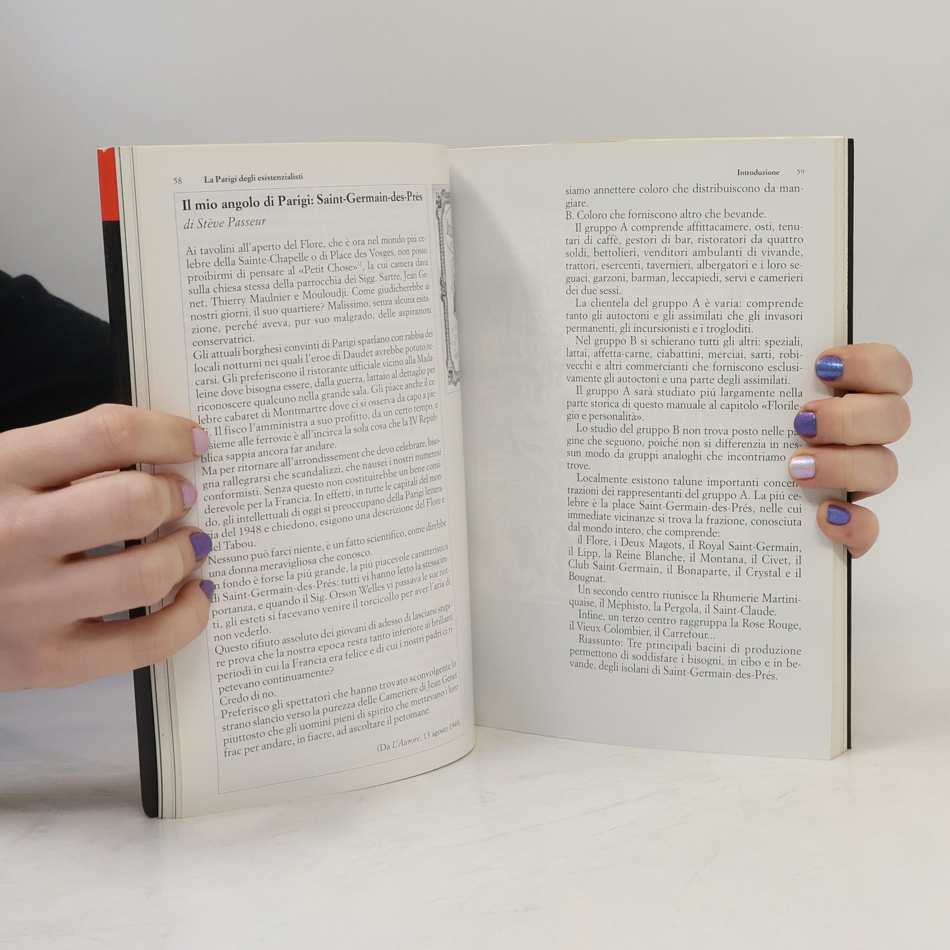 Fatti, miti, strade, caffè e personaggi della Parigi del dopoguerra.A raccontare la Parigi del dopoguerra, la Parigi delle «cave» e del jazz, è in questo volume uno dei protagonisti più memorabili dell'epoca d'ora di Saint-Germain-des-Prés. Con il suo humour stralunato e tagliente, Vian ci offre un viaggio indimenticabile attraverso la città, ci accompagna a conoscere le sue strade e i suoi caffè, le sue manie e i suoi personaggi (da Prévert a Juliette Greco, da Queneau a Sartre, dai Frères Jacques a Cocteu, da Simone de Beauvoir a Camus). Ne esce il ritratto struggente di un'epoca piena di vita e di invenzioni, cui le numerose, splendide fotografie aggiungono un fascino nostalgico e poetico.
