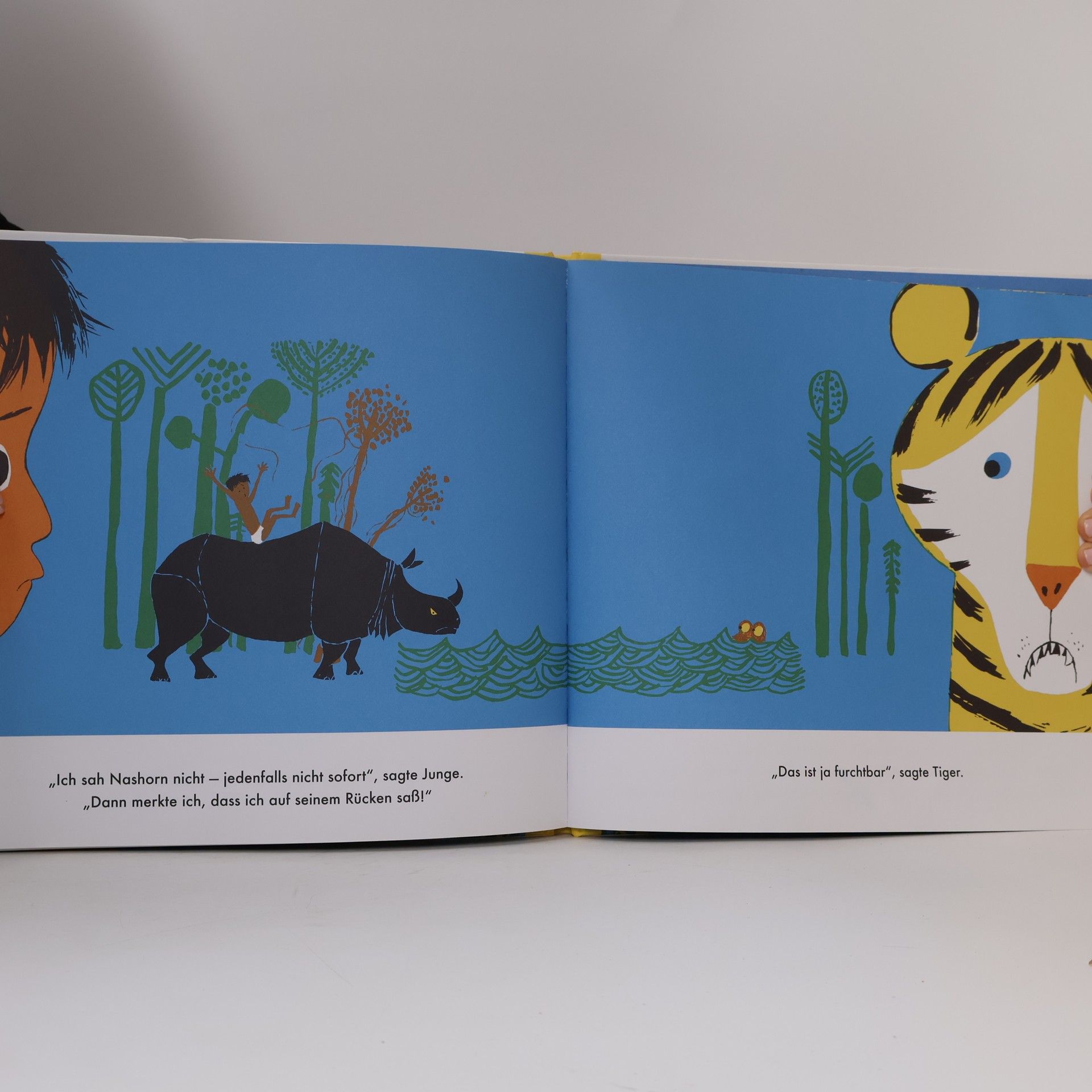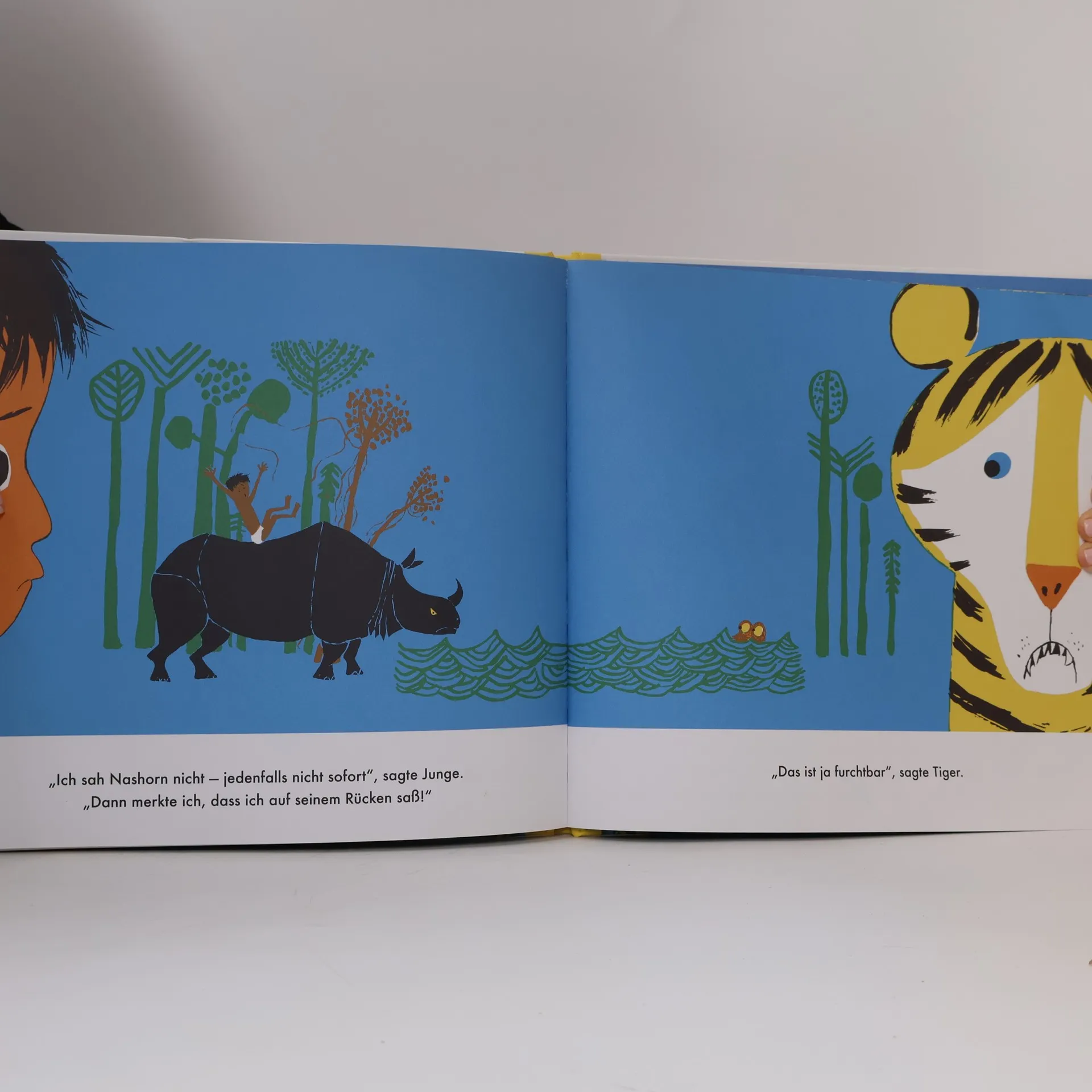Die Wiederentdeckung eines amerikanischen Bilderbuch-Klassikers Was tun, wenn dich ein Tiger fressen möchte und du nicht mehr weglaufen kannst? Richtig, du verwickelst ihn in eine spannende Geschichte! Genau so macht es der Junge in diesem Buch. Er erzählt dem Tiger, warum er zu erschöpft ist, um wegzurennen. Seine Geschichte handelt von seiner spannenden Verfolgungsjagd mit einem wütenden Nashorn und dauernd wendet sich die Situation. Mit lustigen und ausdrucksstarken Gesichtsausdrücken fiebert Tiger während der ganzen Geschichte mit und kommentiert das Glück und das Unglück des Jungen: „Ich kletterte hinauf. Nashorn rannte so schnell, dass er glatt vorbeischoss.“ „Das ist gut“, sagte Tiger. „Ja, aber Nashorn kam zurück, um mich suchen“, sagte Junge. „Das ist schlecht“, sagte Tiger. „Das ist gut! Das ist schlecht!“ ist ein Meisterwerk der Kinderliteratur und wurde erstmalig im Jahr 1963 in den USA veröffentlicht. 2019 erscheint dieser Bilderbuchklassiker nun auch in deutscher Sprache.