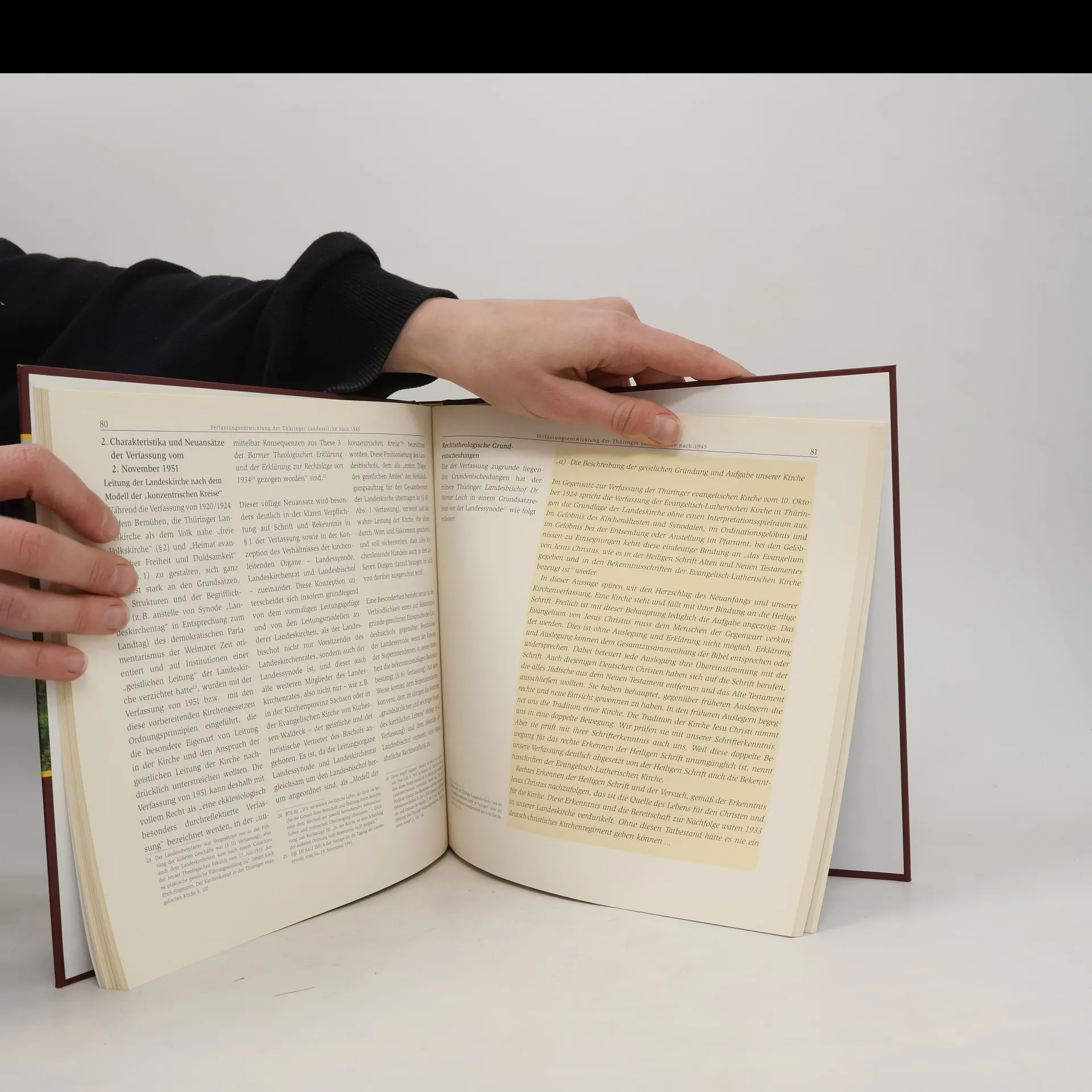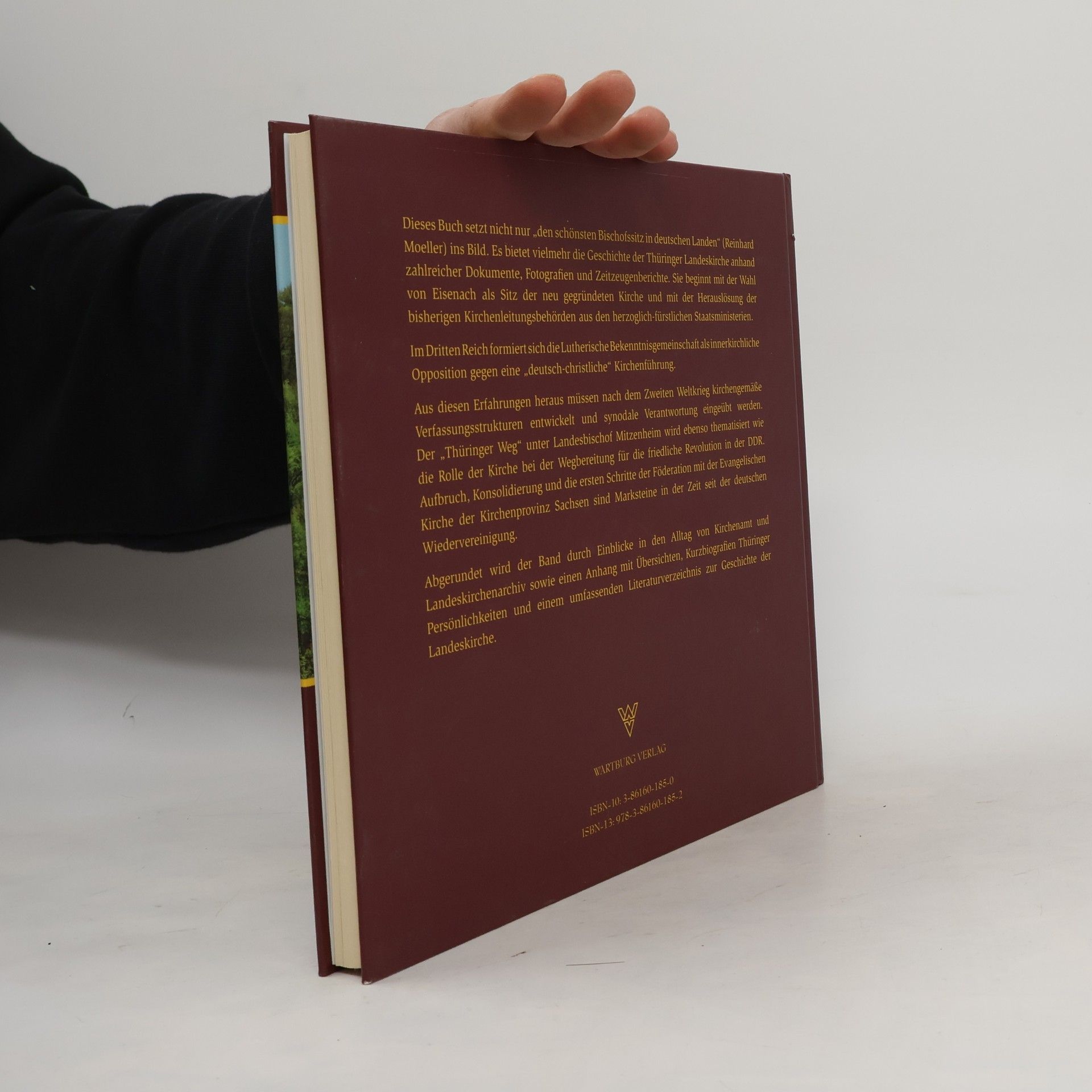 Dieses Buch setzt nicht nur „den schönsten Bischofssitz in deutschen Landen“ (Reinhard Moeller) ins Bild. Es bietet vielmehr die Geschichte der Türinger Landeskirche anhand zahlreicher Dokumente, Fotografien und Zeitzeugenberichte. Sie beginnt mit der Wahl von Eisenach als Sitz der neu gegründeten Kirche und mit der Herauslösung der bisherigen Staatsministerien. Im Dritten Reich formiert sich die Lutherische Bekenntnisgemeinshaft als innerkirchliche Opposition gegen eine „deutsch-christliche“ Kirchenführung. Aus diesen Erfahrungen heraus müssen nach dem Zweiten Weltkrieg kirchengemäße Verfassungsstrukturen entwickelt und synodale Verantwortung eingeübt werden. Der „Thüringer Weg“ unter Landesbischof Mitzenheim wird ebenso thematisiert wie die Rolle der Kirche bei der Wegbereitung für die friedliche Revolution in der DDR. Aufbruch, Konsolidierung und die ersten Schritte der Förderation mit der Evangelischen Kirche der Kirchenprovinz Sachsen sind Marksteine in der Zeit seit der deutschen Wiedervereinigung. Abgerundet wird der Band durch Einblicke in den Alltag von Kirchenamt und Landeskirchenarchiv sowie einen Anhang mit Übersichten, Kurzbiografien Thüringer Persönlichkeiten und einem umfassenden Literaturverzeichnis zur Geschichte der Landeskirche.