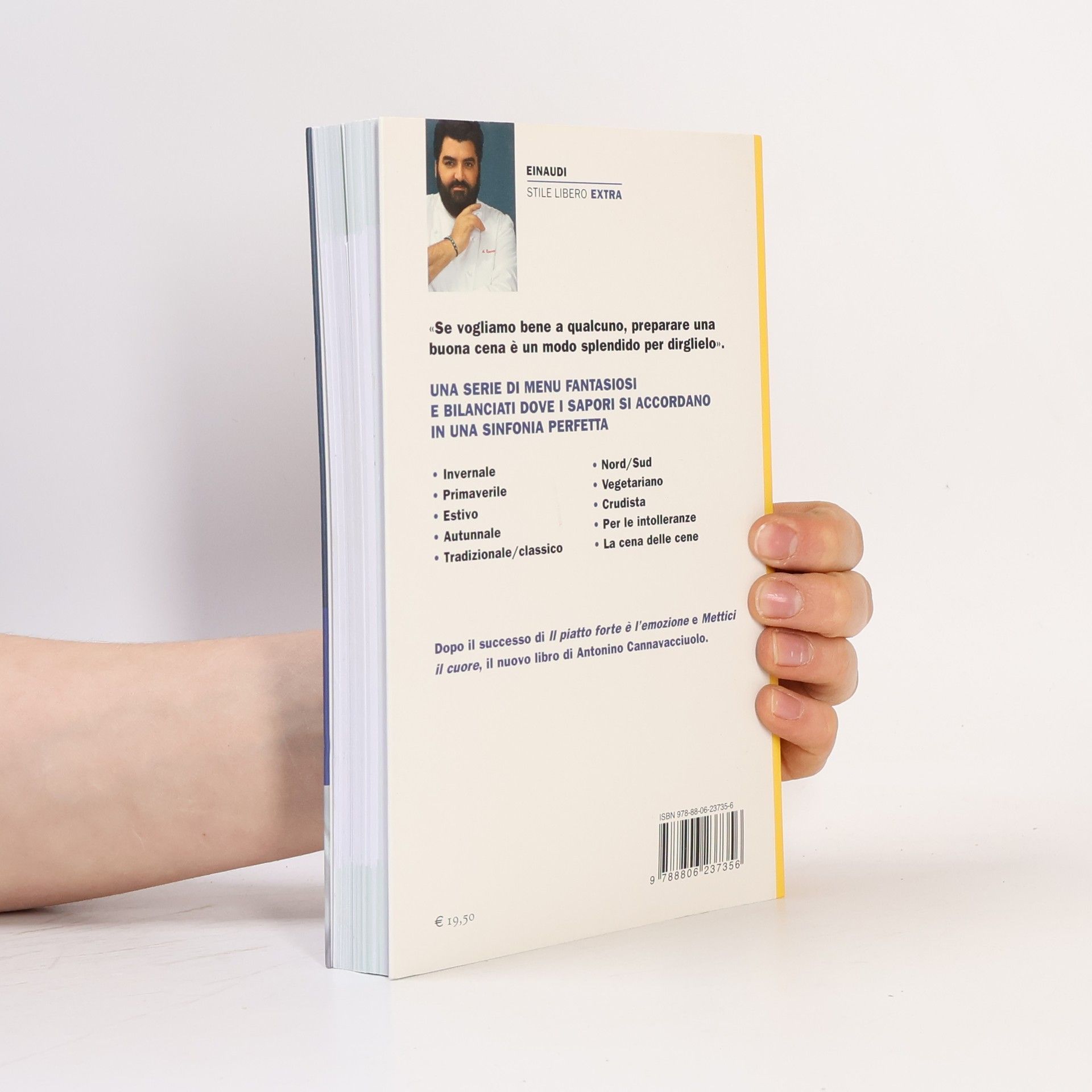 UNA SERIE DI MENU FANTASIOSI E BILANCIATI DOVE I SAPORI SI ACCORDANO IN UNA SINFONIA PERFETTA • Invernale • Primaverile • Estivo • Autunnale • Tradizionale/classico • Nord/Sud • Vegetariano • Crudista • Per le intolleranze • La cena delle cene Dopo il successo di Il piatto forte è l'emozione e Mettici il cuore , il nuovo libro di Antonino Cannavacciuolo. Come si combinano i piatti a seconda delle occasioni, da quelle più formali a quelle più semplici? Come si organizza una cena, dall'antipasto al dessert, cosí che diventi indimenticabile? In questo suo nuovo libro Antonino Cannavacciuolo accosta con sapienza cinquanta ricette, corredandole di foto, consigli per l'impiattamento e suggerimenti sui vini e le bevande da abbinare. Per favorire la convivialità e alleggerire la vita mangiando.