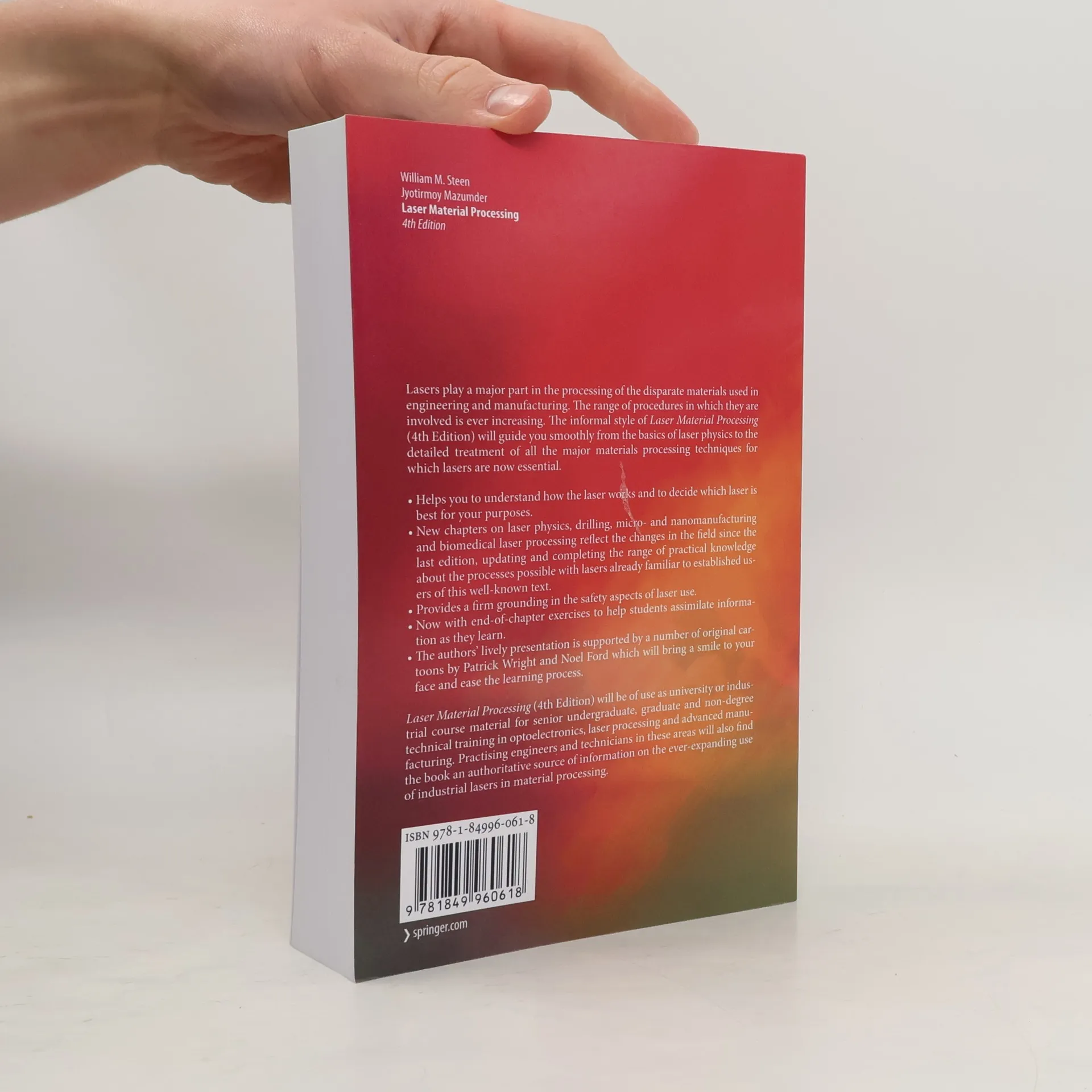 Lasers play a major part in the processing of the disparate materials used in engineering and manufacturing. The range of procedures in which they are involved is ever increasing. The informal style of Laser Material Processing (4th Edition) will guide you smoothly from the basics of laser physics to the detailed treatment of all the major materials processing techniques for which lasers are now essential. Helps you to understand how the laser works and to decide which laser is best for your purposes. New chapters on laser physics, drilling, micro- and nanomanufacturing and biomedical laser processing reflect the changes in the field since the last edition, updating and completing the range of practical knowledge about the processes possible with lasers already familiar to established users of this well-known text. Provides a firm grounding in the safety aspects of laser use. Now with end-of-chapter exercises to help students assimilate information as they learn. The authors lively presentation is supported by a number of original cartoons by Patrick Wright and Noel Ford which will bring a smile to your face and ease the learning process. Laser Material Processing (4th Edition) will be of use as university or industrial course material for senior undergraduate, graduate and non-degree technical training in optoelectronics, laser processing and advanced manufacturing. Practising engineers and technicians in these areas will also find the book an authoritative source of information on the ever- expanding use of industrial lasers in material processing. "