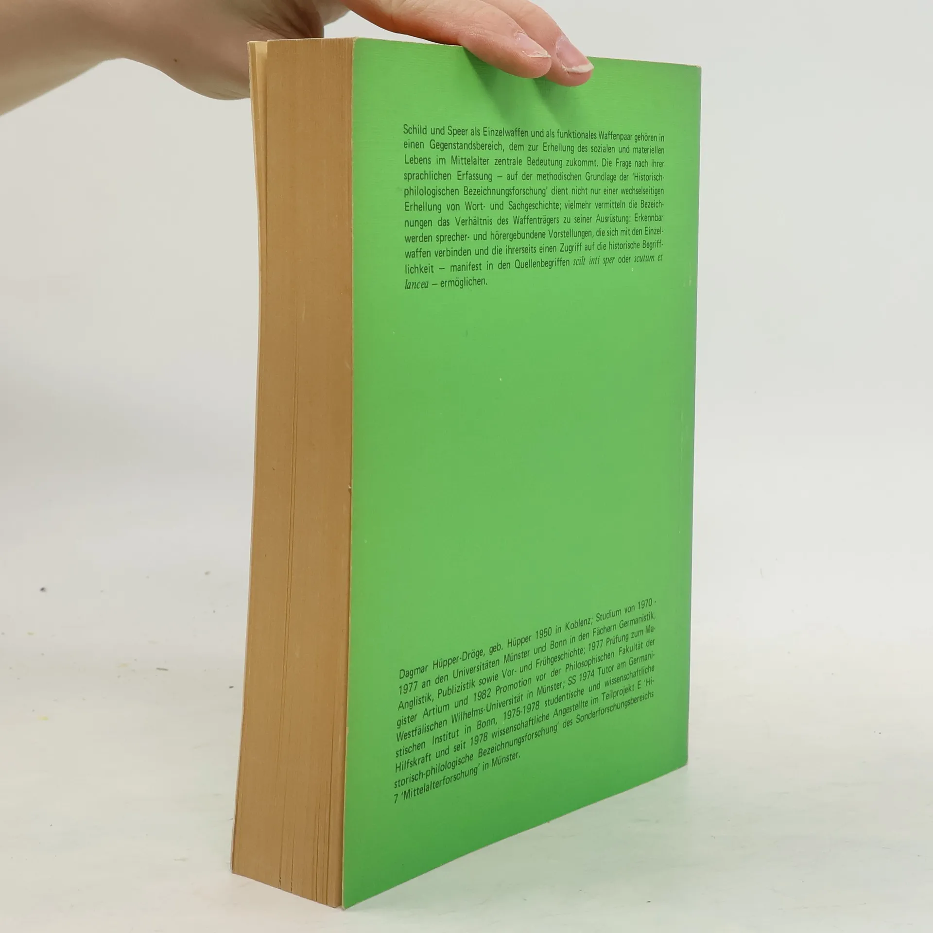 Schild und Speer als Einzelwaffen und als funktionales Waffenpaar gehören in einen Gegenstandsbereich, dem zur Erhellung des sozialen und materiellen Lebens im Mittelalter zentrale Bedeutung zukommt. Die Frage nach ihrer sprachlichen Erfassung - auf der methodischen Grundlage der 'Historisch-philologischen Bezeichnungsforschung' dient nicht nur einer wechselseitigen Erhellung von Wort- und Sachgeschichte; vielmehr vermitteln die Bezeichnungen das Verhältnis des Waffenträgers zu seiner Ausrüstung: Erkennbar werden sprecher- und hörergebundene Vorstellungen, die sich mit den Einzelwaffen verbinden und die ihrerseits einen Zugriff auf die historische Begrifflichkeit - manifest in den Quellenbegriffen scilt inti sper oder scutum et lancea - ermöglichen.