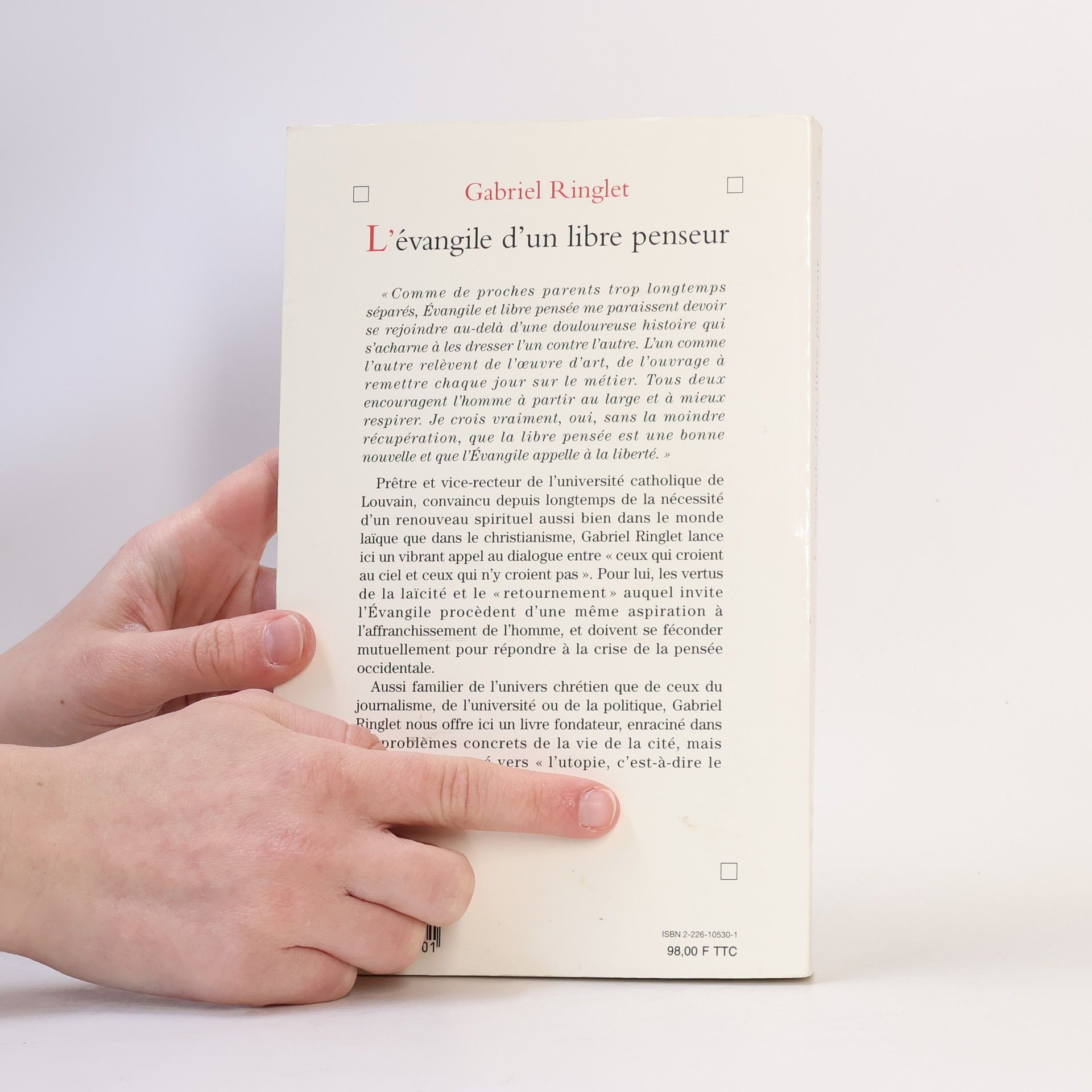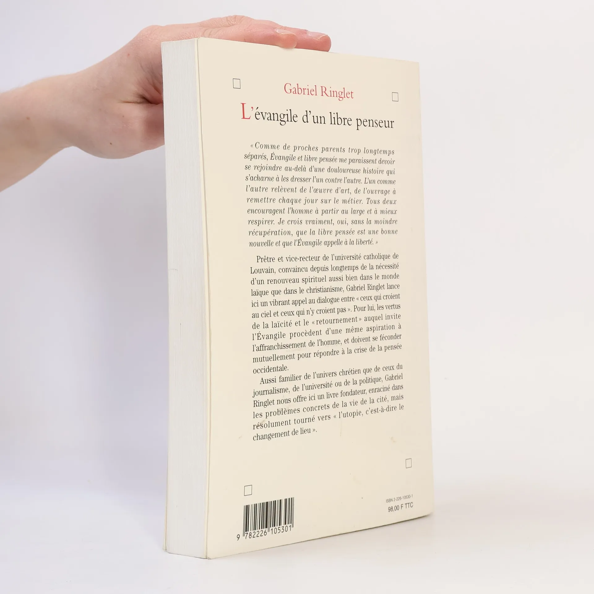 « Comme de proches parents trop longtemps séparés, Évangile et libre pensée me paraissent devoir se rejoindre au-delà d'une douloureuse histoire qui s'acharne à les dresser l'un contre l'autre. L'un comme l'autre relèvent de l'oeuvre d'art, de l'ouvrage à remettre chaque jour sur le métier. Tous deux encouragent l'homme à partir au large et à mieux respirer. Je crois vraiment, oui, sans la moindre récupération, que la libre pensée est une bonne nouvelle et que l'Évangile appelle à la liberté. » Convaincu depuis longtemps de la nécessité d'un renouveau spirituel aussi bien dans le monde laïc que dans le christianisme, Gabriel Ringlet lance ici un vibrant appel au dialogue entre « ceux qui croient au ciel et ceux qui n'y croient pas ». Pour lui, les vertus de la laïcité et le « retournement » auquel invite l'Évangile procèdent d'une même aspiration à l'affranchissement de l'homme et doivent se féconder mutuellement pour répondre à la crise de la pensée occidentale. Aussi familier de l'univers chrétien que de ceux du journalisme, de l'université ou de la politique, Gabriel Ringlet, dont le témoignage a obtenu le Prix des Libraires de Littérature religieuse en 1999, nous offre un livre fondateur, enraciné dans les problèmes concrets de la vie de la cité, mais résolument tourné vers « l'utopie, c'est-à-dire le changement de lieu ».