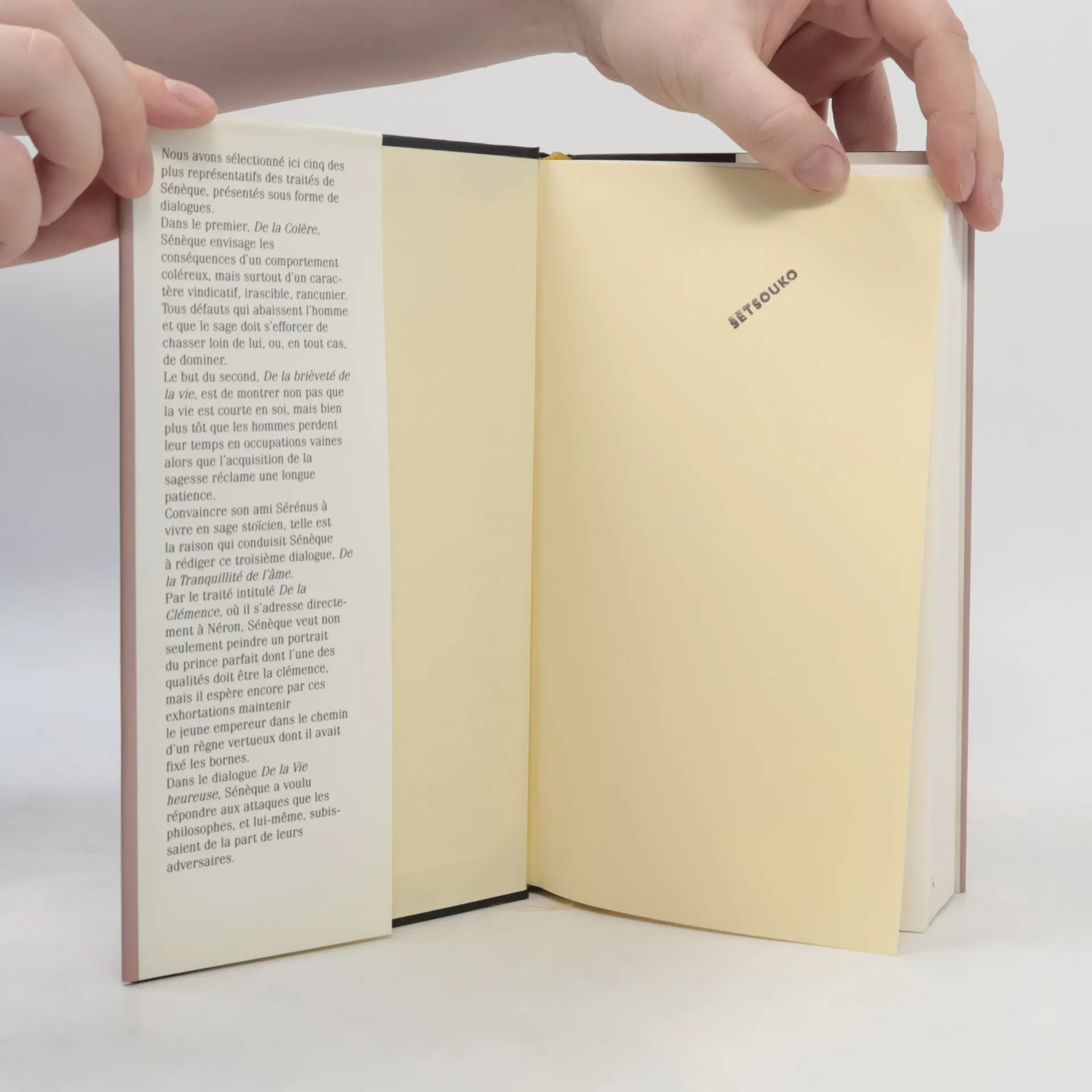 Sont sélectionnés dans cet ouvrage cinq des traités les plus représentatifs de Sénèque, présentés sous forme de dialogues. Dans le premier, De la colère, Sénèque envisage les conséquences d'un comportement coléreux, mais surtout d'un caractère vindicatif, irascible, rancunier. Tous défauts qui abaissent l'homme et que le sage doit s'efforcer de chasser loin de lui ou, en tout cas, de dominer. Le but du second, De la brièveté de la vie, est de montrer non pas que la vie est courte en soi, mais bien plutôt que les hommes perdent leur temps en occupations vaines alors que l'acquisition de la sagesse réclame une longue patience. Convaincre son ami Sérénus de vivre en sage stoïcien, telle est la raison qui conduisit Sénèque à rédiger ce troisième dialogue, De la tranquillité de l'âme. Par le traité intitulé De la clémence, où il s'adresse directement à Néron, Sénèque veut non seulement peindre un portrait du prince parfait dont l'une des qualités doit être la clémence, mais il espère encore par ces exhortations maintenir le jeune empereur dans le chemin d'un règne vertueux dont il avait fixé les bornes. Dans le dialogue De la vie heureuse, Sénèque a voulu répondre aux attaques que les philosophes, et lui-même, subissaient de la part de leurs adversaires.