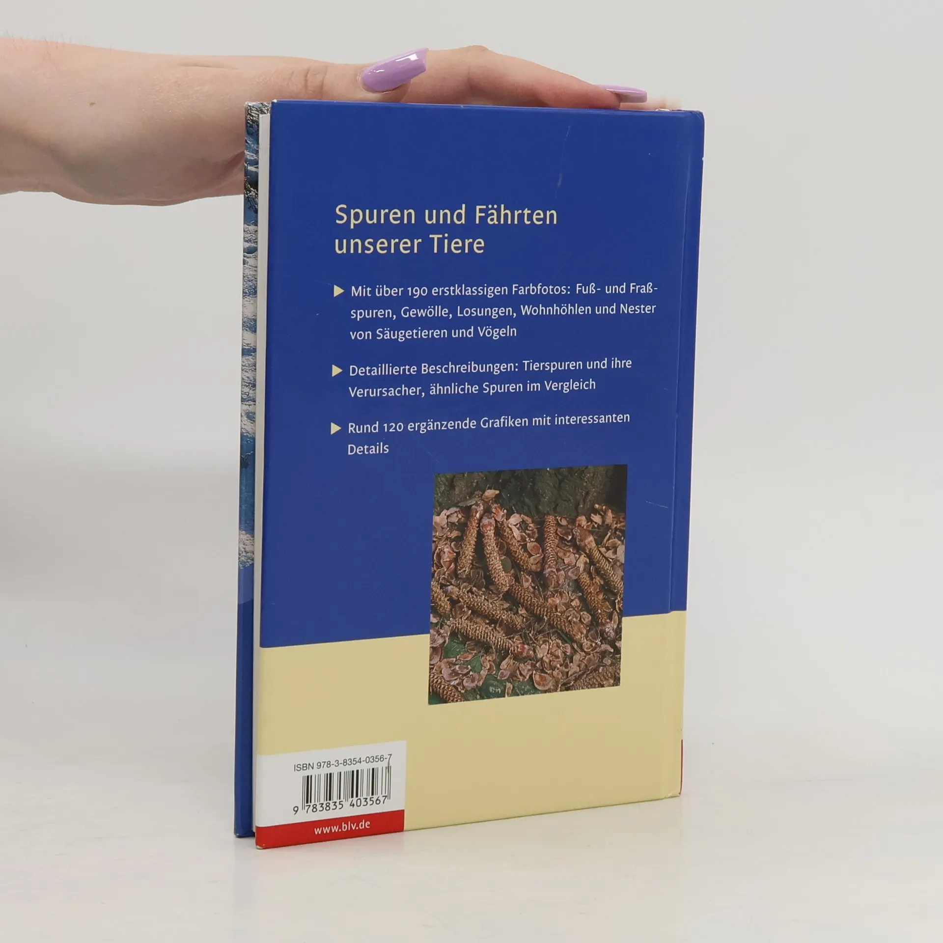 Für den Spaziergang in Wald und Flur: die wichtigsten und häufigsten Fuß- und Fraßspuren, Gewölle, Losungen, Wohnhöhlen und Nester von Säugetieren und Vögeln bestimmen. Viele Tiere bleiben dem Naturfreund verborgen, weil sie entweder nachtaktiv sind oder besonders scheu. Statt dessen begegnet man häufiger ihren Spuren und Fährten, die vieles über ihre Lebensweise verraten. Die Biologin Angelika Lang beschreibt in dem Naturführer Spuren und Fährten unserer Tiere die wichtigsten Tierspuren: Fährten, Kotspuren, Fraßspuren, Gewölle und Wohnbauten. Über 180 Farbfotos vermitteln ein naturgetreues Bild und ermöglichen, eine gefundene Tierspur rasch zu identifizieren und festzustellen, durch welche Tätigkeit sie entstanden ist. Den Fotos sind präzise, detaillierte Beschreibungen gegenübergestellt. Außerdem zeigen zusätzliche Grafiken weitere Erkennungs- und Unterscheidungsmerkmale wie ähnliche Spuren verwandter Arten oder Besonderheiten aus der Biologie: z. B. Schnitte durch Baue und Gallen, die Schlafposition bestimmter Tiere oder auch Insekten, die besondere Spuren erzeugen. Derart informiert kann man sich mit Spuren und Fährten unserer Tiere beim nächsten Spaziergang durch die Natur ein Bild von versteckten Zwei- und Vierbeinern machen.