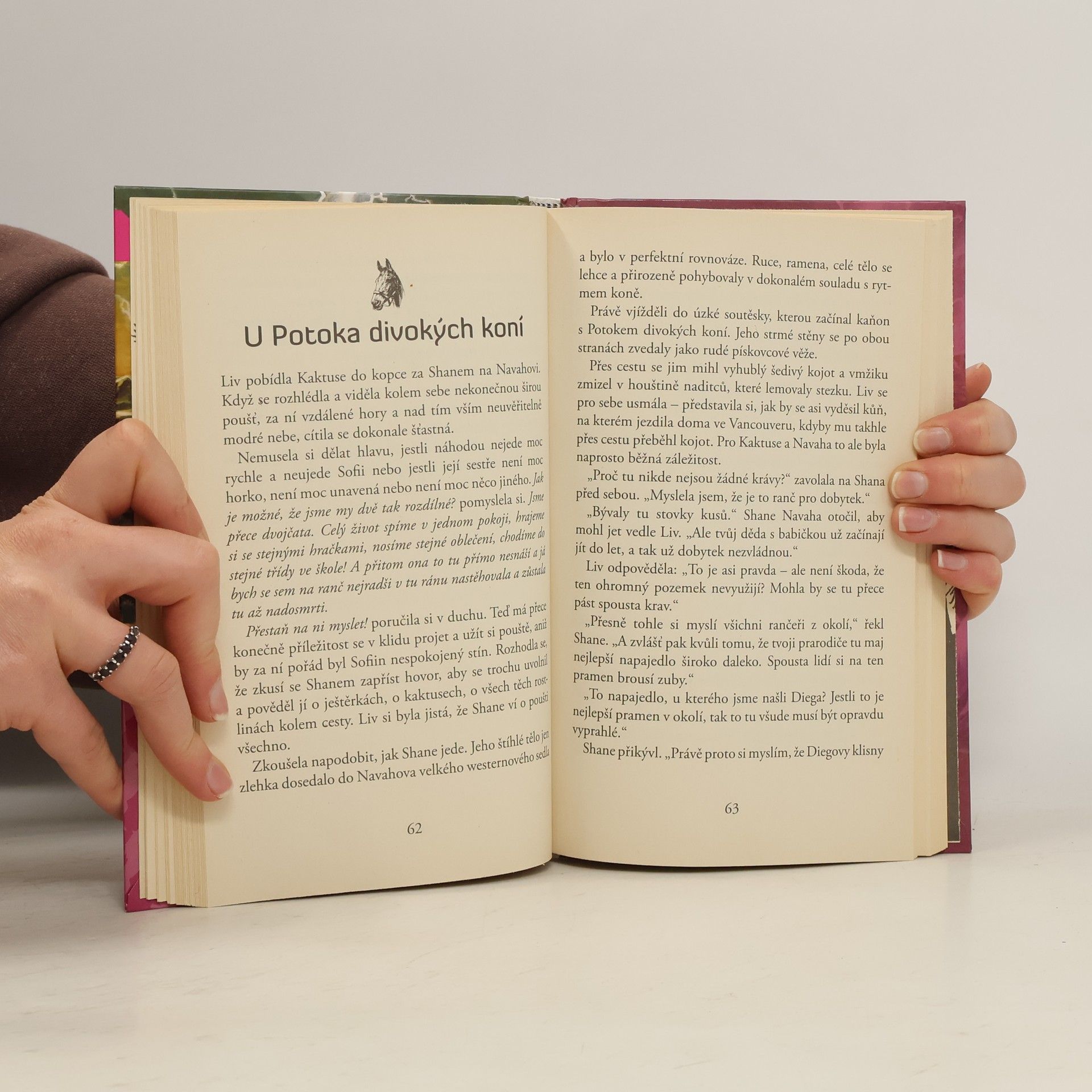 Jak jen mohou být sestry tak rozdílné – a to jsou ještě navíc dvojčata! Liv má dobrodružství v krvi snad od narození, nezalekne se nebezpečné vyjížďky na koni na skalní římse nad kaňonem ani shánění polodivokých koní na dědečkově ranči. Sofie má naproti tomu ráda svůj klid, nesnáší dobrodružství a nebezpečí – a také že se jí při výpravách, které naplánuje její sestra, pokaždé něco stane! Ale když se na ranči jejich prarodičů v Arizoně začne schylovat k pořádným problémům, sestry se semknou a spolu s mladým honákem Shanem se rozhodnou zachránit ranč, záhadného divokého hřebce i stádo vzácných dědečkových koní. A nikdo a nic jim v tom nezabrání – ani chřestýši, anistádo divočáků, ani ozbrojení pytláci! První díl knižní řady Potok divokých koní.
