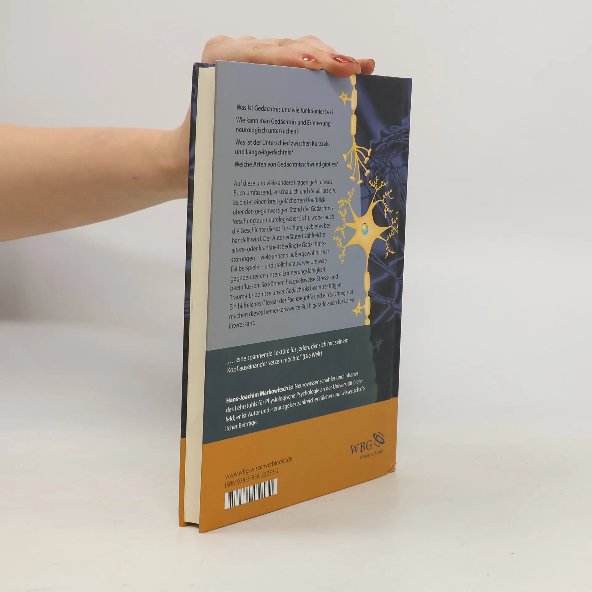 Obwohl Gedächtnis und Erinnerung ganz alltägliche Erscheinungen sind, handelt es sich um beeindruckende Phänomene, die nicht nur von großem wissenschaftlichem Interesse sind. Das vorliegende Sachbuch bietet einen breit gefächerten und anschaulichen Überblick über den gegenwärtigen Stand der Gedächtnisforschung aus neurowissenschaftlicher Sicht. Ausgehend von den historischen Anfängen der Gedächtnis- und Hirnforschung schlägt Markowitsch einen Bogen zu den heutigen Auffassungen von Gehirnfunktionen und Informationsverarbeitung und somit zu den Forschungsbereichen der modernen Neurologie und Psychiatrie. Neben der Grundlagenforschung mit ihren neuesten neurowissenschaftlichen Methoden erläutert der Autor auch Anwendungsaspekte (z. B. Gedächtnistraining). Er zeigt an gesunden und erkrankten Gehirnen wie Gedächtnis funktioniert und warum es zu manchmal beträchtlichen Ausfällen kommen kann. Besonders stellt er die Umwelteinflüsse auf unser Gedächtnis heraus – so können Stress- und Trauma-Erlebnisse unsere Erinnerungsfähigkeit ganz wesentlich beeinträchtigen. Auch durch viele anschauliche Beispiele, mithilfe derer Markowitsch den Leser immer wieder zu fesseln vermag, und durch ein sehr ausführliches Glossar wird dem interessierten Leser ein optimaler Zugang zu einer komplizierten, aber faszinierenden Materie gewährt.