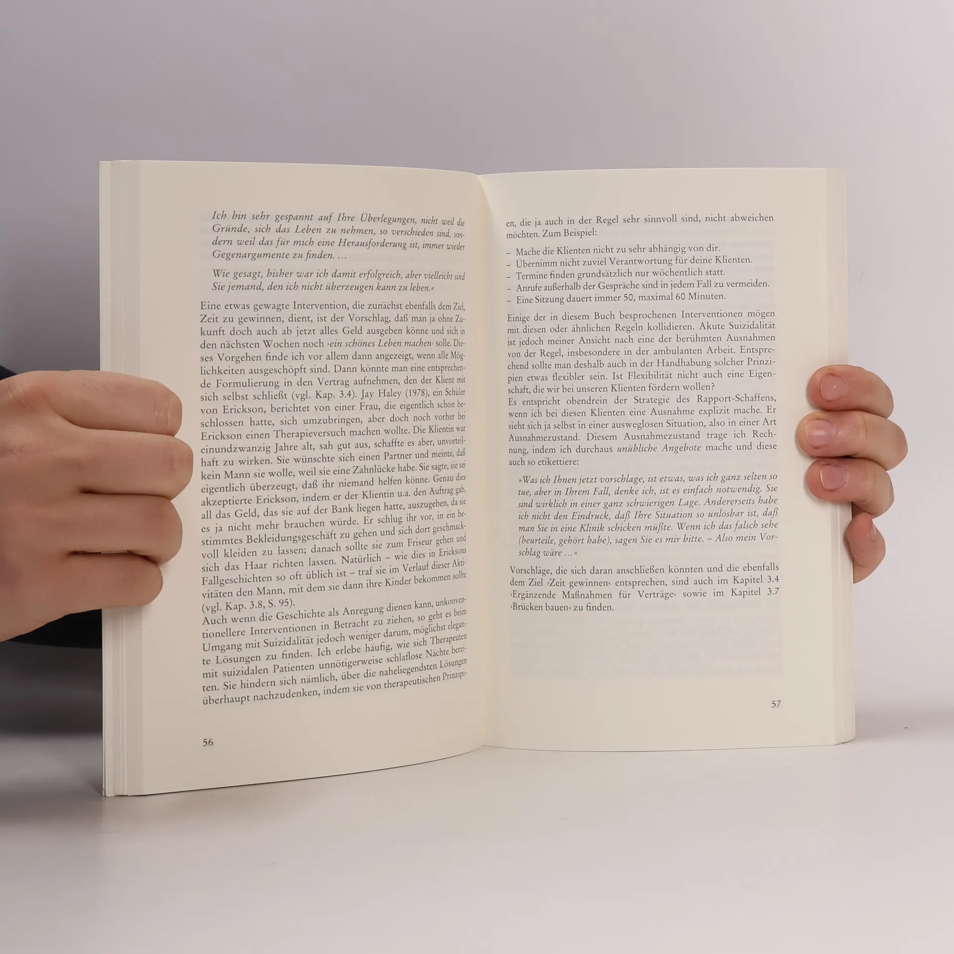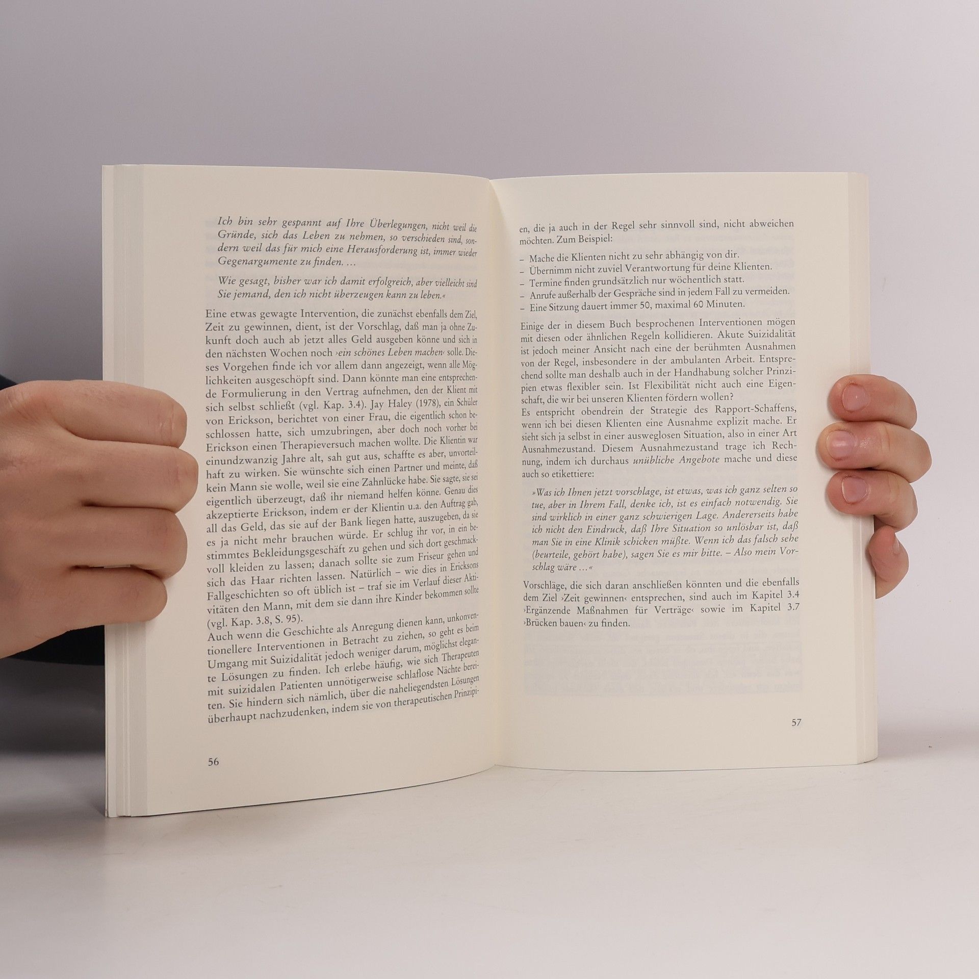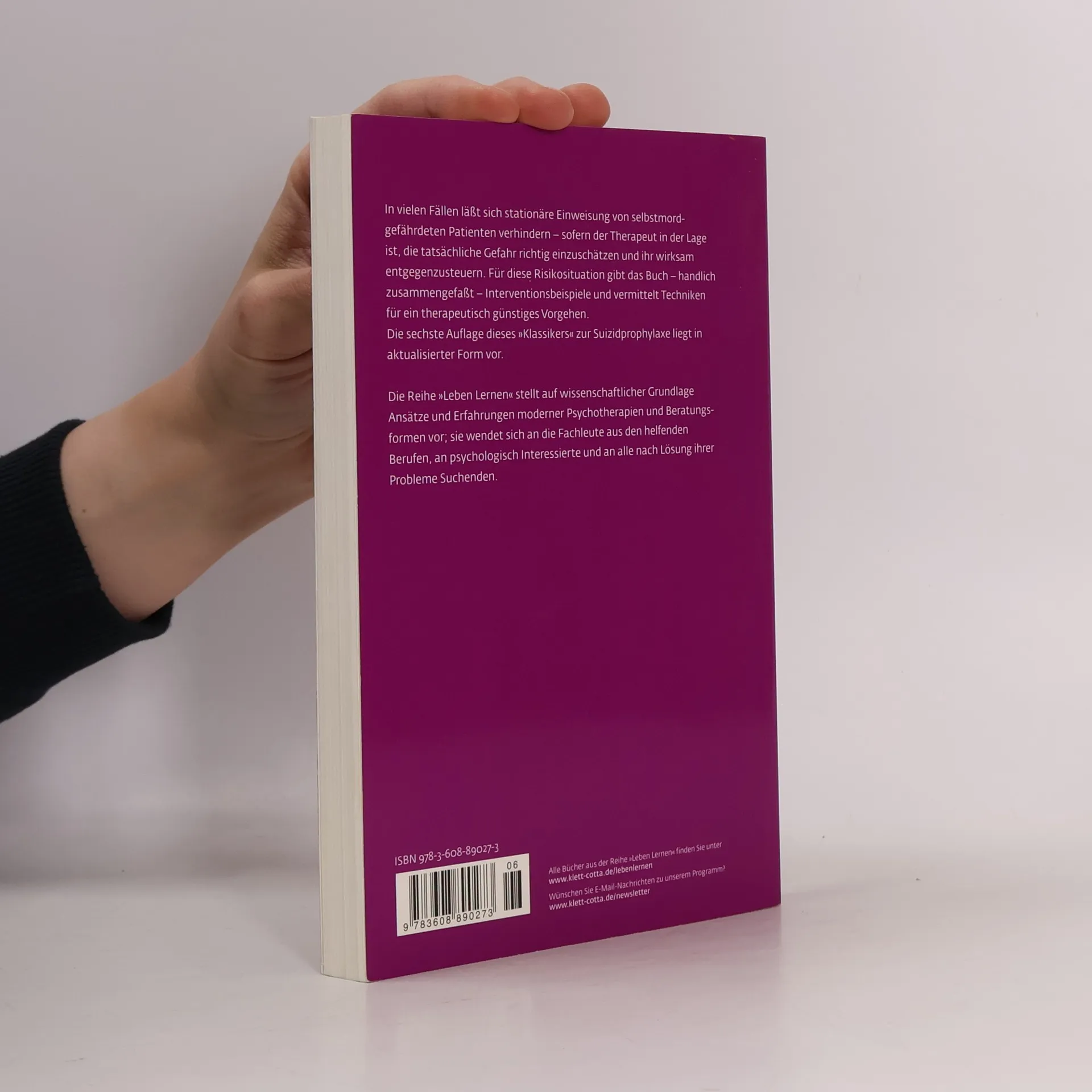 Da in der Psychotherapieausbildung meist zu wenig auf den Fall akuter Suizidalität eines Patienten vorbereitet wird, sollte sich jeder Therapeut selbst für den Ernstfall entsprechend trainieren. Das Buch gibt Interventionsbeispiele für therapeutisch günstiges Verhalten in Risikosituationen; es vermittelt diagnostische Hilfestellungen, Strategien und Techniken.