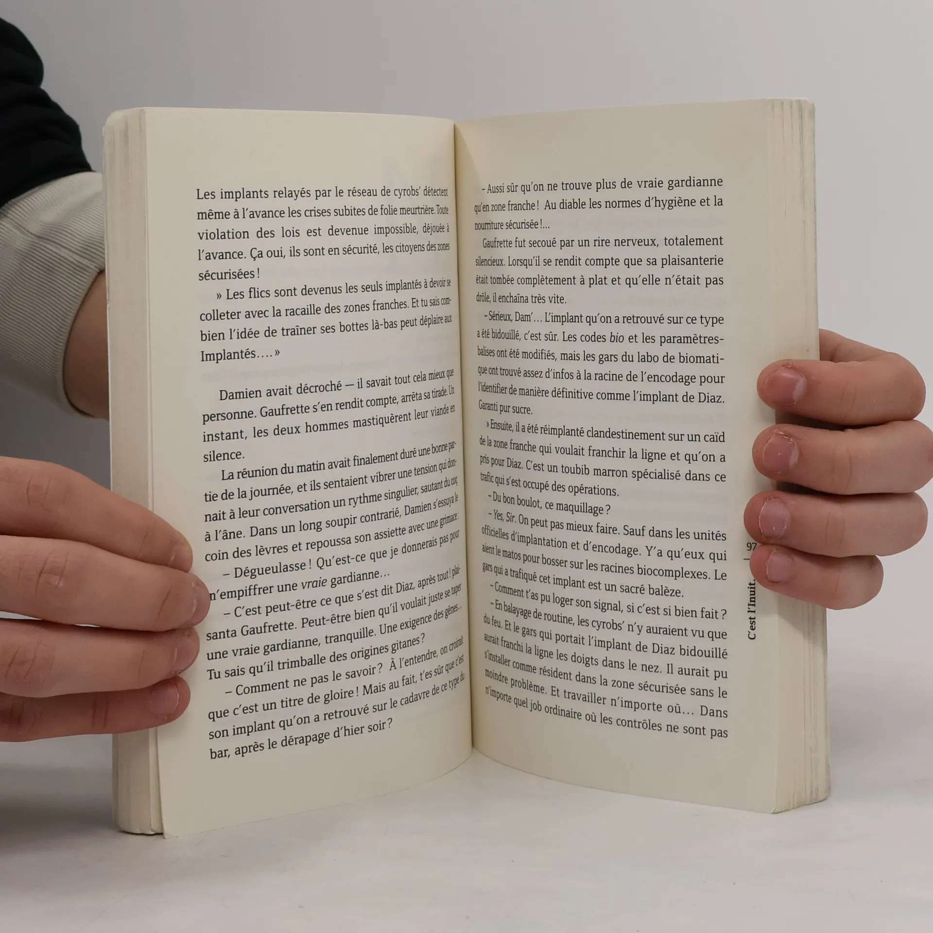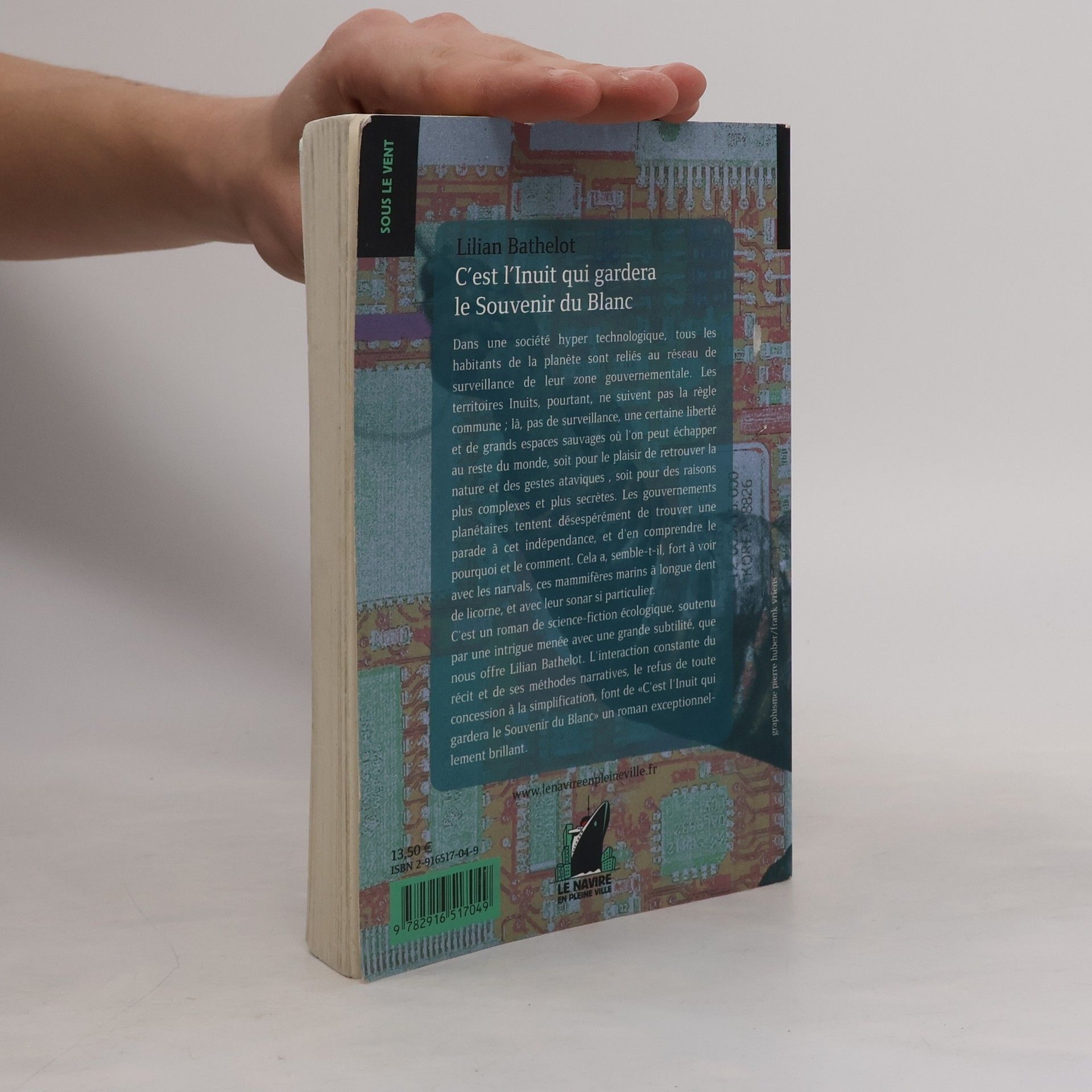 Dans une société hyper technologique, tous les habitants de la planète sont reliés au réseau de surveillance de leur zone gouvernementale. Les territoires Inuits, pourtant, ne suivent pas la règle commune ; là, pas de surveillance, une certaine liberté et de grands espaces sauvages où l'on peut échapper au reste du monde, soit pour le plaisir de retrouver la nature et des gestes ataviques , soit pour des raisons plus complexes et plus secrètes. Les gouvernements planétaires tentent désespérément de trouver une parade à cet indépendance, et d'en comprendre le pourquoi et le comment. Cela a, semble-t-il, fort à voir avec les narvals, ces mammifères marins à longue dent de licorne, et avec leur sonar si particulier. C'est un roman de science-fiction écologique, soutenu par une intrigue menée avec une grande subtilité, que nous offre Lilian Bathelot. L'interaction constante du récit et de ses méthodes narratives, le refus de toute concession à la simplification, font de "C'est l'Inuit qui concession le Souvenir du Blanc" un roman exceptionnelle brillant.