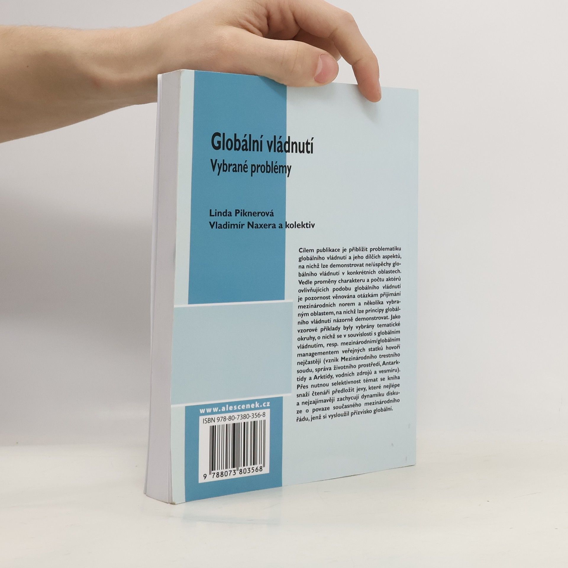 Cílem publikace je přiblížit problematiku globálního vládnutí a jeho dílčích aspektů, na nichž lze demostrovat ne/úspěchy globálního vládnutí v konkrétních oblastech. Vedle proměny charakteru a počtu aktérů ovlivňujících podobu globálního vládnutí je pozornost věnována otázkám přijímání mezinárodních norem a několika vybraným oblastem, na nichž lze principy globálního vládnutí názorně demonstrovat. Jako vzorové příklady byly vybrány tematické okruhy, o nichž se v souvislosti s globálním vládnutím, resp. mezinárodním/globálním managementem veřejných statků hovoří nejčastěji (vznik Mezinárodního trestního soudu, správa životního prostředí, Antarktidy a Arktidy, vodních zdrojů a vesmíru). Přes nutnou selektivnost témat se kniha snaží čtenáři předložit jevy, které nejlépe a nejzajímavěji zachycují dynamiku diskuze o povaze současného mezinárodního řádu, jenž si vysloužil přízvisko globální.