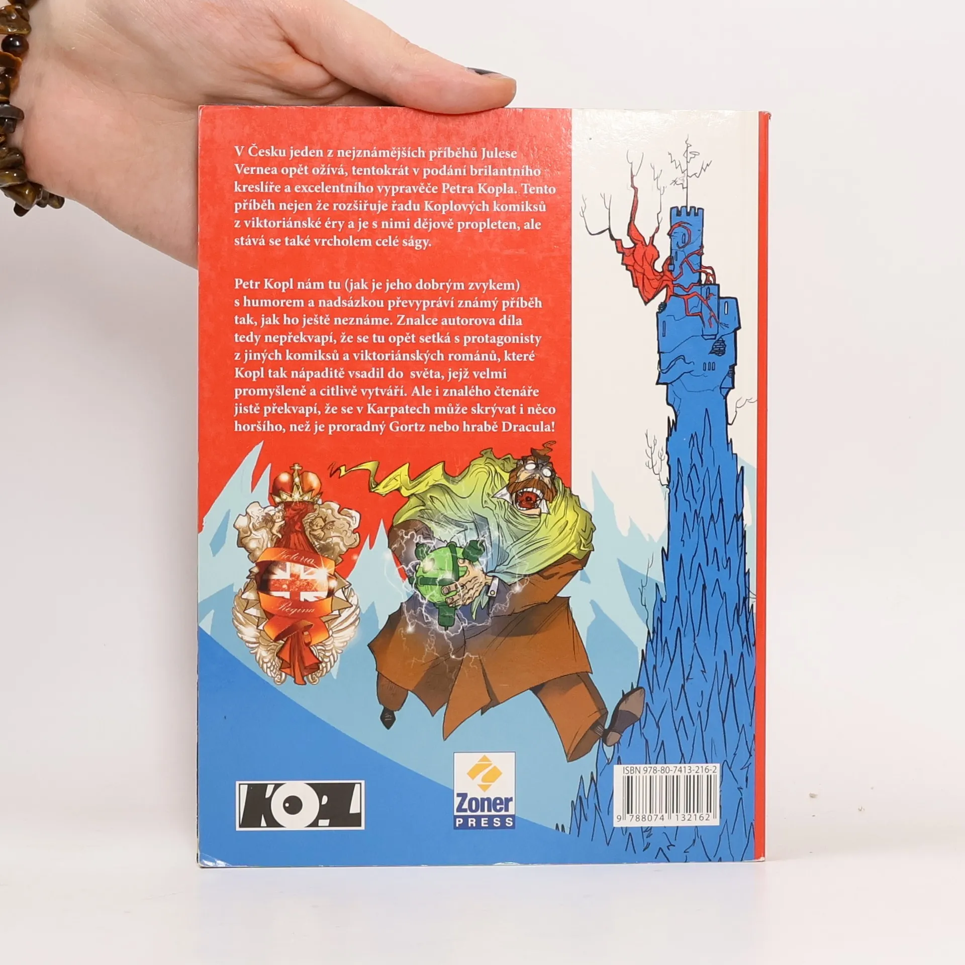 Klasický dobrodružný příběh Julese Verna v novém provedení. Kreslíř Petr Kopl převedl známý příběh hraběte Teleka, geniálního vynálezce Orfanika a zlověstného barona Gortze do výpravného barevného komiksu. Postavy a děj příběhu tak dostávají svou grafickou podobu, která si nijak nezadá s uměním slavného autora vědeckofantastických dobrodružných příběhů z konce 19. století. Ale tato kniha je víc než pouze překreslený příběh – Petr Kopl ve svých komiksech propojuje řadu příběhů, které vznikly na přelomu 19. a 20. století, a to nejen těch, jimiž se proslavil Jules Verne. Tato doba plná úžasných vynálezů, objevů a dobrodružných cest okouzlila spisovatele jako Jules Verne nebo Sir Arthur Conan Doyle, ale oslovuje i Petra Kopla, jenž na kostře událostí, které tito velikáni evropské literatury popsali ve svých knihách, odkrývá daleko fantastičtější skutečnosti. Nechejte se zavést do světa plného technických vynálezů, ale i vzrušujících lidských osudů v barvitém podání skvělého kreslíře a poznejte, že se vše, o čem jste si mysleli, že dobře znáte, mohlo odehrát trochu jinak. Petr Kopl obdržel prestižní ocenění Fabula Rasa za rok 2012, které je udělováno nejúspěšnějším komiksovým autorům. O udělení ceny hlasují sami čtenáři.