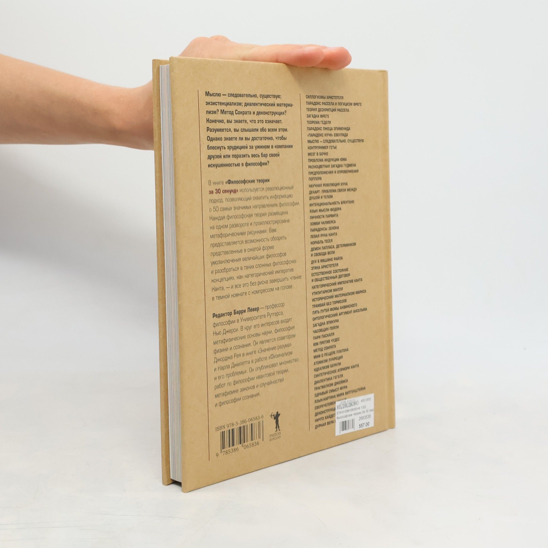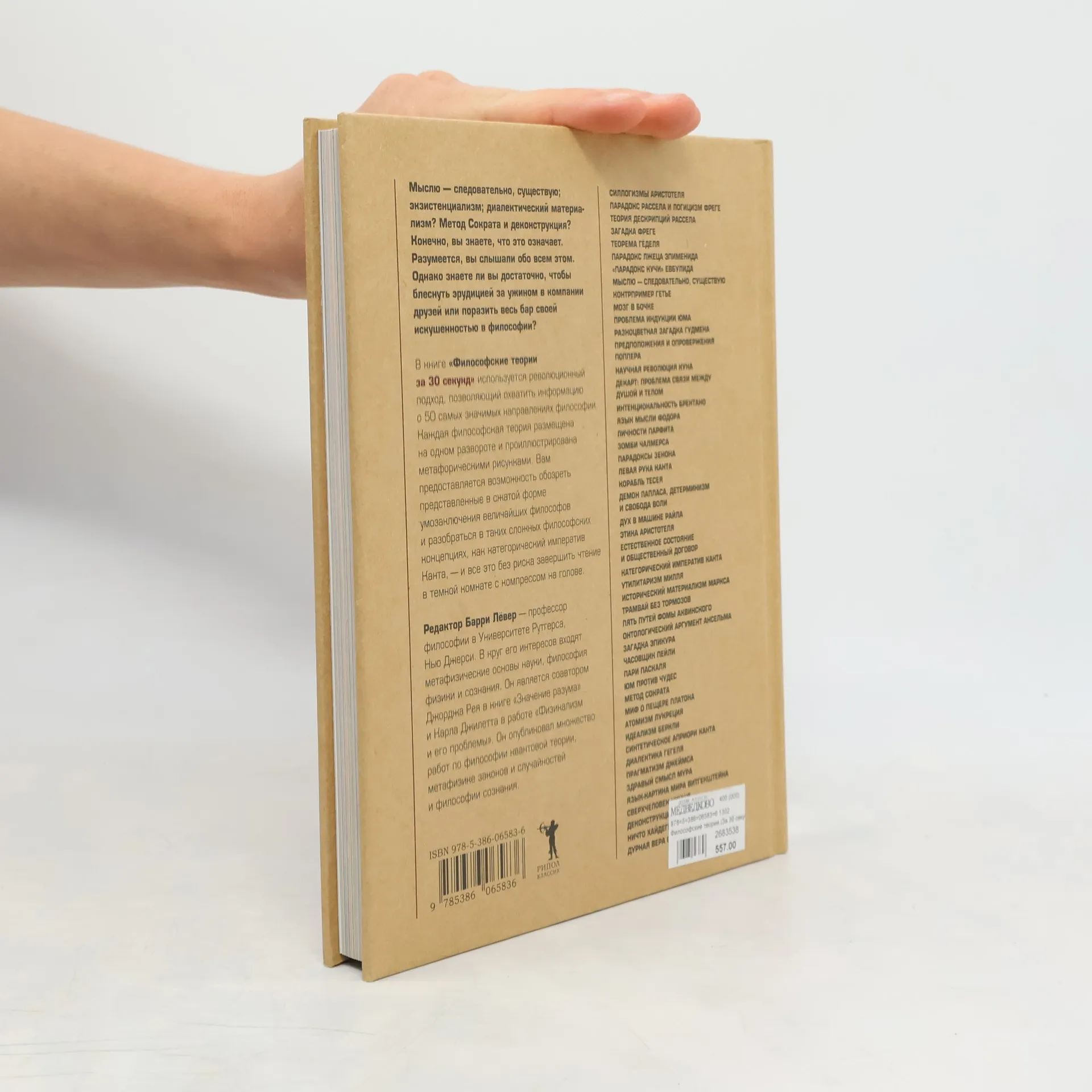 «Мыслю, — следовательно, существую; экзистенциализм; диалектический материализм? Метод Сократа и деконструкция? Конечно, вы знаете, что это означает. Разумеется, вы слышали обо всем этом. Однако знаете ли вы достаточно, чтобы блеснуть эрудицией за ужином в компании друзей или поразить весь бар своей искушенностью в философии? В книге «Философские теории за 30 секунд» используется революционный подход, позволяющий охватить информацию о 50 самых значимых направлениях философии. Вам предоставляется возможность обозреть представленные в сжатой форме умозаключения величайших философов и разобраться в таких сложных философских концепциях, как категорический императив Канта, — и все это без риска завершить чтение в темной комнате с компрессом на голове. Редактор Барри Лёвер — профессор философии в Университете Рутгерса, Нью Джерси. В круг его интересов входят метафизические основы науки, философия физики и сознания. Он является соавтором Джорджа Рея в книге «Значение разума» и Карла Джилетта в работе «Физикализм и его проблемы». Он опубликовал множество работ по философии квантовой теории, метафизики законов и случайностей и философии сознания. СИЛЛОГИЗМЫ АРИСТОТЕЛЯ ПАРАДОКС РАССЕЛА И ЛОГИЦИЗМ ФРЕГЕ ТЕОРИЯ ДЕСКРИПЦИЙ РАССЕЛА ЗАГАДКА ФРЕГЕ ТЕОРЕМА ГЁДЕЛЯ ПАРАДОКС ЛЖЕЦА ЭПИМЕНИДА «ПАРАДОКС КУЧИ» ЕВБУЛИДА МЫСЛЮ, СЛЕДОВАТЕЛЬНО, СУЩЕСТВУЮ КОНТРПРИМЕР ГЕТЬЕ МОЗГ В БОЧКЕ ПРОБЛЕМА ИНДУКЦИИ ЮМА РАЗНОЦВЕТНАЯ ЗАГАДКА ГУДМЕНА ПРЕДПОЛОЖЕНИЯ И ОПРОВЕРЖЕНИЯ ПОППЕРА НАУЧНАЯ РЕВОЛЮЦИЯ КУНА ДЕКАРТ: ПРОБЛЕМА СВЯЗИ МЕЖДУ ДУШОЙ И ТЕЛОМ ИНТЕНЦИОНАЛЬНОСТЬ БРЕНТАНО ЯЗЫК МЫСЛИ ФОДОРА ЛИЧНОСТИ ПАРФИТА ЗОМБИ ЧАЛМЕРСА ПАРАДОКСЫ ЗЕНОНА ЛЕВАЯ РУКА КАНТА КОРАБЛЬ ТЕСЕЯ ДЕМОН ЛАПЛАСА, ДЕТЕРМИНИЗМ И СВОБОДА ВОЛИ ДУХ В МАШИНЕ РАЙЛА ЭТИКА АРИСТОТЕЛЯ ЕСТЕСТВЕННОЕ СОСТОЯНИЕ И ОБЩЕСТВЕННЫЙ ДОГОВОР КАТЕГОРИЧЕСКИЙ ИМПЕРАТИВ КАНТА УТИЛИТАРИЗМ МИЛЛЯ ИСТОРИЧЕСКИЙ МАТЕРИАЛИЗМ МАРКСА ТРАМВАЙ БЕЗ ТОРМОЗОВ ПЯТЬ ПУТЕЙ ФОМЫ АКВИНСКОГО ОНТОЛОГИЧЕСКИЙ АРГУМЕНТ АНСЕЛЬМА ЗАГАДКА ЭПИКУРА ЧАСОВЩИК ПЕЙЛИ ПАРИ ПАСКАЛЯ ЮМ ПРОТИВ ЧУДЕС МЕТОД СОКРАТА МИФ О ПЕЩЕРЕ ПЛАТОНА АТОМИЗМ ЛУКРЕЦИЯ ИДЕАЛИЗМ БЕРКЛИ СИНТЕТИЧЕСКОЕ АПРИОРИ КАНТА ДИАЛЕКТИКА ГЕГЕЛЯ ПРАГМАТИЗМ ДЖЕЙМСА ЗДРАВЫЙ СМЫСЛ МУРА ЯЗЫК-КАРТИНА МИРА ВИТГЕНШТЕЙНА СВЕРХЧЕЛОВЕК НИЦШЕ ДЕКОНСТРУКЦИЯ ДЕРРИДА НИЧТО ХАЙДЕГГЕРА ДУРНАЯ ВЕРА САРТРА