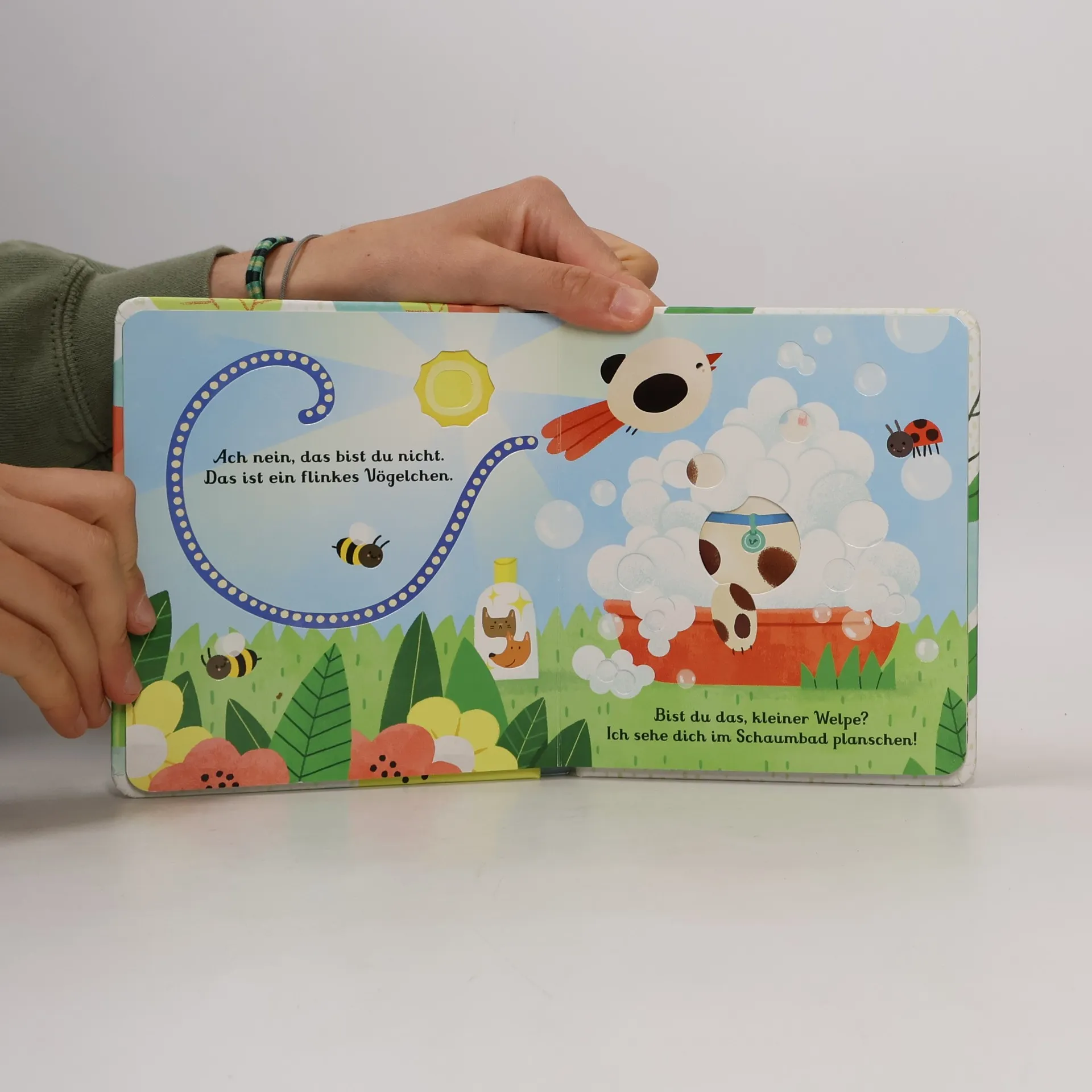 Der kleine Welpe versteckt sich! Kinder werden es lieben, durch die Löcher in diesem charmanten Buch zu spähen, um den schwer fassbaren Welpen zu finden. Während sie durch das Buch blättern, glauben sie, den Welpen entdeckt zu haben, nur um beim Umblättern festzustellen, dass es sich um etwas anderes handelt. Dieses Buch ist eine aufregende Ergänzung zu einer neuen Serie, die perfekt für Fans von „Das ist nicht mein...“ ist. Wunderschöne Illustrationen voller poetischer Details und überraschender Verwandlungen beim Umblättern. Teilweise gestanzte Texturen auf jeder Seite bieten viel zum Berühren und Entdecken, während man durch das Buch blättert.