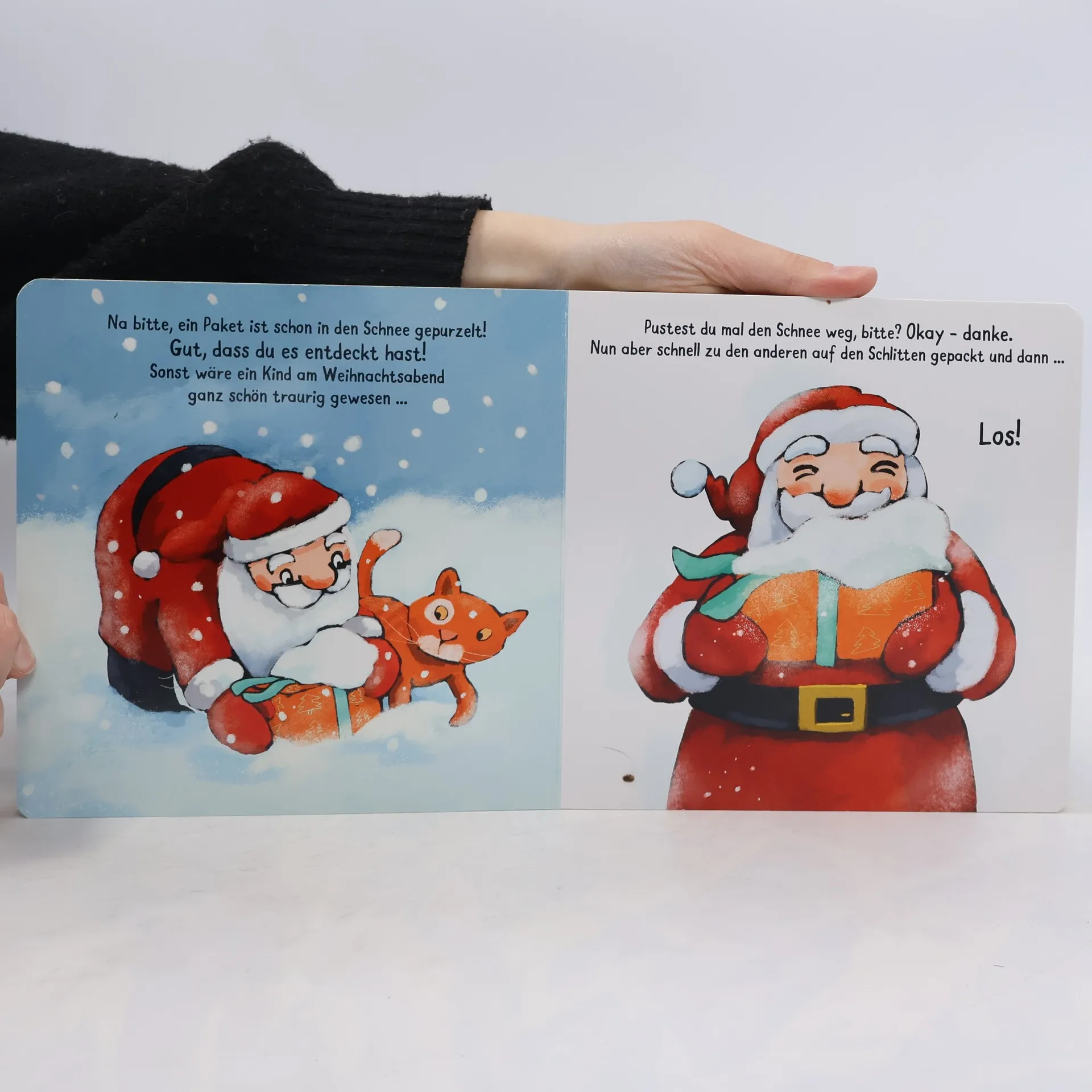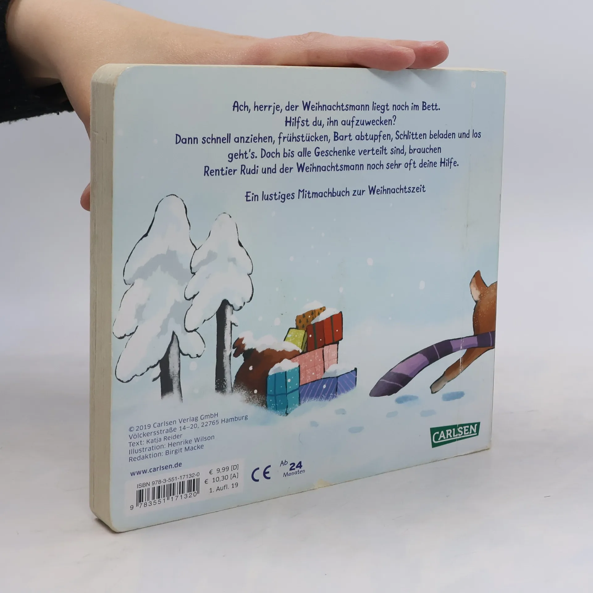 Ach, herjemine, der Weihnachtsmann liegt noch im Bett. Und nun heißt es für den kleinen Leser: Mithelfen. Zunächst einmal muss der Weihnachtsmann aufgeweckt werden. Dazu die Decke wegziehen. Dann schnell Hose, Stiefel und Jacke zum Anziehen reichen, beim Frühstück den bekleckerten Bart abtupfen und schließlich den Schlitten beladen. Endlich kann es losgehen! Doch bis alle Geschenke verteilt sind, brauchen Rentier Rudi und der Weihnachtsmann noch sehr oft die Hilfe des Lesers. Den umgestürzten Schneemann müssen sie wieder aufbauen und den kleinen Hund beruhigen. Und vor allem das orangefarbene Geschenk, das sollten alle stets im Auge behalten. Eine weihnachtliche Geschichte zum Mitmachen - ideal für Kinder ab 2 Jahren.