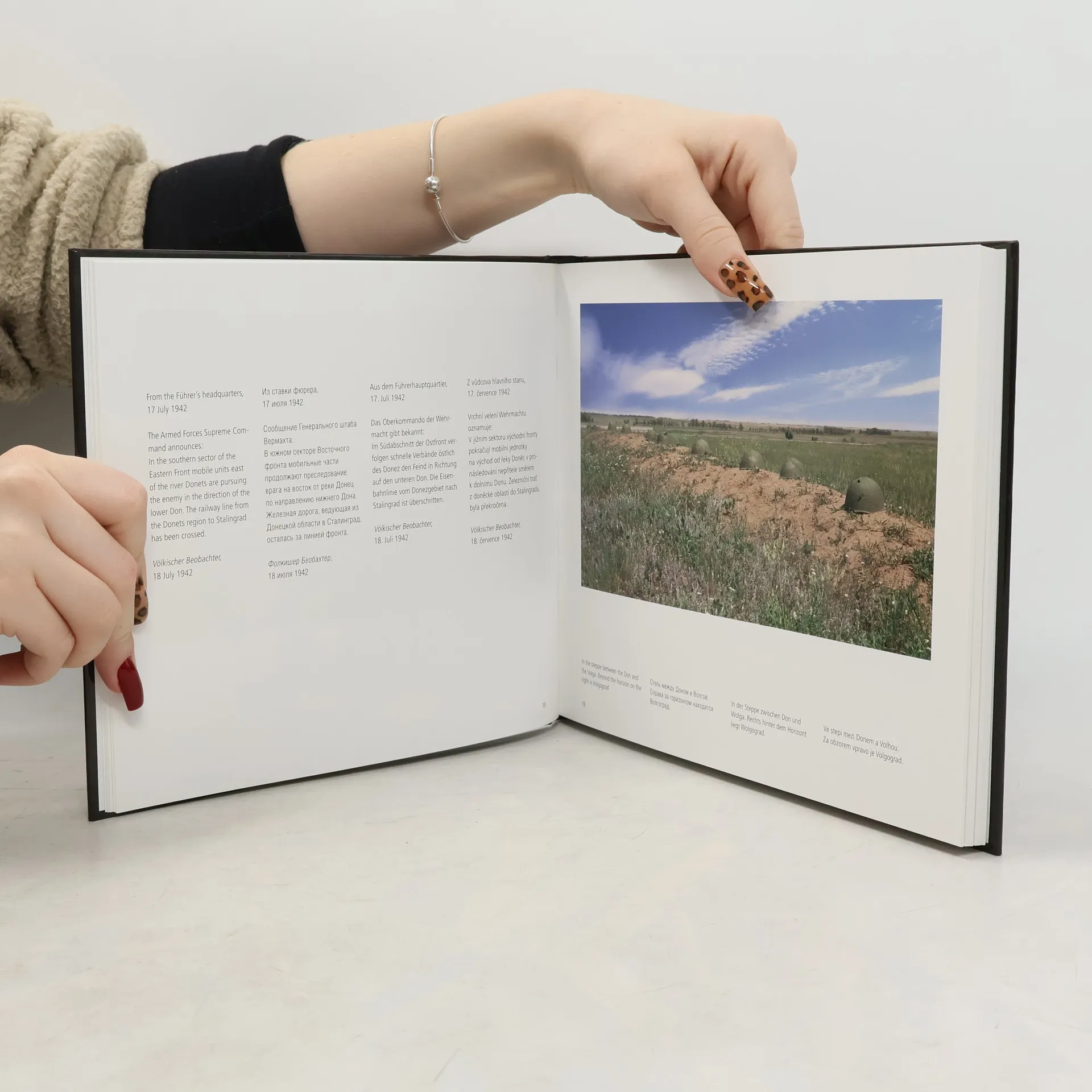 Texty stručně dokumentují průběh bitvy o Stalingrad, fotografie zobrazují dnešní podobu bojiště a města.