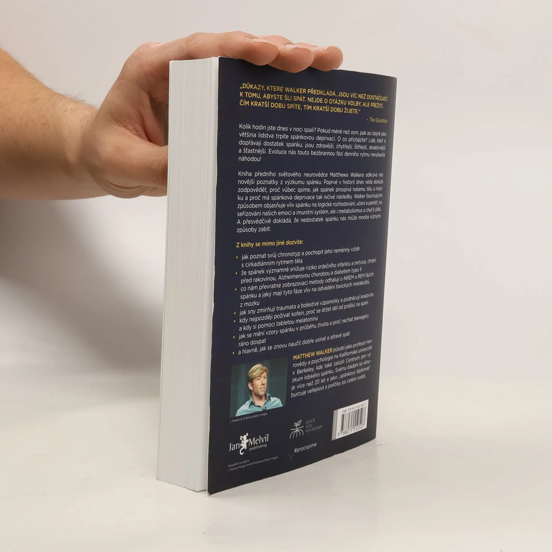 Co kdybyste zjistili, že elixír mládí, krásy, zdraví a dobré nálady spočívá v kvalitním spánku? Profesor neurologie a psychologie Matthew Walker z Berkeley prozkoumal tajemství spánku a jeho klíčový vliv na náš život. Klade otázku, proč příroda nutí všechny živočichy trávit tolik času v bezbranném stavu, a odpověď je jasná: spánek přináší nespočet evolučních výhod, které zajišťují naši existenci. Po přečtení této knihy se neodvážíte svůj spánek zanedbávat. Mnozí považují spánek za ztrátu času, přičemž média často podceňují jeho význam. Walker upozorňuje, že osm hodin spánku je pro většinu lidí minimem, a přibližně osmdesát procent populace žije ve spánkové deprivaci. Důkazy o negativních dopadech nedostatku spánku na jednotlivce i společnost jsou v knize shrnuty. Kvalitní spánek přináší výhody jako efektivní učení, logické myšlení a vyrovnání emocí. Podporuje imunitu, metabolismus a reguluje chuť k jídlu. Důležité jsou i sny, které zpracovávají emocionální zážitky a podporují kreativitu. Walker se také zabývá vlivem alkoholu a kofeinu na spánek, změnami spánkových rytmů v různých životních fázích a radami, jak zlepšit spánek a potlačit nespavost. Kniha apeluje na firmy a vlády, aby začaly spánek vnímat jako klíčový faktor zdraví a pracovního výkonu.