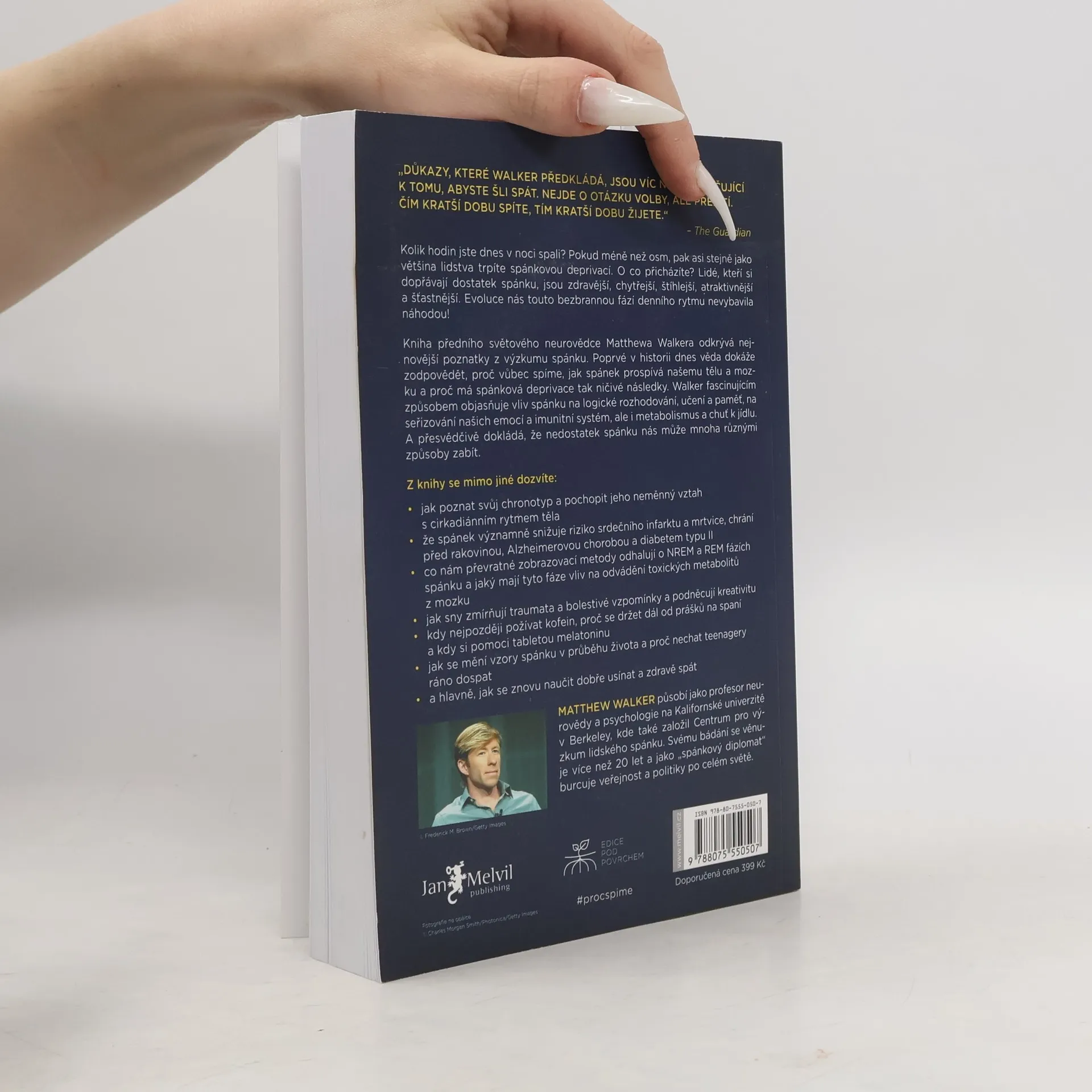 Co kdybyste zjistili, že elixír mládí, krásy, zdraví a dobré nálady spočívá v kvalitním spánku? Profesor neurologie a psychologie Matthew Walker z Berkeley prozkoumal tajemství spánku a jeho klíčový vliv na náš život. Klade otázku, proč příroda nutí všechny živočichy trávit tolik času v bezbranném stavu, a odpověď je jasná: spánek přináší nespočet evolučních výhod, které zajišťují naši existenci. Po přečtení této knihy se neodvážíte svůj spánek zanedbávat. Mnozí považují spánek za ztrátu času, přičemž média často podceňují jeho význam. Walker upozorňuje, že osm hodin spánku je pro většinu lidí minimem, a přibližně osmdesát procent populace žije ve spánkové deprivaci. Důkazy o negativních dopadech nedostatku spánku na jednotlivce i společnost jsou v knize shrnuty. Kvalitní spánek přináší výhody jako efektivní učení, logické myšlení a vyrovnání emocí. Podporuje imunitu, metabolismus a reguluje chuť k jídlu. Důležité jsou i sny, které zpracovávají emocionální zážitky a podporují kreativitu. Walker se také zabývá vlivem alkoholu a kofeinu na spánek, změnami spánkových rytmů v různých životních fázích a radami, jak zlepšit spánek a potlačit nespavost. Kniha apeluje na firmy a vlády, aby začaly spánek vnímat jako klíčový faktor zdraví a pracovního výkonu.