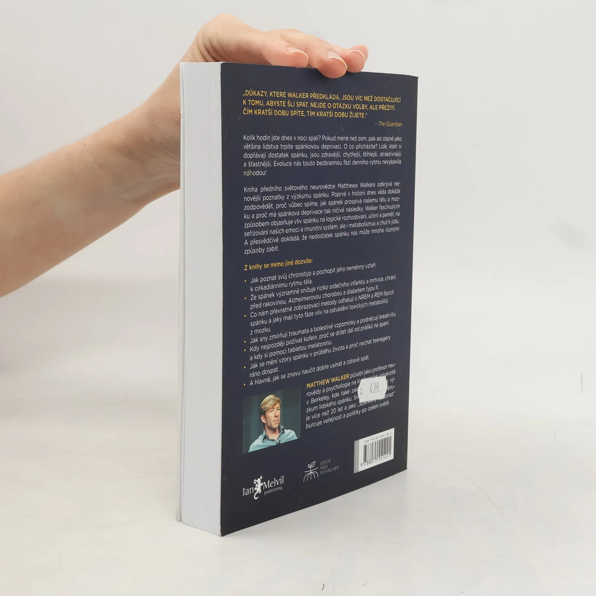 Kolik hodin jste dnes v noci spali? Pokud méně než osm, pak asi stejně jako většina lidstva trpíte spánkovou deprivací. O co přicházíte? Lidé, kteří si dopřávají dostatek spánku, jsou zdravější, chytřejší, štíhlejší, atraktivnější a šťastnější. Evoluce nás touto bezbrannou fází denního rytmu nevybavila náhodou! Kniha předního světového neurovědce Matthewa Walkera odkrývá nejnovější poznatky z výzkumu spánku. Poprvé v historii dnes věda dokáže zodpovědět, proč vůbec spíme, jak spánek prospívá našemu tělu a mozku a proč má spánková deprivace tak ničivé následky. Walker fascinujícím způsobem objasňuje vliv spánku na logické rozhodování, učení a paměť, na seřizování našich emocí a imunitní systém, ale i metabolismus a chuť k jídlu. A přesvědčivě dokládá, že nedostatek spánku nás může mnoha různými způsoby zabít.