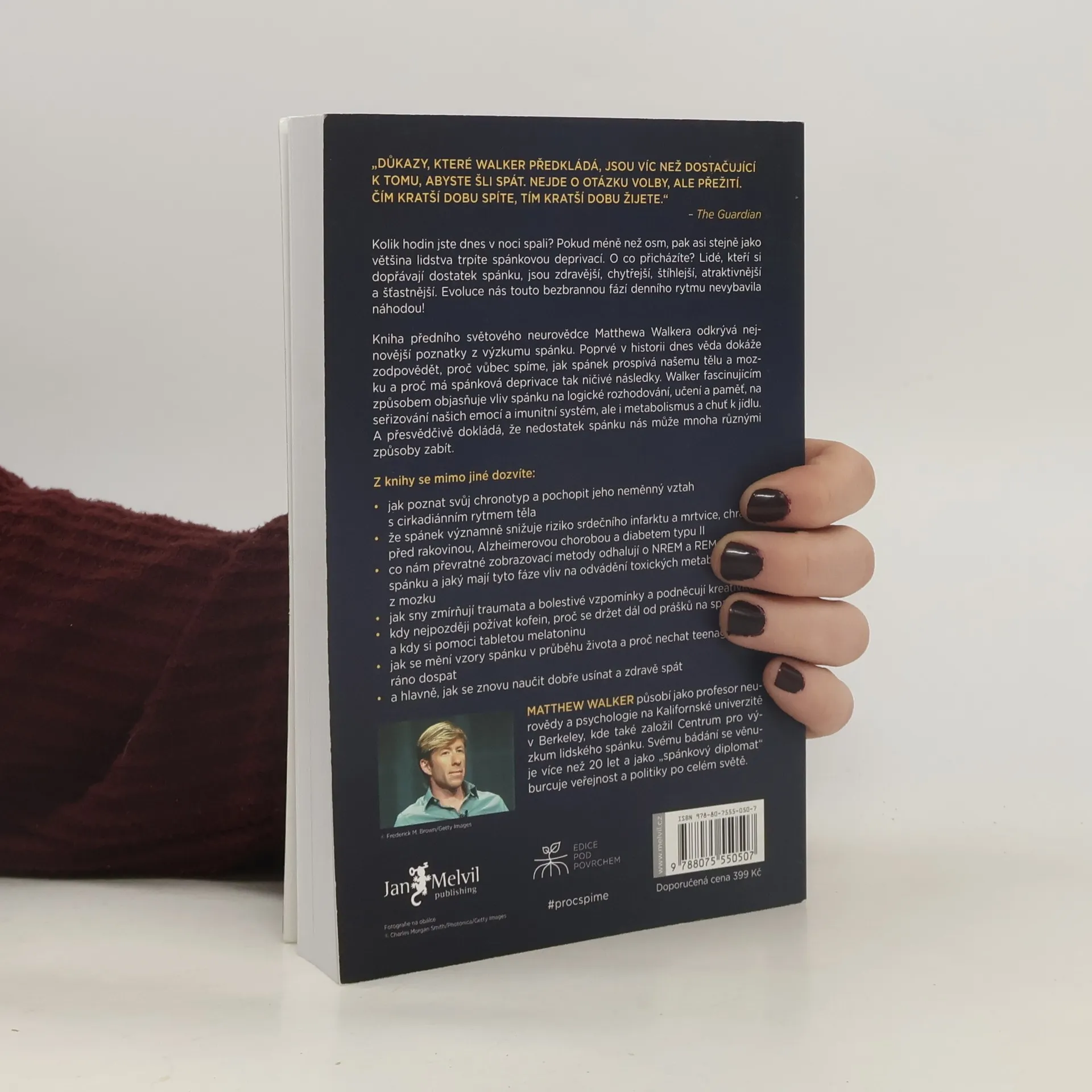 Co kdybyste zjistili, že elixír mládí, krásy, zdraví a dobré nálady spočívá v kvalitním spánku? Profesor neurologie a psychologie Matthew Walker z Berkeley prozkoumal tajemství spánku a jeho klíčový vliv na náš život. Klade otázku, proč příroda nutí všechny živočichy trávit tolik času v bezbranném stavu, a odpověď je jasná: spánek přináší nespočet evolučních výhod, které zajišťují naši existenci. Po přečtení této knihy se neodvážíte svůj spánek zanedbávat. Mnozí považují spánek za ztrátu času, přičemž média často podceňují jeho význam. Walker upozorňuje, že osm hodin spánku je pro většinu lidí minimem, a přibližně osmdesát procent populace žije ve spánkové deprivaci. Důkazy o negativních dopadech nedostatku spánku na jednotlivce i společnost jsou v knize shrnuty. Kvalitní spánek přináší výhody jako efektivní učení, logické myšlení a vyrovnání emocí. Podporuje imunitu, metabolismus a reguluje chuť k jídlu. Důležité jsou i sny, které zpracovávají emocionální zážitky a podporují kreativitu. Walker se také zabývá vlivem alkoholu a kofeinu na spánek, změnami spánkových rytmů v různých životních fázích a radami, jak zlepšit spánek a potlačit nespavost. Kniha apeluje na firmy a vlády, aby začaly spánek vnímat jako klíčový faktor zdraví a pracovního výkonu.