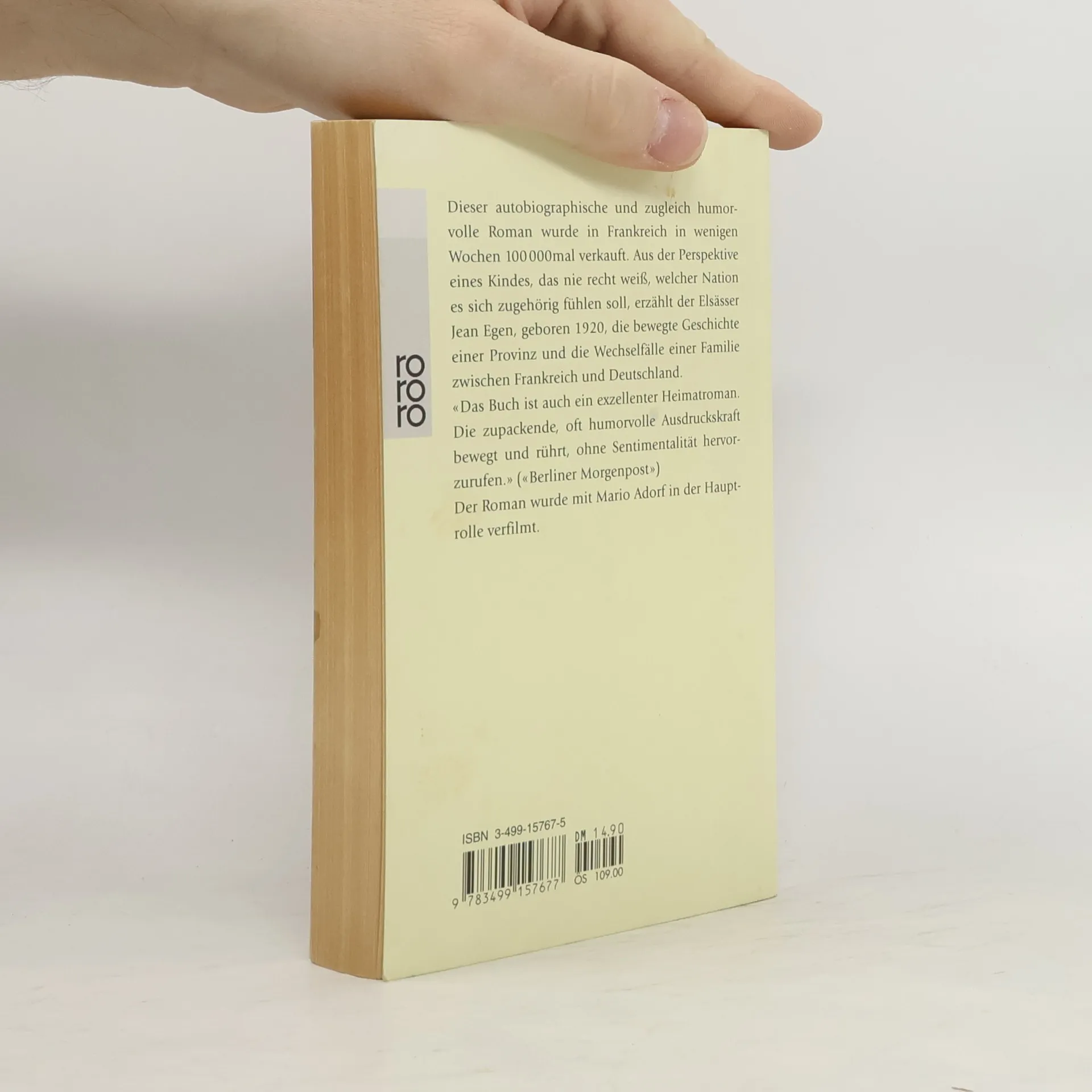 Dieser autobiographische und zugleich humorvolle Roman wurde in Frankreich in wenigen Wochen 100000mal verkauft. Aus der Perspektive eines Kindes, das nie recht weiß, welcher Nation es sich zugehörig fühlen soll, erzählt der Elsässer Jean Egen, geboren 1920, die bewegte Geschichte einer Provinz und die Wechselfälle einer Familie zwischen Frankreich und Deutschland. Der Roman wurde mit Mario Adorf in der Hauptrolle verfilmt.