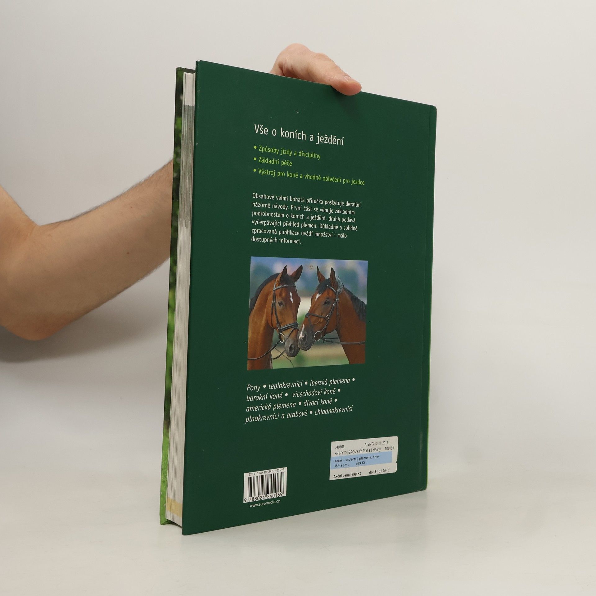 Obsahově velmi bohatá publikace. Všeobecným údajům o koních jsou věnovány první dvě kapitoly, dalších sedm se týká ježdění a zbytek plemen. Návody na různé typy jezdeckého sportu jsou neobyčejně podrobné, názorné a odpovídají evropským pravidlům. Plemena jsou seřazena do tradičních skupin – ponyové, teplokrevníci, španělští koně, barokní, klusáci a mimochodníci, americká plemena, přírodní plemena, plnokrevníci a chladnokrevníci. Velice důkladně a solidně zpracovaná publikace obsahuje množství i málo dostupných informací. Zdroj: http://www.bux.cz