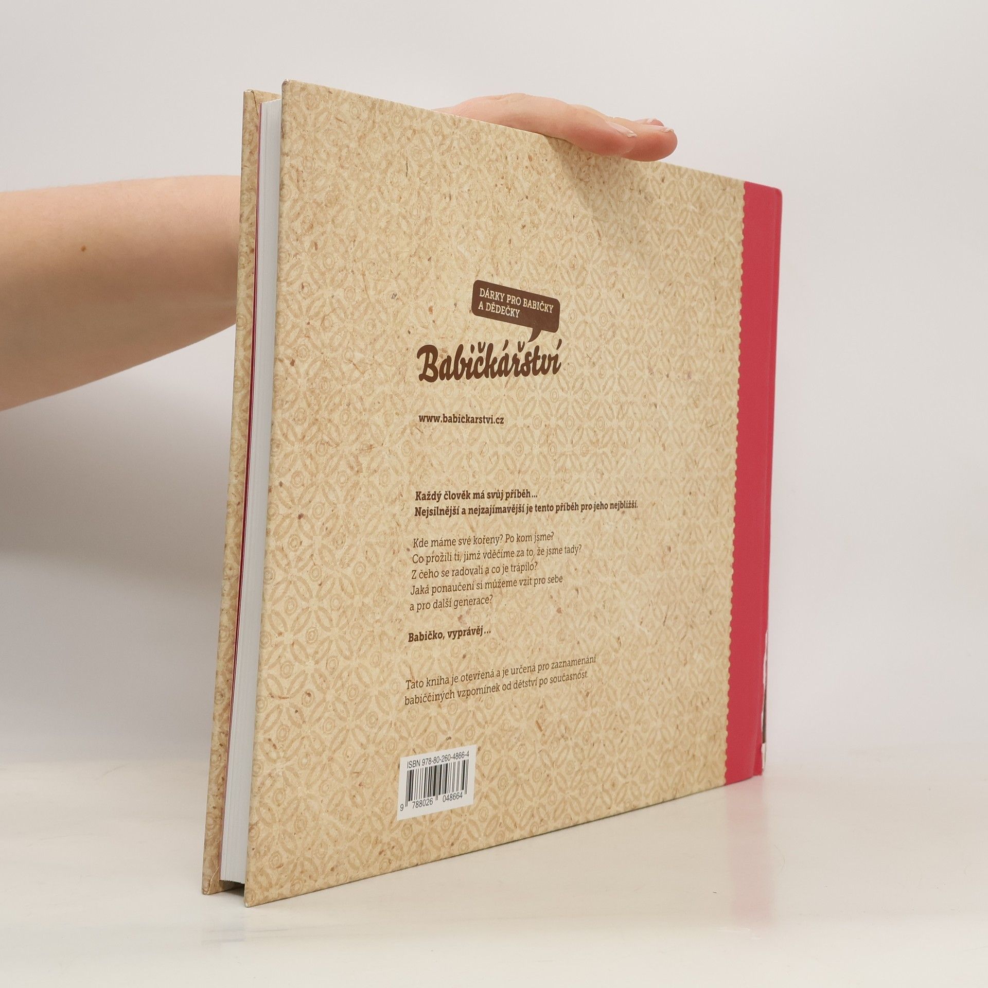 Otevřená kniha pro zaznamenání vzpomínek vaší babičky od dětství po současnost. Babička bude moci sama nebo s vaší pomocí vyplňovat knížku a odpoví tak na celou řadu pečlivě vybraných otázek. Namátkou: čím chtěla být, když byla malá, jací byli její rodiče a prarodiče, kde si hrála, kdy potkala dědečka – svého muže, co spolu zažili, jak vnímala babička historické události, co se podle ní dnes změnilo oproti době jejího mládí… Kniha se stane pro vaší babičku zábavou a pro celou vaši rodinu cenným pokladem. Doprovodné obrázky a dobové fotografie pomáhají probouzet vzpomínky. V knížce je prostor na přidání vlastních fotografií. „Babičko, vyprávěj“ je unikátním dárkem pro všechny babičky.