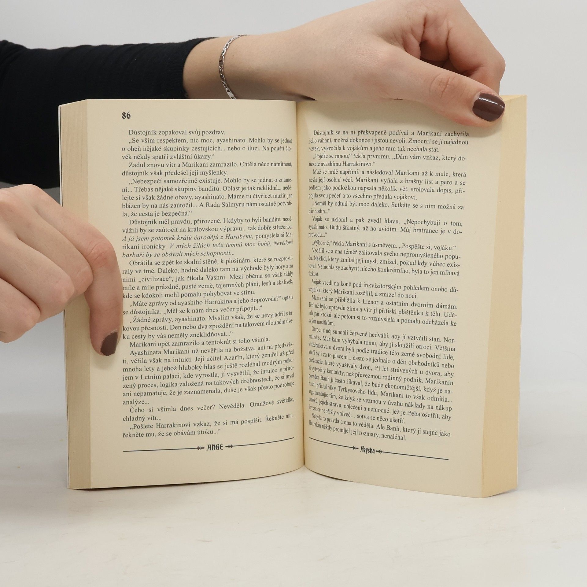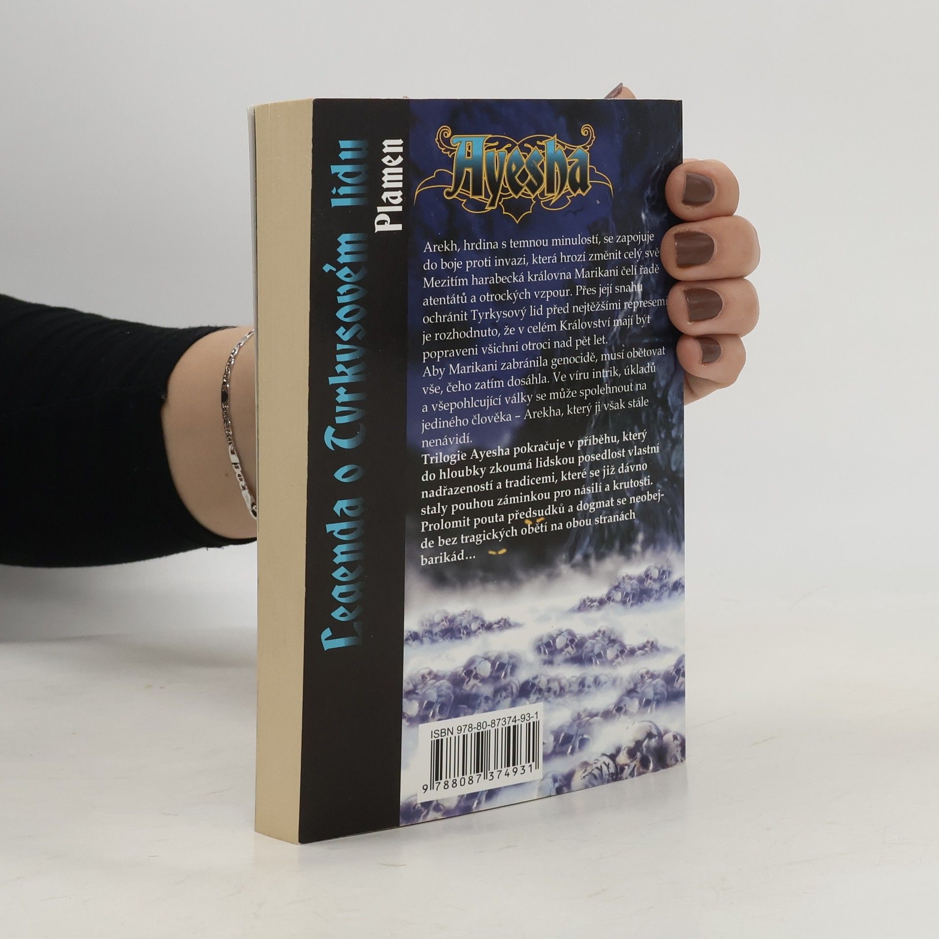 Ayesha Plamen je druhý díl trilogie Legenda o Tyrkysovém lidu, která vypráví příběh o krutém boji s nepřáteli lidskými i nelidskými, zejména však o boji proti krutým tradicím, které neváhají celé národy uvrhnout na tisíciletí do otroctví. Kniha je společným dílem autorů píšících pod pseudonymem Ange (Anne Guéro a Gérard Guéro). Příběh Marikani, následnice trůnu v království Harabeku, pokračuje. Tentokrát se Marikani stala královnou Harabeku, avšak Arekhovi (průvodce a ochránce na pouti nepřátelským územím, kterého Marikani zachránila z potápějící se galéry) se zhroutil svět. V Harabeku je potlačena vzpoura otroků, ze severozápadu Merinidové a příšerná stvoření z Propastných hlubin napadají teritorium. Země a lidé jsou vtaženi do víru událostí, budoucnost vypadá hrozivě. Avšak je tu mystická postava Ayesha, o které si Tyrkysový lid šeptá.