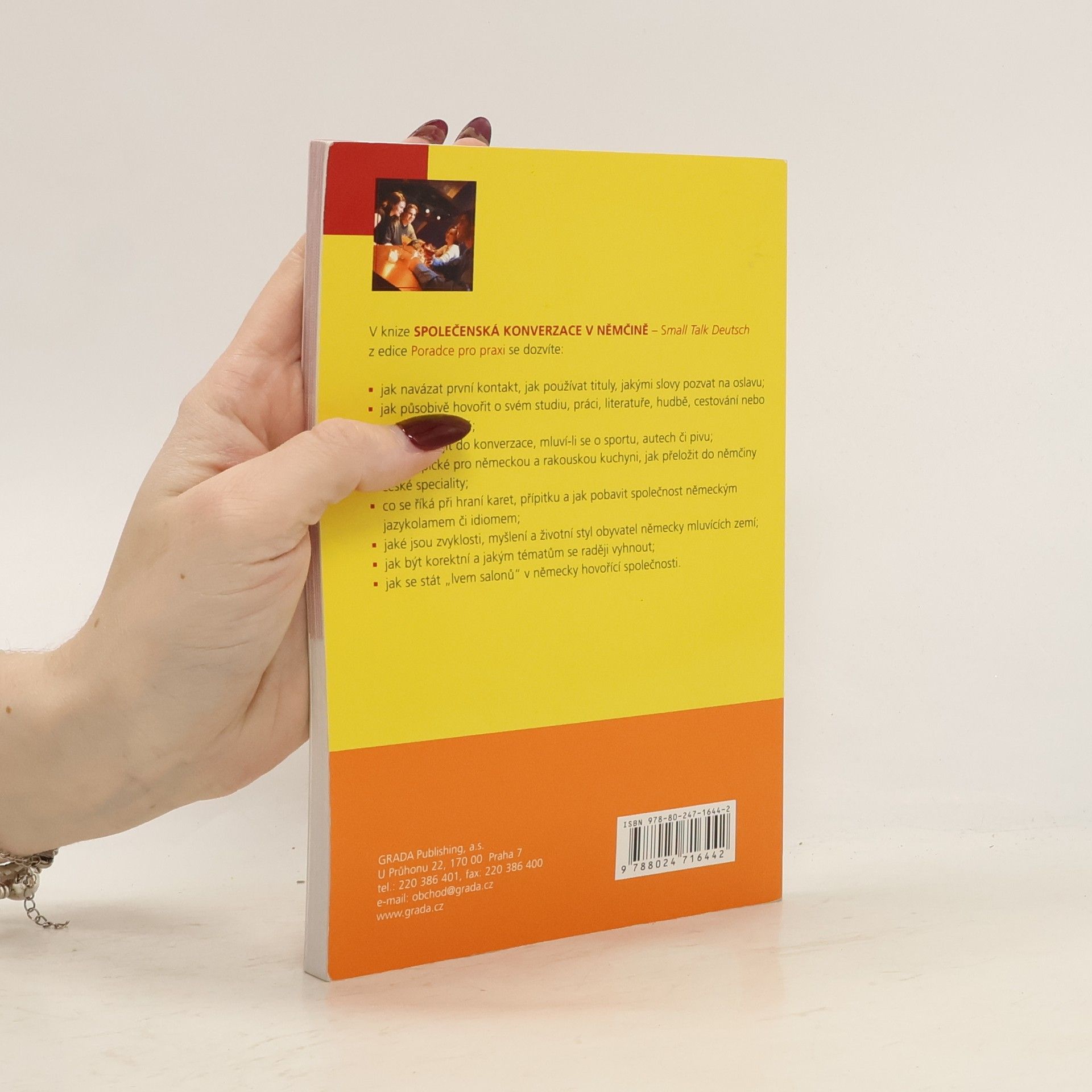 Jak přirozeně německy konverzovat na nejrůznější společenská témata? Jak úspěšně zvládnout první kontakty v soukromém životě a v práci? Jak hovořit o své rodině, vztazích, studiu či zaměstnání? Jak konverzovat při jídle? Jak sdělovat, kde a jak bydlíme, či že si upravujeme byt? Jak hovořit na témata film, literatura, hudba, televize či politika? Jak konverzovat o dovolené, cestování, sportech či automobilech? Jak hovořit o zvířatech, květinách či zahradě? Jak popisovat jiné osoby, jejich vzhled či vlastnosti? Jak vhodně vyjádřit souhlas a nesouhlas, námitku nebo údiv, radost či prosbu? Jaké jsou zvláštnosti německé, rakouské a české kuchyně a jak o nich hovořit? V knížce najdete spoustu vzorových frází a doporučení k těmto a dalším zajímavým tématům, kulturní a jazykové tipy, návody a rady, jak se stát vyhledávaným společníkem. Kniha je určena manažerům, obchodníkům, asistentkám a studentům a všem, kteří potřebují či chtějí přirozeně komunikovat v německém jazyce.