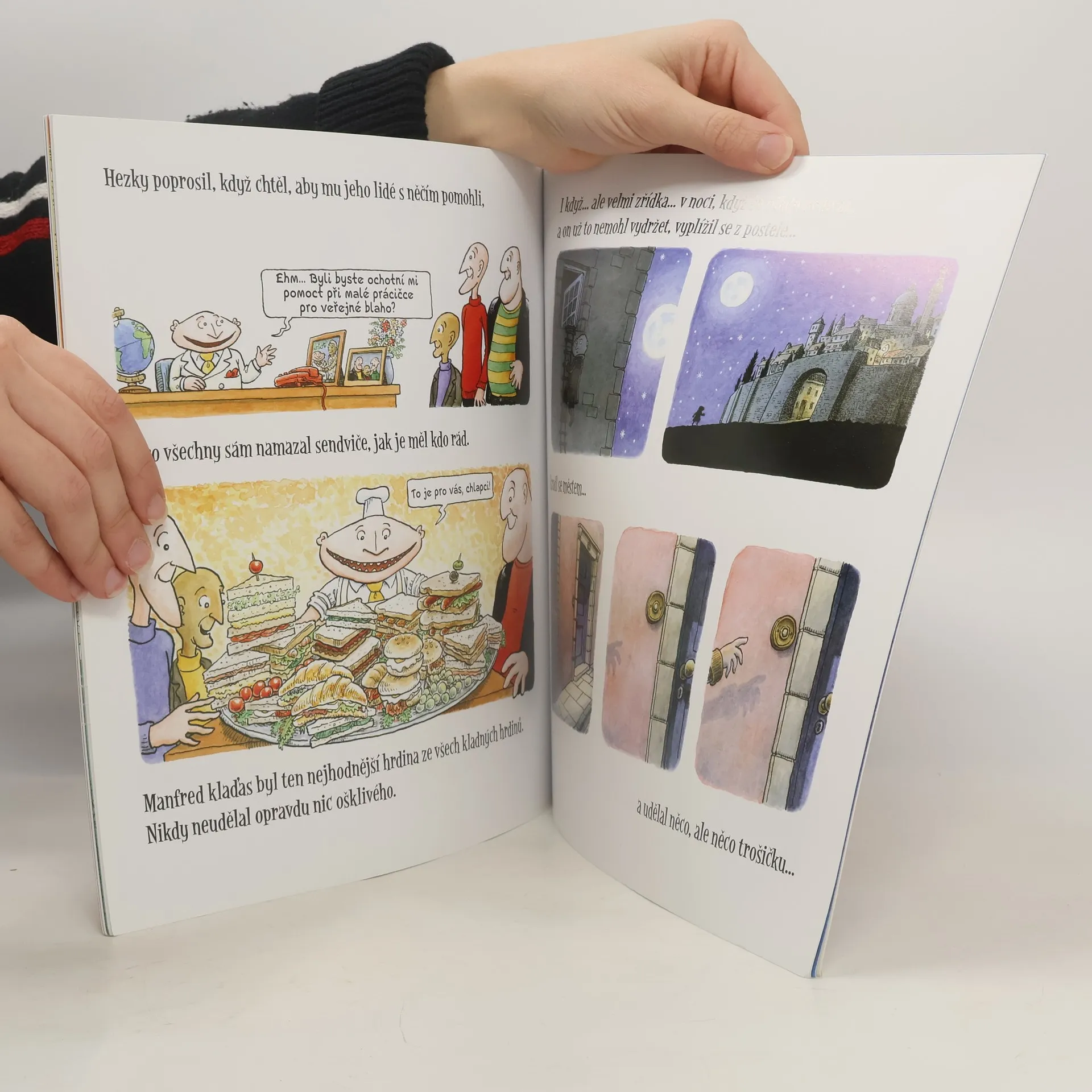 Kreslený příběh o zločinci Manfredovi, který unášel vynálezce a nutil je vymýšlet přístroje, které mu pomáhaly loupit obrazy, peníze. Ke všem svým lidem se choval špatně a tak když onemocněl, nikdo se o něj nestaral a naopak měli pré ... a jak to s nejhrůznějším padouchem všech dob dopadlo, se můžete dozvědět v komiksu s moc pěknými ilustracemi. (danit)