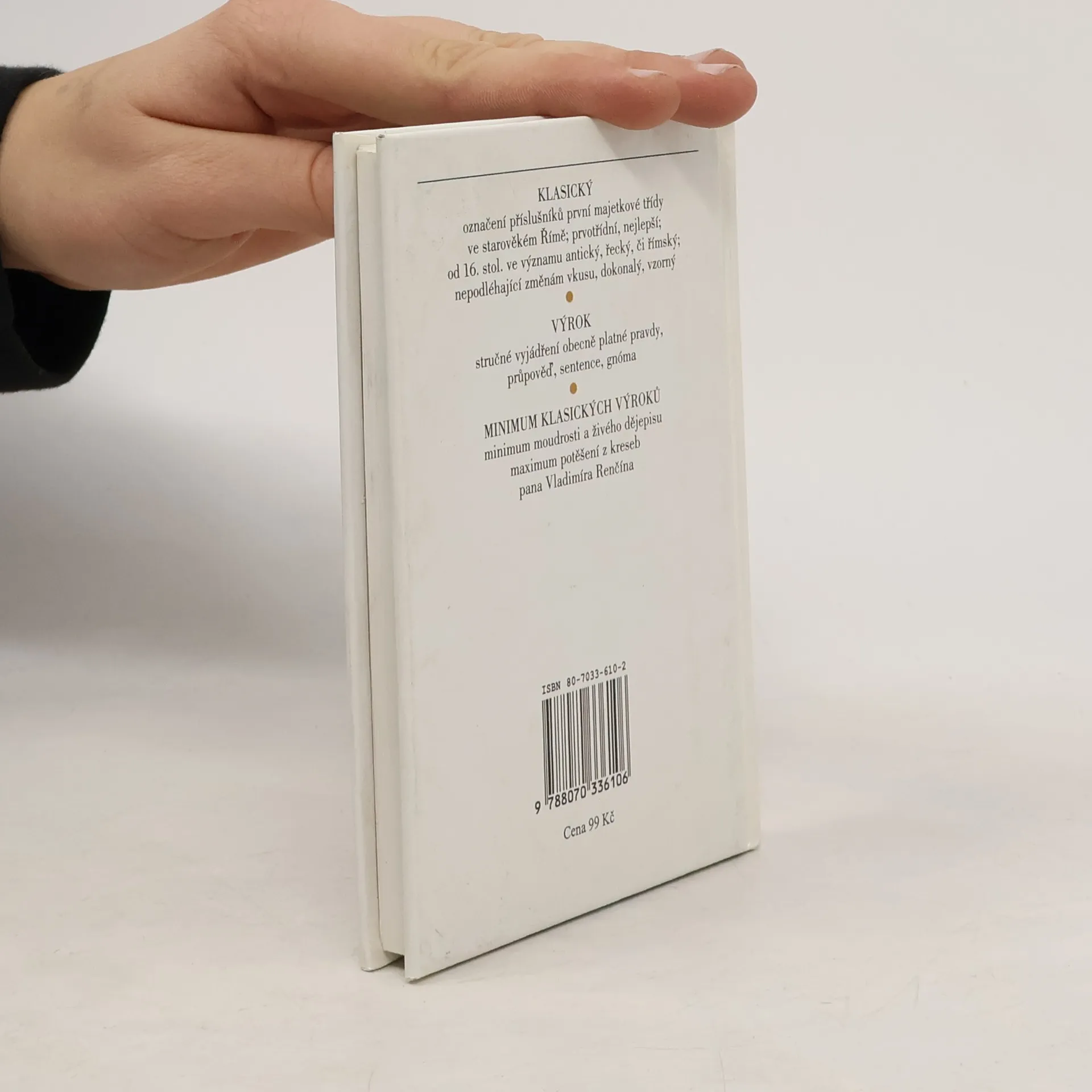 Sbírka klasických výroků slavných osobností s ilustracemi Vladimíra Renčína. Výroky jsou součastí textu odvíjejícího se chronologicky podle historických událostí a toho, jak citovaní klasikové přicházeli na svět.