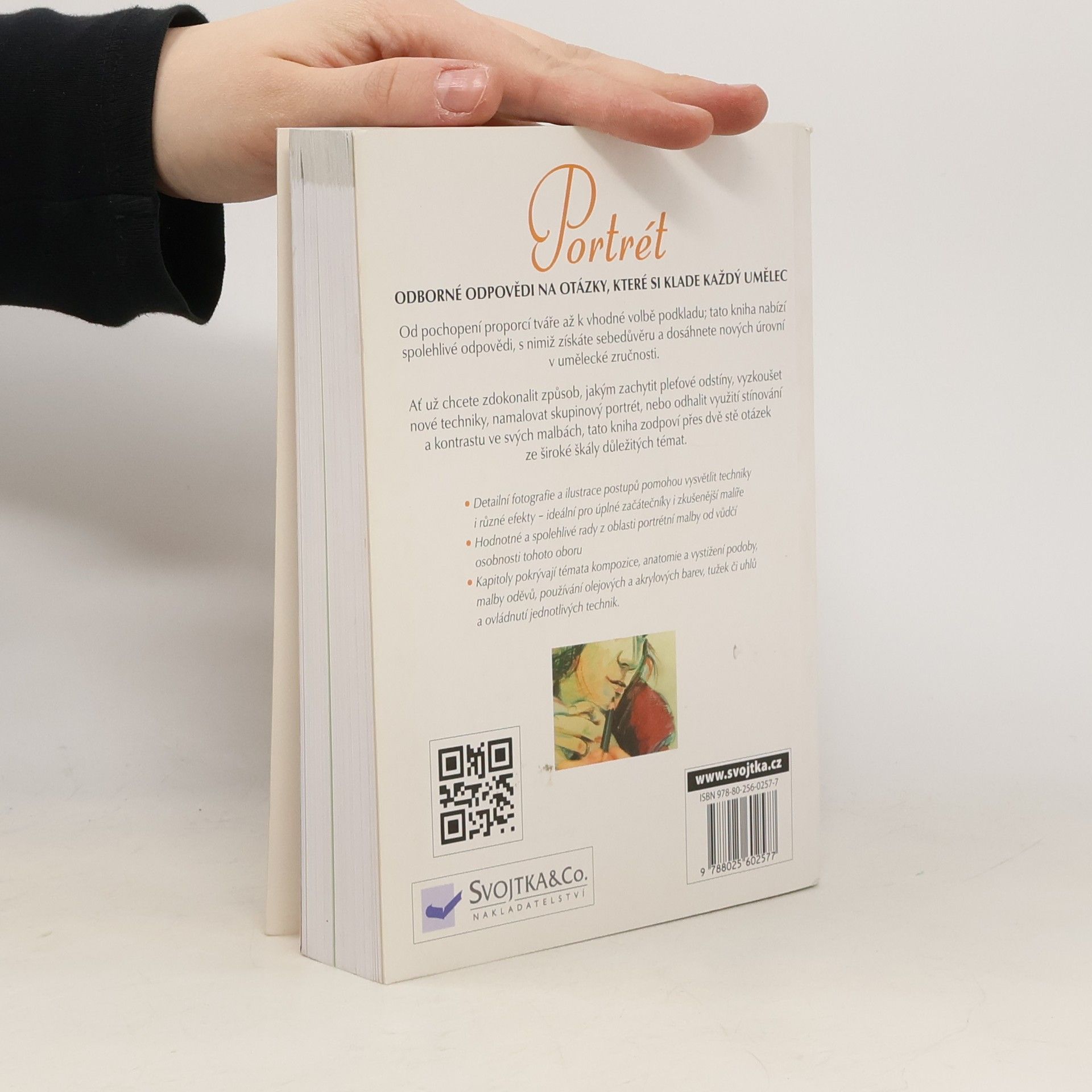 Tato kniha je ideálním pomocníkem jak pro začátečníky, tak pro zkušenější malíře. Ať už budete chtít lépe pochopit proporce tváře, zvolit vhodný podklad, zdokonalit způsob, jakým zachytíte odstíny pleti, vyzkoušet si nové techniky, namalovat skupinový portrét nebo odhalit využití stínování a kontrastu ve svých malbách – v této příručce naleznete potřebné odborné informace a odpovědi na více než 200 nejčastějších otázek, které se týkají široké škály témat portrétní malby, jako jsou kompozice, anatomie, vystižení podoby, malby oděvů, používání olejových a akrylových barev, tužek či uhlu a ovládnutí jednotlivých technik i různých efektů. K tomu, abyste vše dokonale zvládli, vám napomohou i detailní fotografie a ilustrace jednotlivých postupu znázorněné metodou krok za krokem. Získejte tedy sebedůvěru a dosáhnete vyšší umělecké úrovně v oblasti portrétní malby!