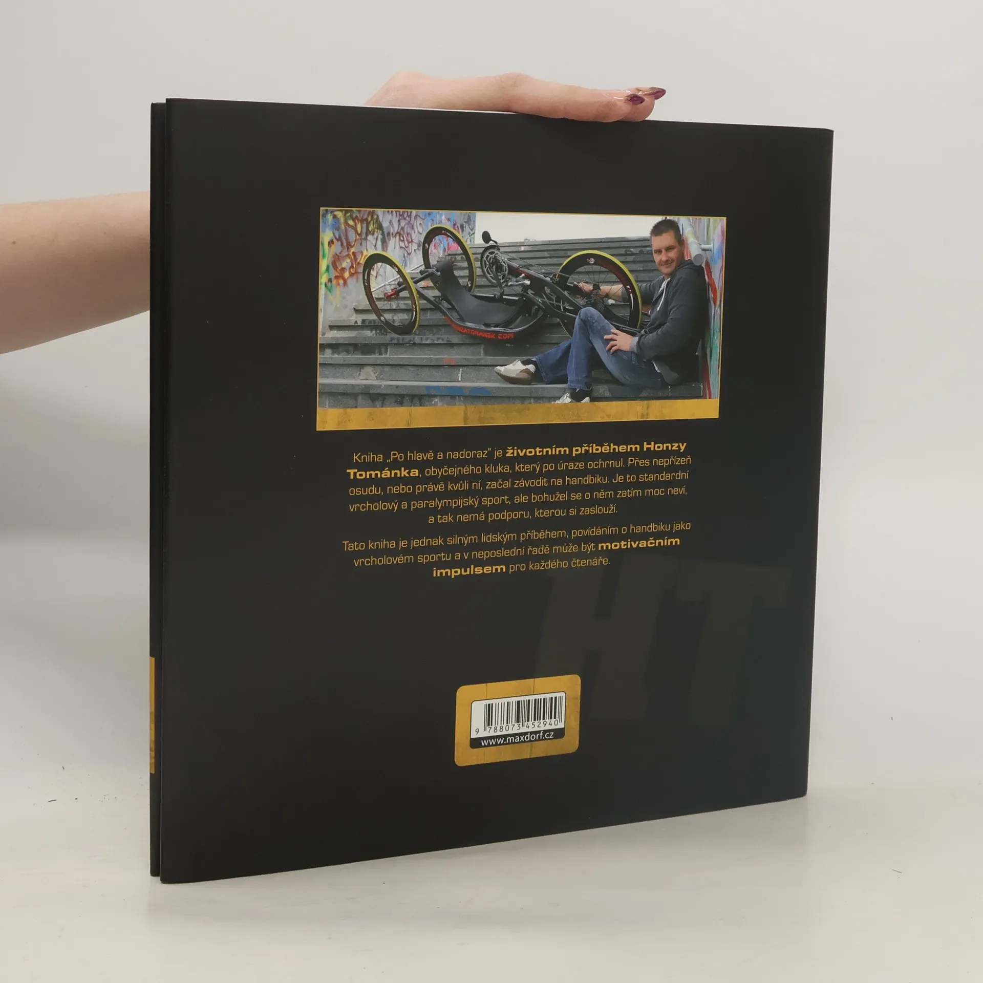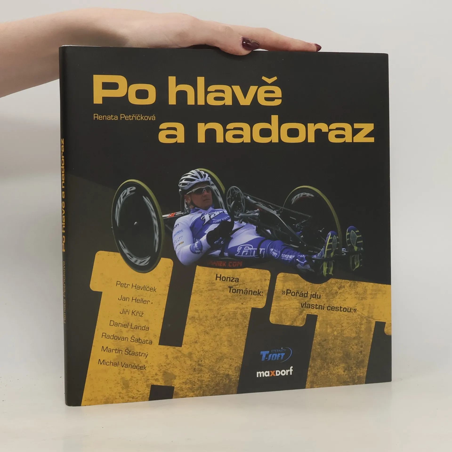 Kniha Po hlavě nadoraz je životním příběhem Honzy Tománka, obyčejného kluka, který po úraze ochrnul. Přes nepřízeň osudu, nebo právě kvůli ní, začal závodit na handbiku. Je to standardní vrcholový a paralympijský sport, ale bohužel se o něm zatím moc neví a tak nemá podporu, kterou si zaslouží. Tato kniha je jednak silným lidským příběhem, povídáním o handbiku jako vrcholovém sportu a v neposlední řadě může být motivačním impulsem pro každého čtenáře. Honza Tománek (1987, Příbram) je úspěšným reprezentantem České republiky v handcyclingu a držitelem několika mistrovských titulů. Součástí jeho života je však i množství jiných sportovních aktivit jako je monoski, cross country sledge nebo tenis a squash. Mimo to studuje Vysokou školu tělesné výchovy a sportu Palestra s. r. o. v Praze a zároveň přednáší studentům základních, středních i vysokých škol o problematice sportu handicapovaných. Vlastní firmu na distribuci ráfkových kol, kterou dále rozvíjí a pracuje na vývoji vlastního prototypu handbiku. V rámci vlastní seberealizace se aktivně podílí na sportovních marketingových činnostech souvisejících s jeho závodní kariérou. Je také hlavním iniciátorem a spoluzakladatelem týmu FANY cycling team, pod jehož barvami závodí v sezóně 2012/2013. Jakýkoli handicap je dle jeho názoru jen tak velký, jaký ho cítíme.
