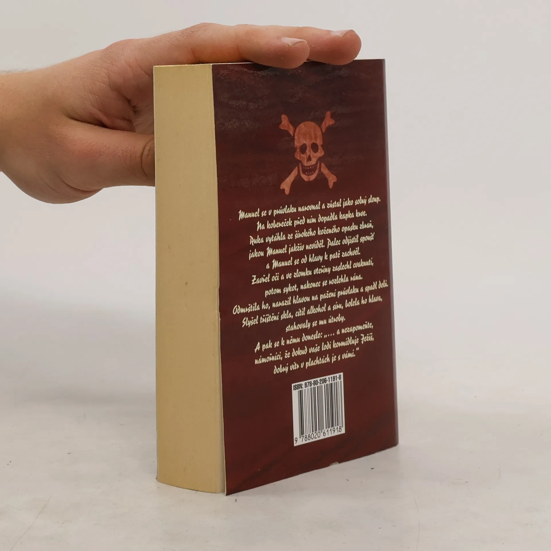 Manuel se v průvlaku narovnal a zůstal jako solný sloup. Na kobereček před ním dopadla kapka krve. Ruka vytáhla ze širokého koženého opasku zbraň jakou jakživ neviděl. Palec odjistil spoušť a Manuel se od hlavy k patě zachvěl. Zavřel oči a ve zlomku vteřiny zaslechl cvaknutí, potom sykot, nakonec se rozlehla rána. Odmrštila ho, narazil hlavou na pažení průvlaku a spadl dolů. Slyšel tříštění skla, cítil alkohol a síru, bolela ho hlava, stahovaly se mu útroby... Napínavý román z dílny autora Čelistí Petera Benchleye. Peter Benchley se nyní věnuje literatuře zaměřené na piráty a bukanýry. Ve svých knihách však zachovává věrnost historické skutečnosti.