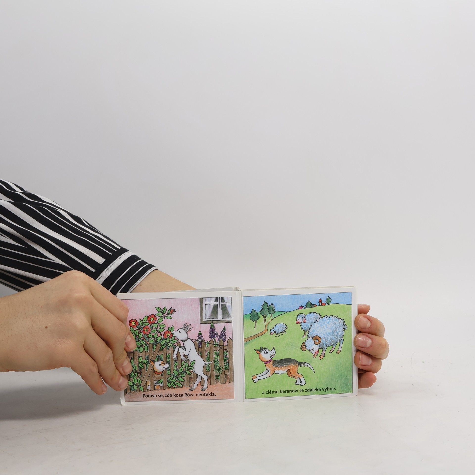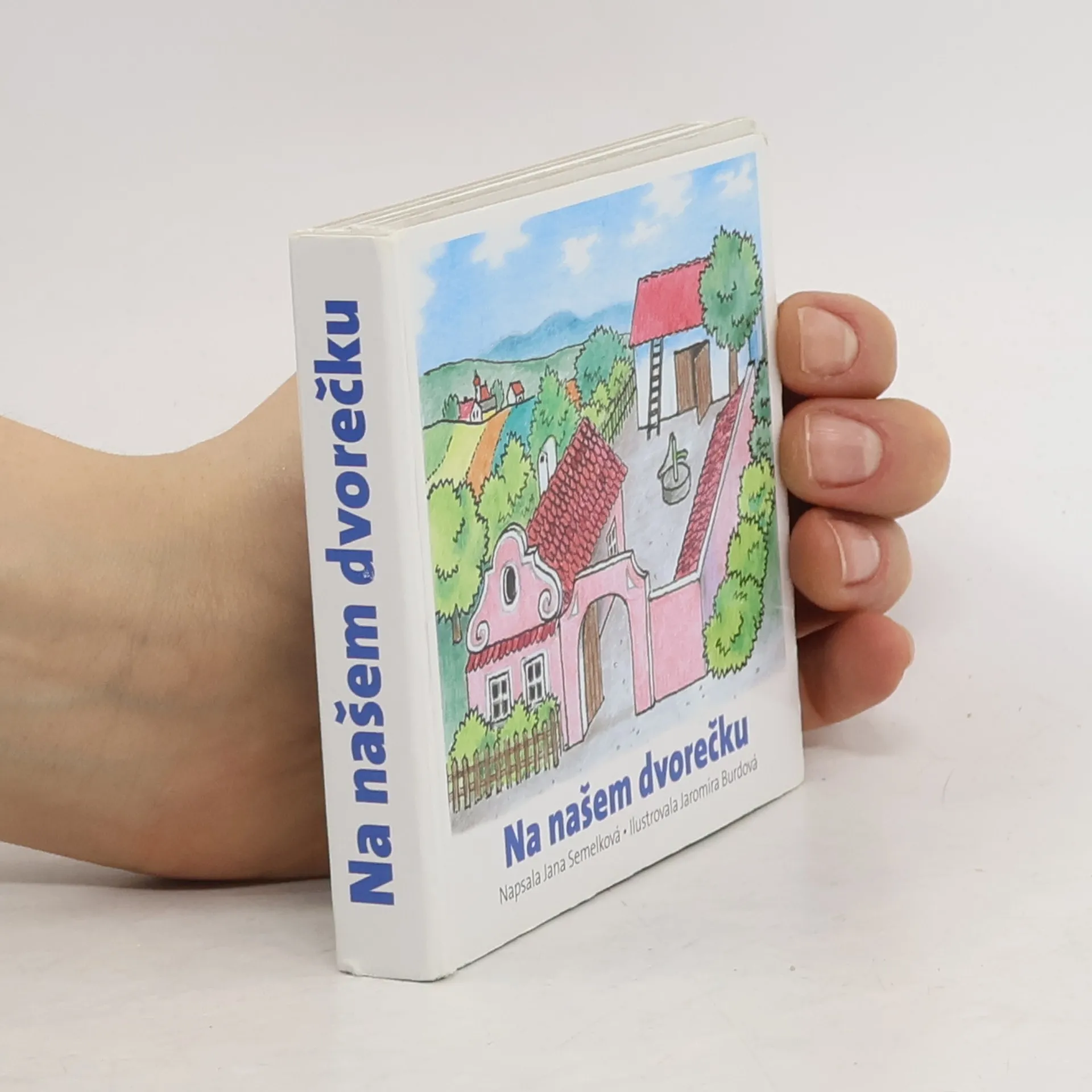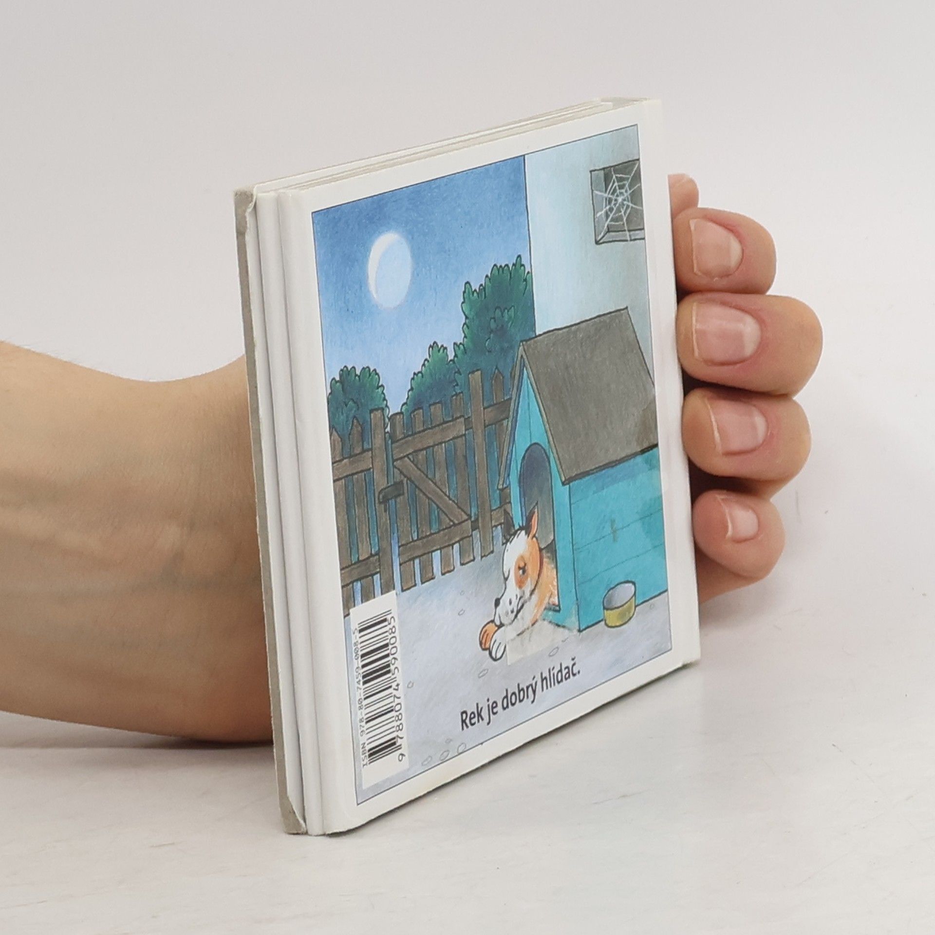 Klasické dětské rozkládací leporelo z pevného kartónu. Jednoduché říkanky o pejskovi a jeho setkání se zvířátky na dvorku.
