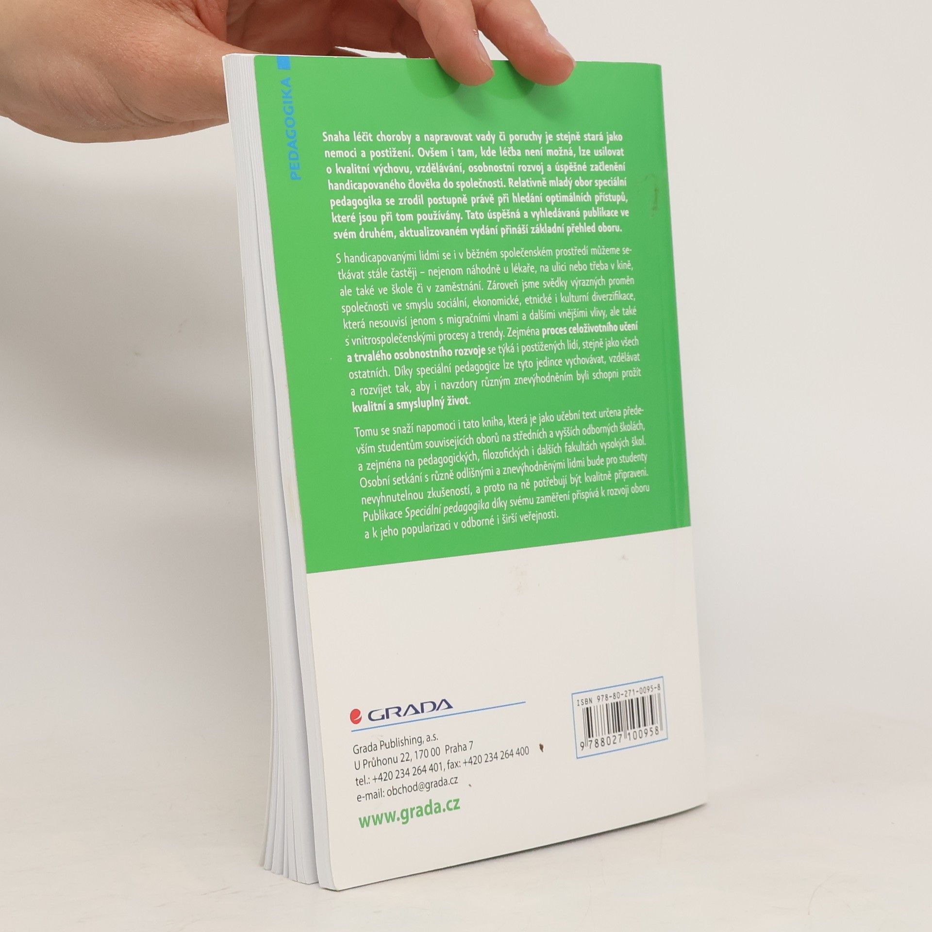 Snaha léčit choroby a napravovat vady či poruchy je stejně stará jako nemoci a postižení. Ovšem i tam, kde léčba není možná, lze usilovat o kvalitní výchovu, vzdělávání, osobnostní rozvoj a začlenění handicapovaného člověka do společnosti. Tato úspěšná publikace přináší základní přehled o oboru speciální pedagogika.