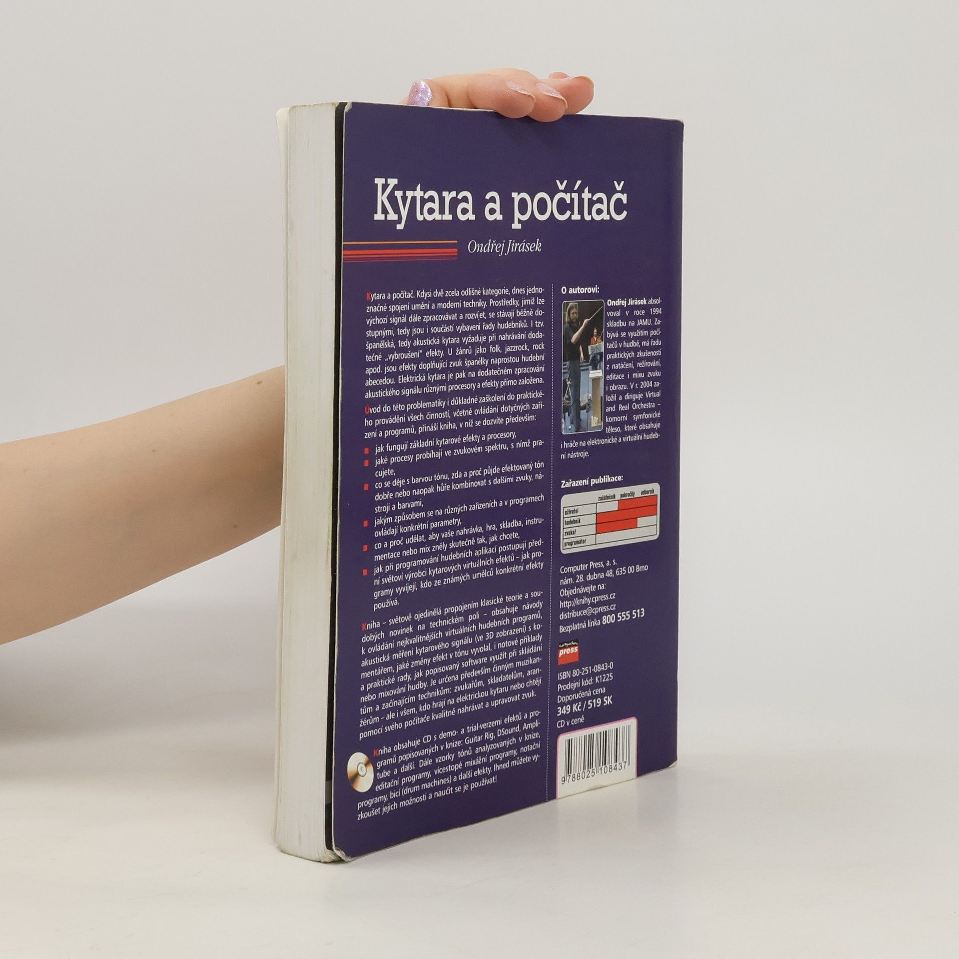 Kytara a počítač dnes představují spojení umění a moderní techniky. Prostředky pro zpracování signálu se stávají běžně dostupnými a jsou součástí vybavení mnoha hudebníků. Akustická kytara vyžaduje při nahrávání dodatečné efekty, které jsou v žánrech jako folk, jazzrock či rock nezbytné. Elektrická kytara je na zpracování akustického signálu různými procesory a efekty přímo založena. Kniha nabízí úvod do problematiky a praktické školení v ovládání zařízení a programů. Dozvíte se, jak fungují kytarové efekty a procesory, jaké procesy probíhají ve zvukovém spektru, a jak ovlivňují barvu tónu. Zjistíte, jak správně kombinovat efektované tóny s dalšími zvuky a jak ovládat parametry v různých zařízeních. Kniha obsahuje návody k ovládání kvalitních virtuálních hudebních programů, akustická měření kytarového signálu a praktické rady pro skládání a mixování hudby. Je určena muzikantům a začínajícím technikům, kteří chtějí kvalitně nahrávat a upravovat zvuk. Autor Ondřej Jirásek, absolvent JAMU, má bohaté zkušenosti v oblasti zvuku a hudební technologie.