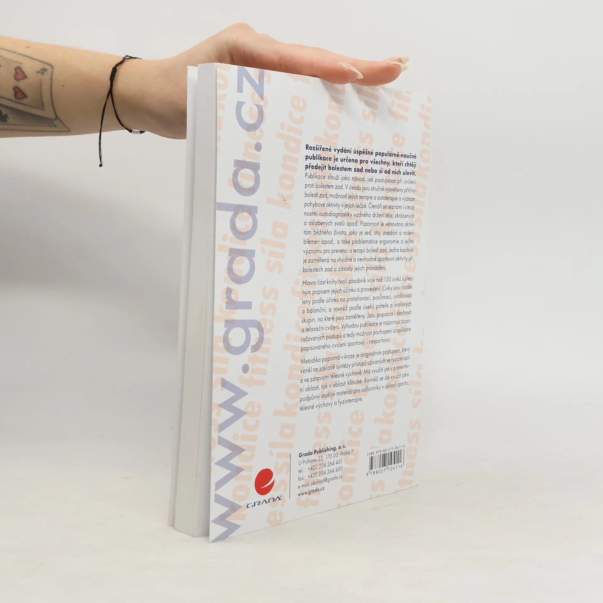 V úvodu knihy jsou stručně vysvětleny příčiny bolestí zad, možnosti jejich terapie a autoterapie a význam pohybové aktivity v jejich léčbě. Čtenáři se seznámí i s možnostmi autodiagnostiky vadného držení těla, zkrácených a oslabených svalů apod. Pozornost je věnována aktivitám běžného života, jako je sed, stoj, zvedání a nošení břemen apod., a také problematice ergonomie a jejího významu pro prevenci a terapii bolestí zad. Jedna kapitola je zaměřená na vhodné a nevhodné sportovní aktivity při bolestech zad a zásady jejich provádění. Hlavní část knihy tvoří zásobník více než 150 cviků s přesným popisem jejich účinku a provedení. Cviky jsou rozděleny podle účinku na protahovací, posilovací, uvolňovací a balanční, a rovněž podle úseků páteře a svalových skupin, na které jsou zaměřeny. Jsou popsána i dechová a relaxační cvičení. Výhodou publikace je názornost doporučovaných postupů a tedy možnost pochopení a aplikace popisovaného cvičení sportovci i nesportovci. Má využití jak v preventivní oblasti, tak v oblasti klinické. Rovněž se dá využít jako podpůrný studijní materiál pro odborníky v oblasti sportu, tělesné výchovy a fyzioterapie.